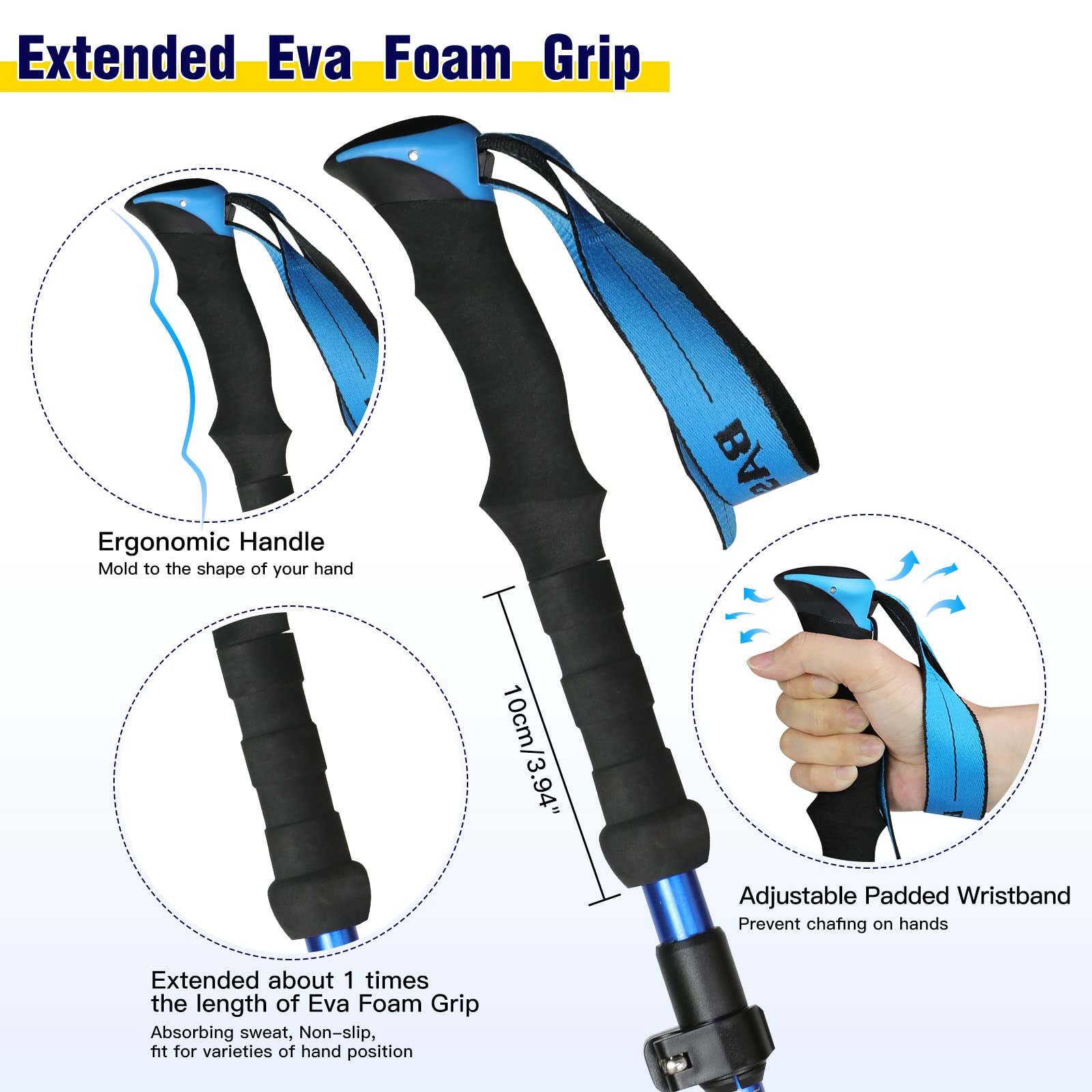 "【Ergonomic extended Eva foam handle & adjustable wrist strap】 The EVA foam handle of the hiking pole has been extended by 2.75 inches, allowing for different hand positions, absorbing sweat and keeping your hands cool and dry, also helping you handle switchbacks and abrupt terrain changes easily.",