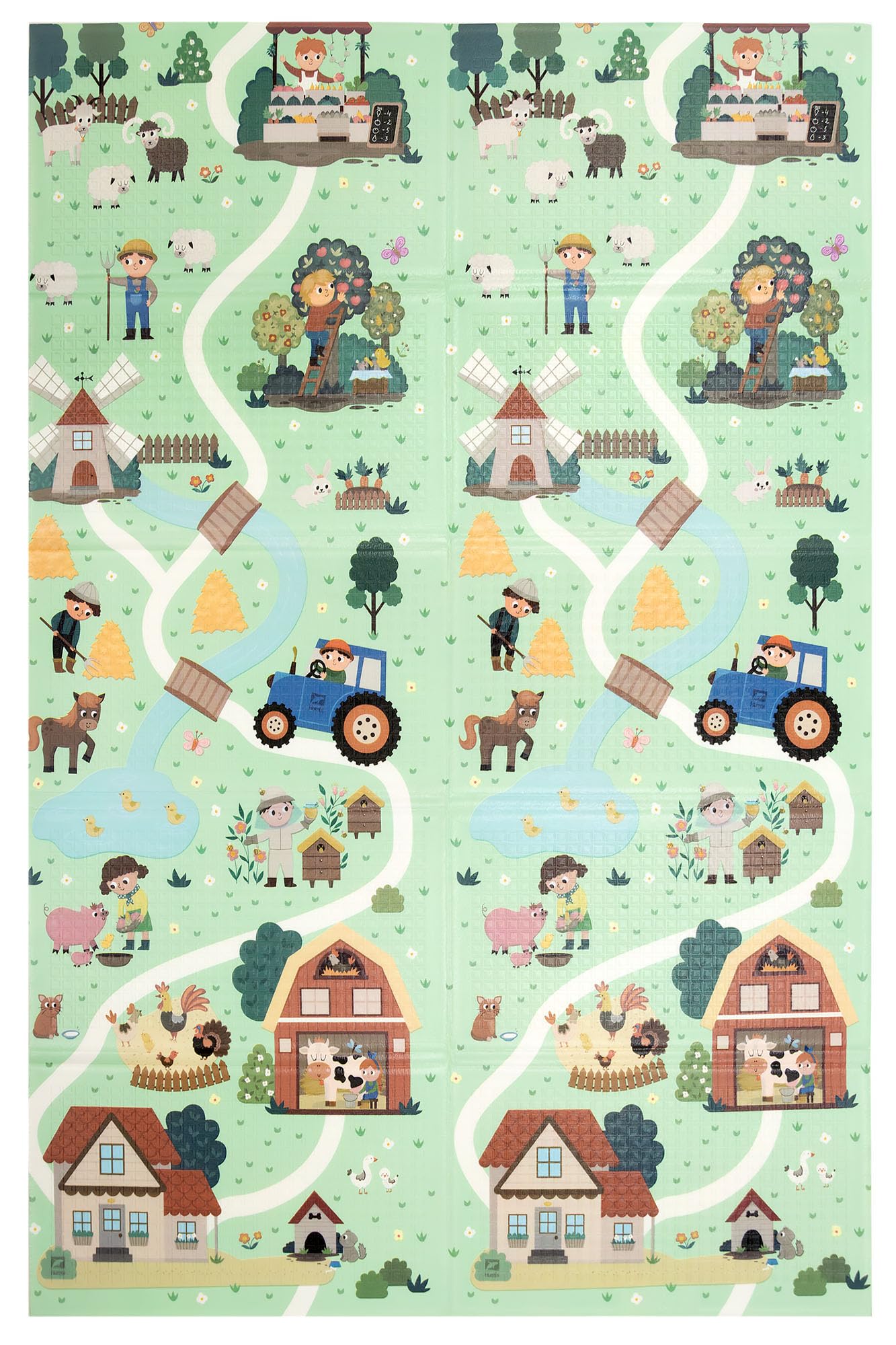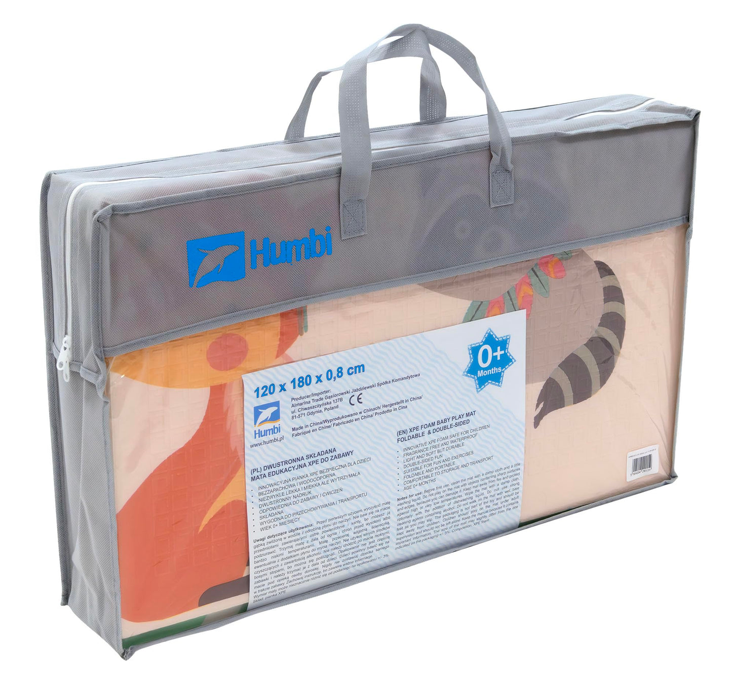 ["Mat dimensions: 47.2 x 70.9 x 0.8 inches This unique, large, and soft foam mat provides comfort and safety for your baby to play and crawl. You can use the mat in your child's room, living room, or garden. Suitable for babies and children from the first days of life.","Comfortable and functional: lightweight, foldable, double-sided, easy to store and transport - including bag, easy to clean, waterproof.","Top quality: High-quality material: odorless, non-toxic XPE foam, thick and sturdy - excellent insulation against cold, soft and flexible - excellent protection against falls.","2in1 - the mat is double-sided Each side is decorated with a different, educationally valuable graphic that supports the child in every phase of development, from the first days of life. The attractive colors of the mat make it an aesthetic decorative element in any setting. One side features a graphic of animals in the forest. The other side of the mat shows a graphic depicting life in the countryside, with animal pens and a rural landscape.","MAT PARAMETERS: Brand: Humbi; Unfolded mat dimensions: 47.2 x 70.9 inches; Thickness: 0.8 inches; Material: XPE foam; Age: 0m+; Safety: European CE certificate; Free of formamide, phthalates, PVC, Bisphenol A (BPA); Compliance with standards: EN71-1, EN71-2, EN71-3, REACH; Bag with handles: Yes; Foldable: Yes; Waterproof: Yes; Double-sided: Yes;"]