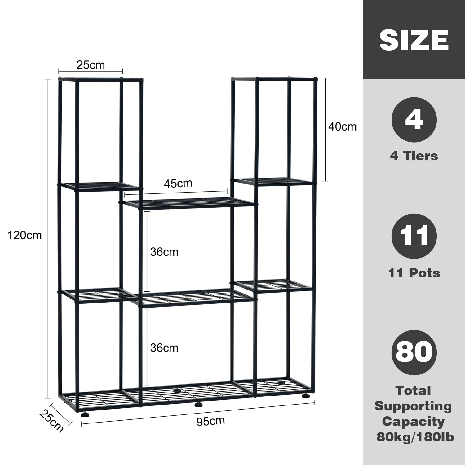 ["【4 Tiers 11 Pots Flower Stand】 The flower stand with 4 levels, including 11 shelves that can hold 11 to 14 potted plants. Dimensions: 95 (L) x 25 (W) x 120 (H) cm. With the open design, your plants can enjoy full sun and are easily accessible for watering and care.",