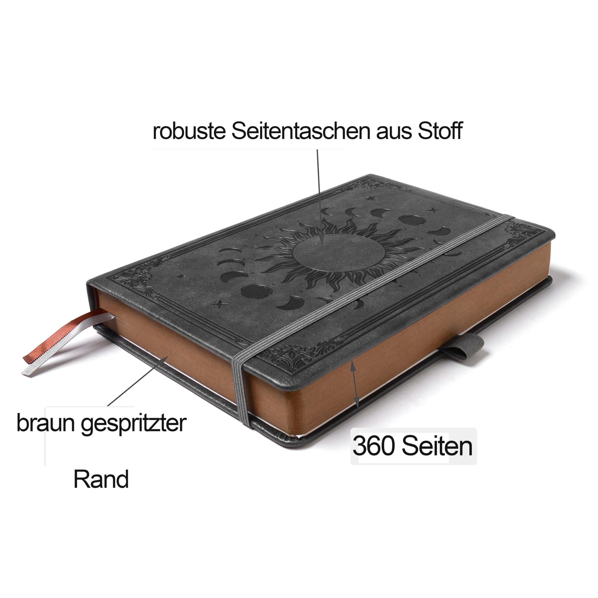 HwxBen Journal notebook for women and men, 360 pages leather hardcover in vintage sun & moon design, dark gray, 19.6 x 25.4 cm.