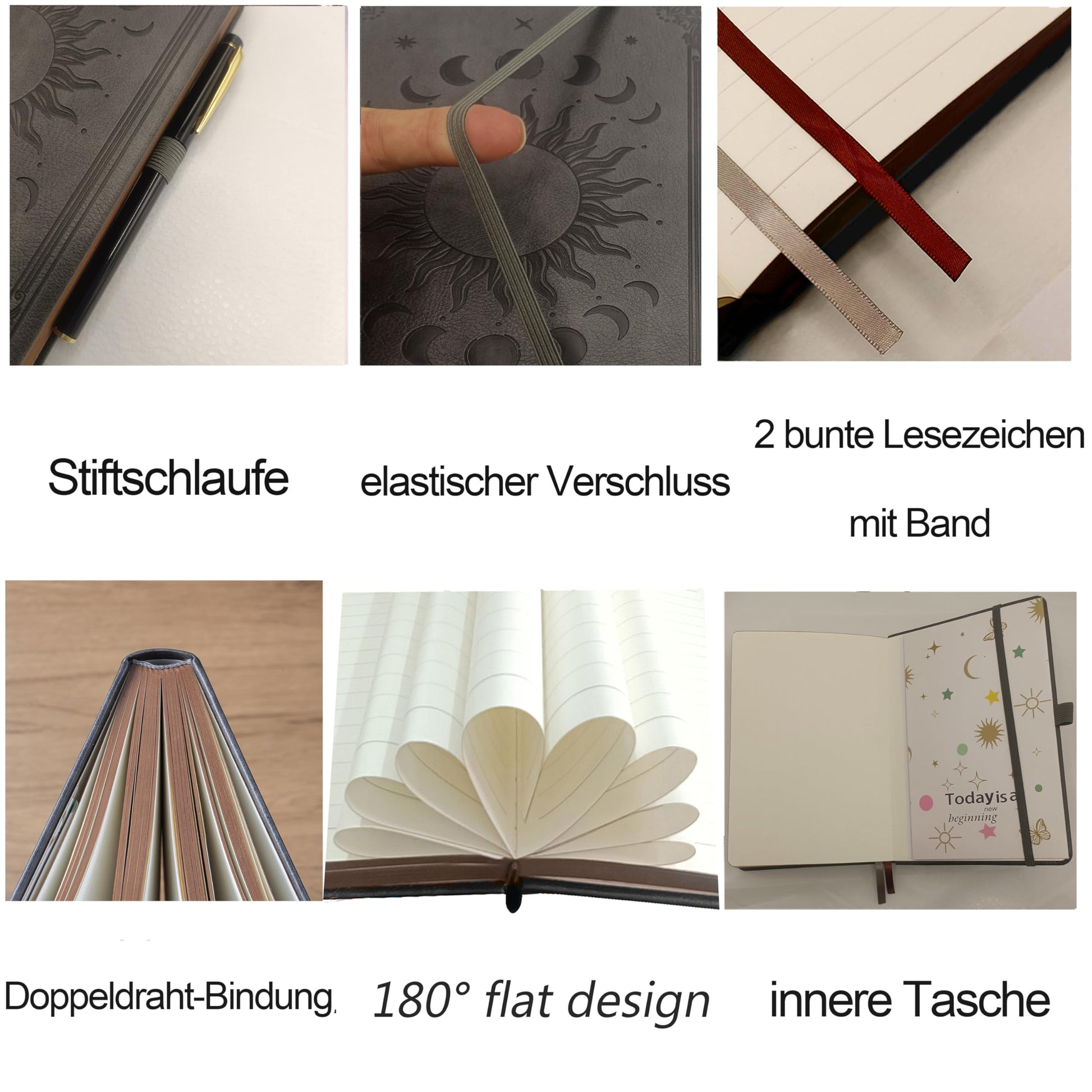"Lined journal - Professional features: Enhance your journaling experience with professional features such as two exquisite ribbon bookmarks, an elastic pen holder, and an inner pocket for seamless content navigation and organization.",