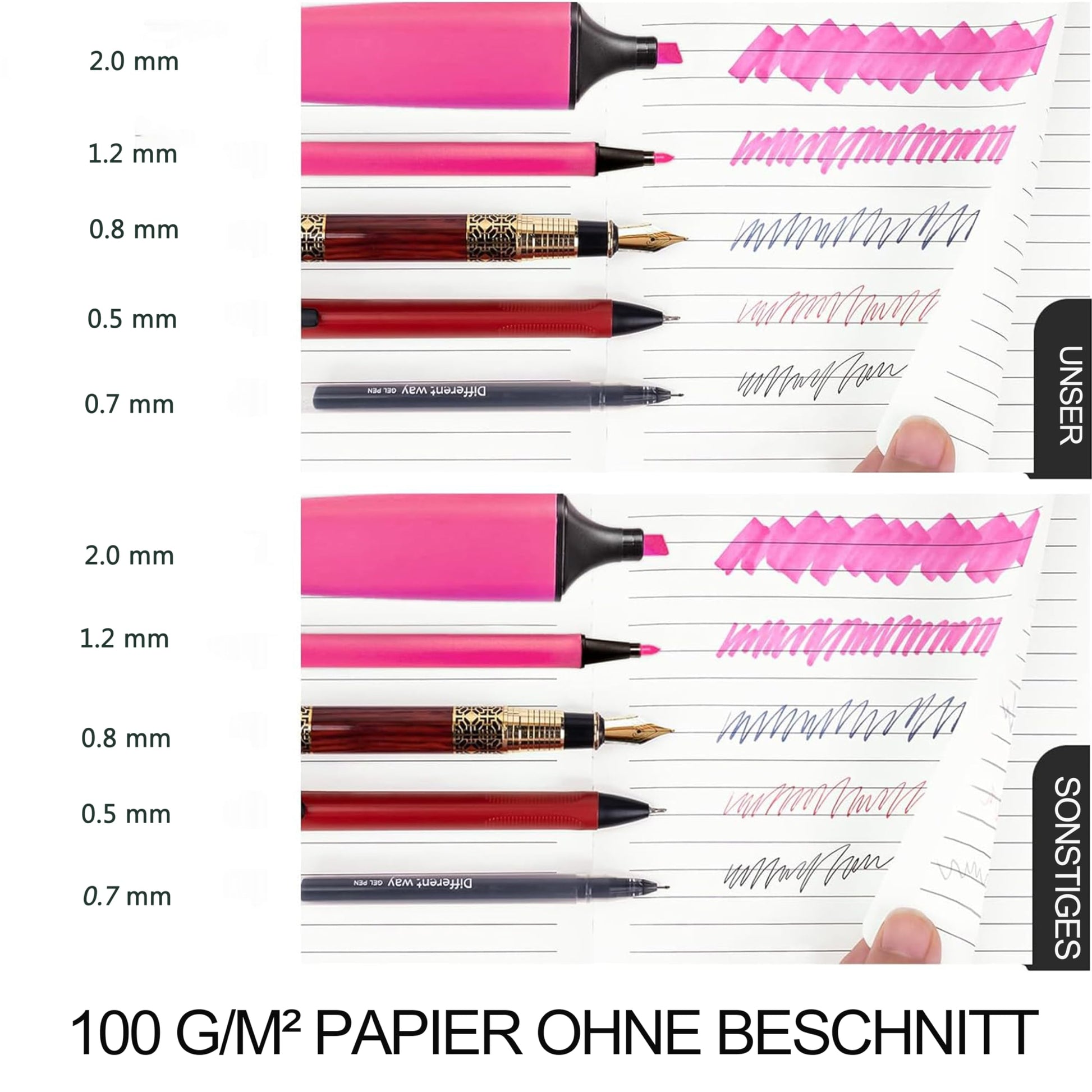 ["360 pages and 100 g/m² thick journal: Our journal offers 100 g/m² thick, lined paper for a smooth writing experience. It has the perfect B5 format (193 mm x 254 mm), and the brown edge gives it a touch of elegance. With a spacing of 9 mm, it provides plenty of room for writing.",