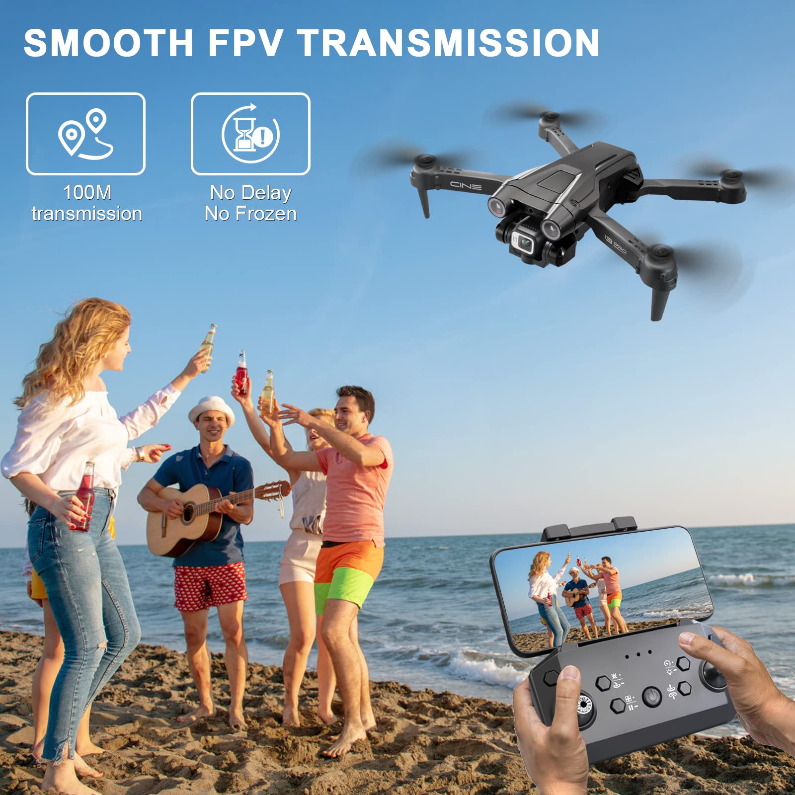 ["【Suitable for Adults and Kids】 The optical flow positioning allows the bottom camera to accurately capture the ground or any object, keeping the drone in a hovering state. Pressing the One Key Start/Stop button will maintain the drone at a height of 1.5 meters without drifting or losing control.", "【1080P Smooth】 You can see in real time what the camera sees through the phone app, without delays or freezing. The image transmission extends up to 100 meters. Additionally, the camera can recognize gestures, allowing you to take photos or videos with a simple gesture (e.g. hand movement or fist).", "【Enhanced Automatic Obstacle Avoidance】 The drones feature automatic obstacle avoidance in four directions. When activated, the drone can detect obstacles in front, rear, left, and right. It can recognize the distance to obstacles and evade them in advance. When activated, the drone's speed decreases and the high-speed mode is temporarily disabled. Therefore, it is recommended to fly indoors in this mode.", "【Multiple Fun Features】 This drone offers multiple functions, including 360° flips, waypoint flight, gravity control, gesture photography, one-key takeoff and landing, headless mode, and automatic four-way obstacle avoidance. It is a fantastic drone toy gift for beginners.", "【Upgraded 3 Batteries】 Equipped with three modular 2000mAh batteries (15 minutes per battery), you can enjoy a total of 45 minutes of flight fun. It has a low battery alarm and charging takes one hour. The batteries are easily interchangeable thanks to the plug-and-play design.", "【Note】 Calibration is required before each use by pushing the left stick up and down to connect the drone, and then pushing both sticks down to the right. Beginners are recommended to use it indoors before venturing outdoors. When flying outdoors, please select an open area to avoid interference. Be careful not to fly too far away to avoid losing control."]