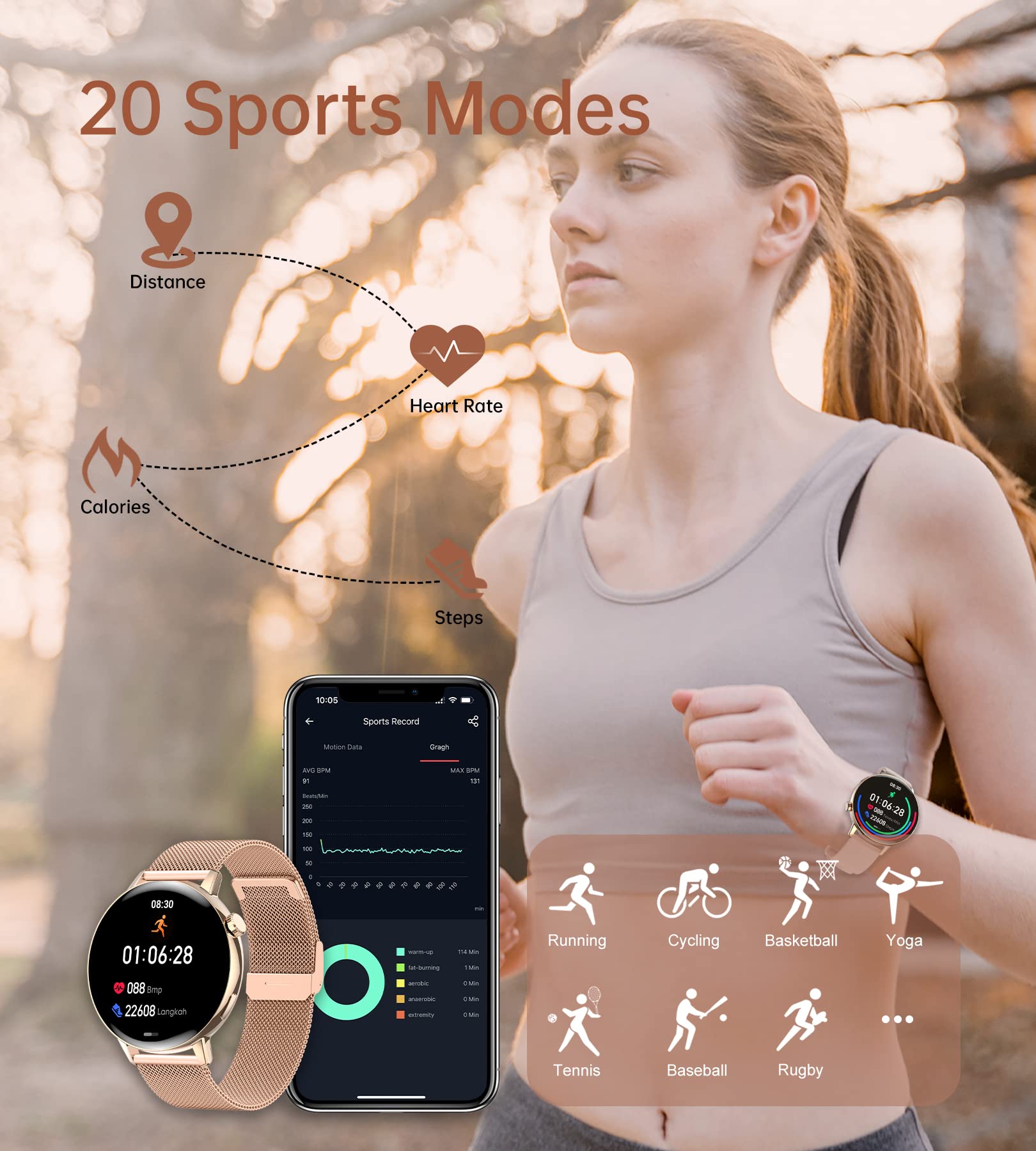 "Women's Health Monitoring: Small smartwatch can monitor heart rate, blood oxygen saturation, and blood pressure with high-performance sensors. Heart rate monitor tracks your sleep and analyzes your sleep quality in deep sleep, light sleep, and awake time. Sleep tracker can help you record your menstruation and ovulation, and make thoughtful suggestions before they arrive, so you can plan and avoid interruptions.",