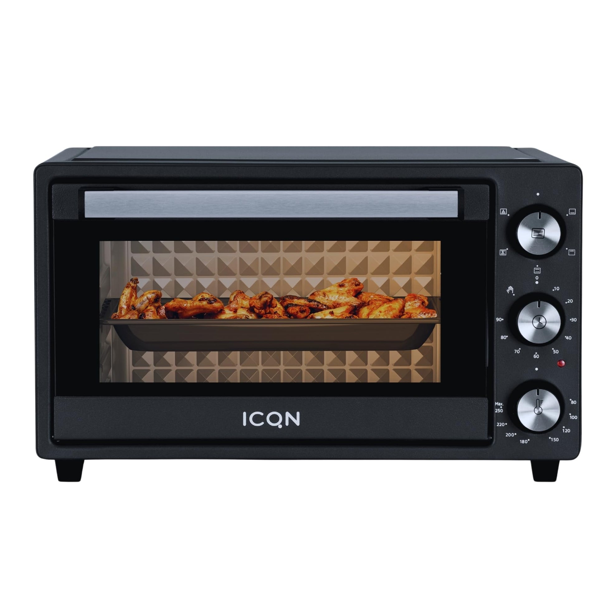 ICQN Mini Oven 20L, Pizza Oven, top/bottom heat with convection function, 5 grill functions, 90 Min. Timer, 1500 W, 80°-240°C, baking tray/grill/drip tray and tray holder, Black