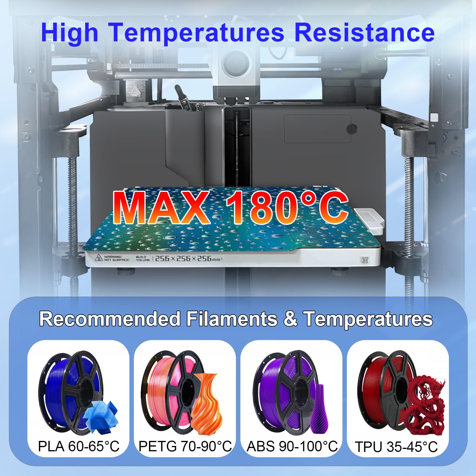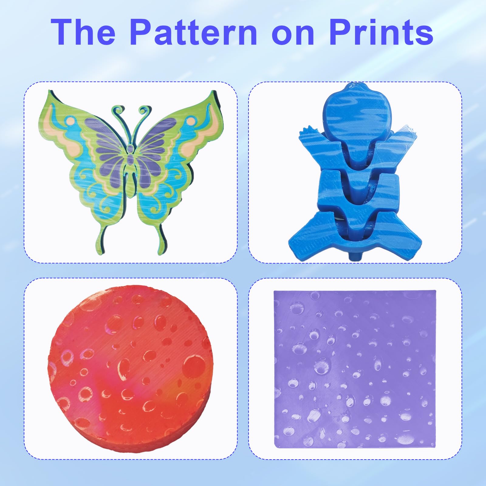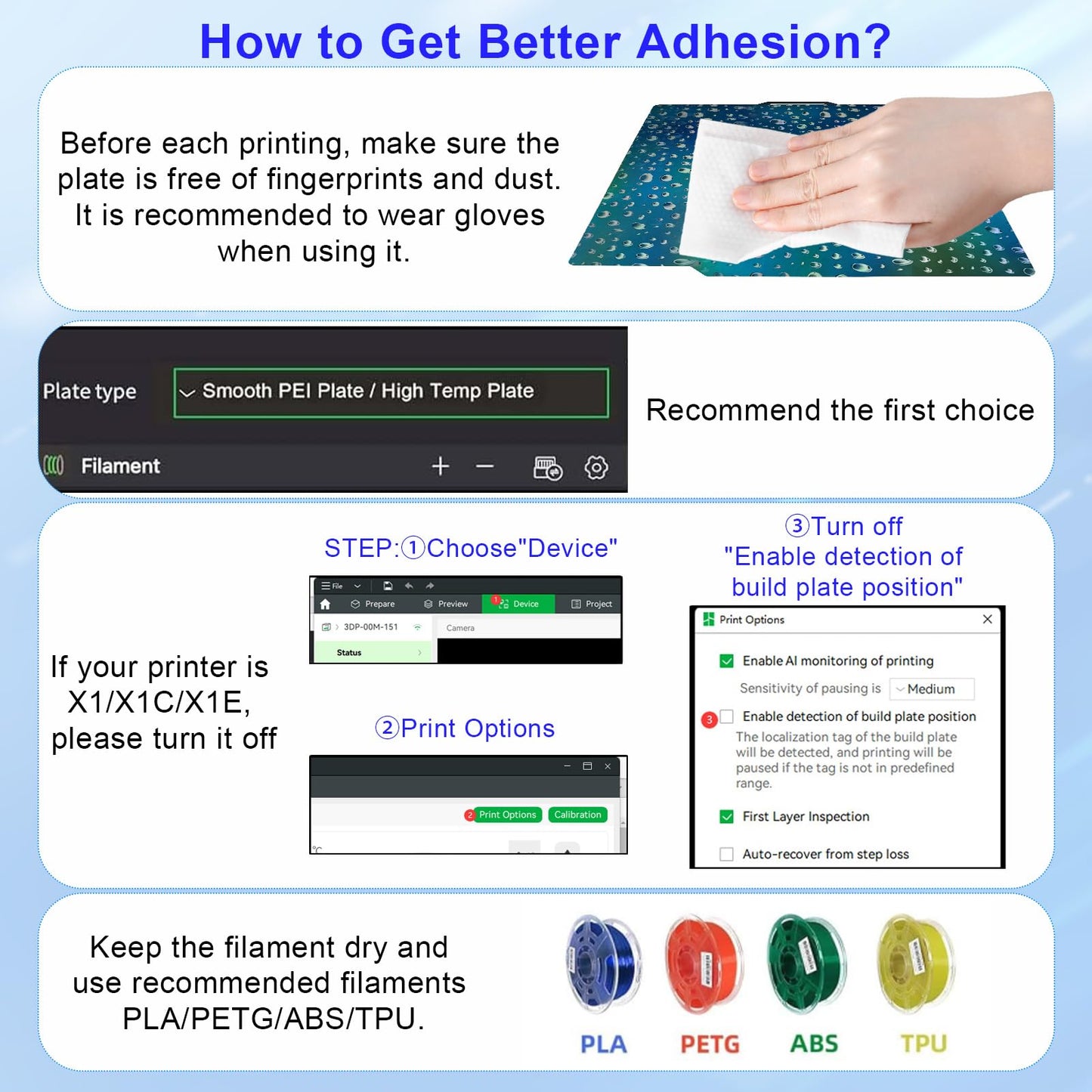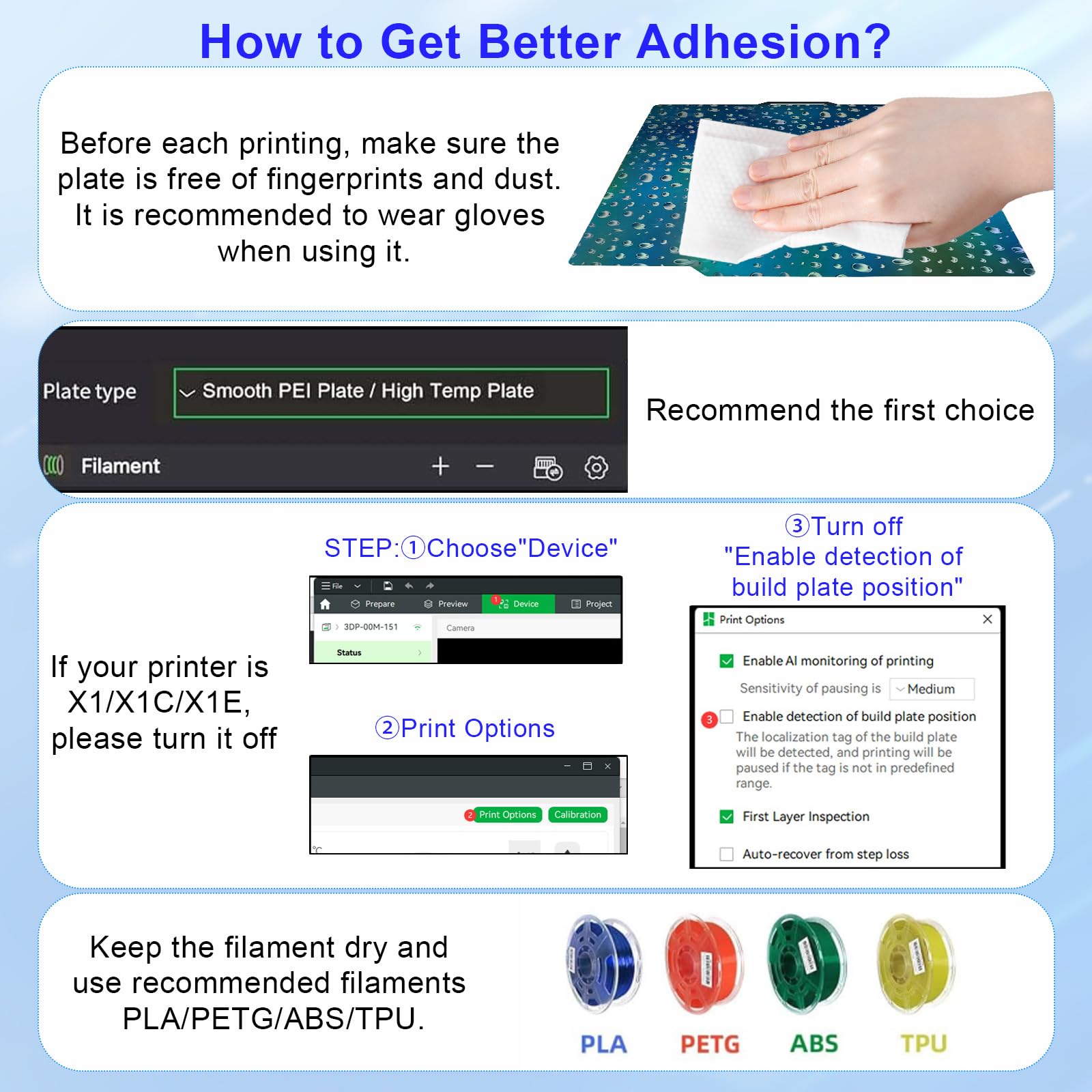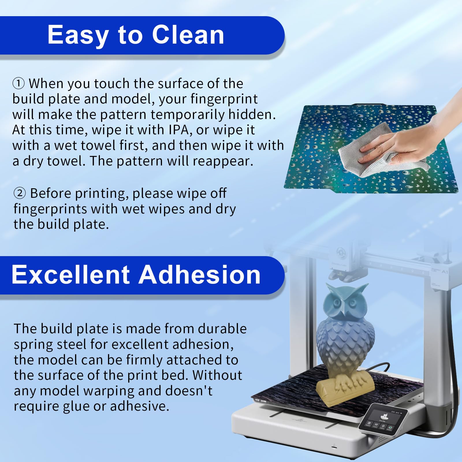 ["【Holographic Printing Plate with Wood Grain and Waterdrop】 The holographic plate PEH+PER combines wood grain and waterdrop patterns. The two different patterns can be transferred to your prints, immersing you in the vibrant world of 3D printing. The printing plate is great for artists and hobbyists looking to add a dynamic effect to their prints.","【Exceptional Flatness】 The printing plate PEH+PER features high-flat spring steel to ensure that prints adhere securely to the surface of the print platform. It can be bent repeatedly without deforming.","【Achieve Excellent Adhesion】 Select "Smooth PEI Plate/High Temperature" on the screen. If your printer is X1/X1C/X1E, please disable "Enable Bed Plate Detection" before selecting the plate type. Then clean your plate before each print.","【Effortless Removal】 The PEH+PER spring steel plate is flexible. Wait for the print to finish and for the plate and print to cool. Then bend the sheet and easily remove the model.","【Package Includes】1 x PEH+PER printing plate (smooth wood grain & wood grain, Size: 257 x 257 mm) for Bambulab X1/X1C/X1E/A1/P1P/P1S 3D Printers."]