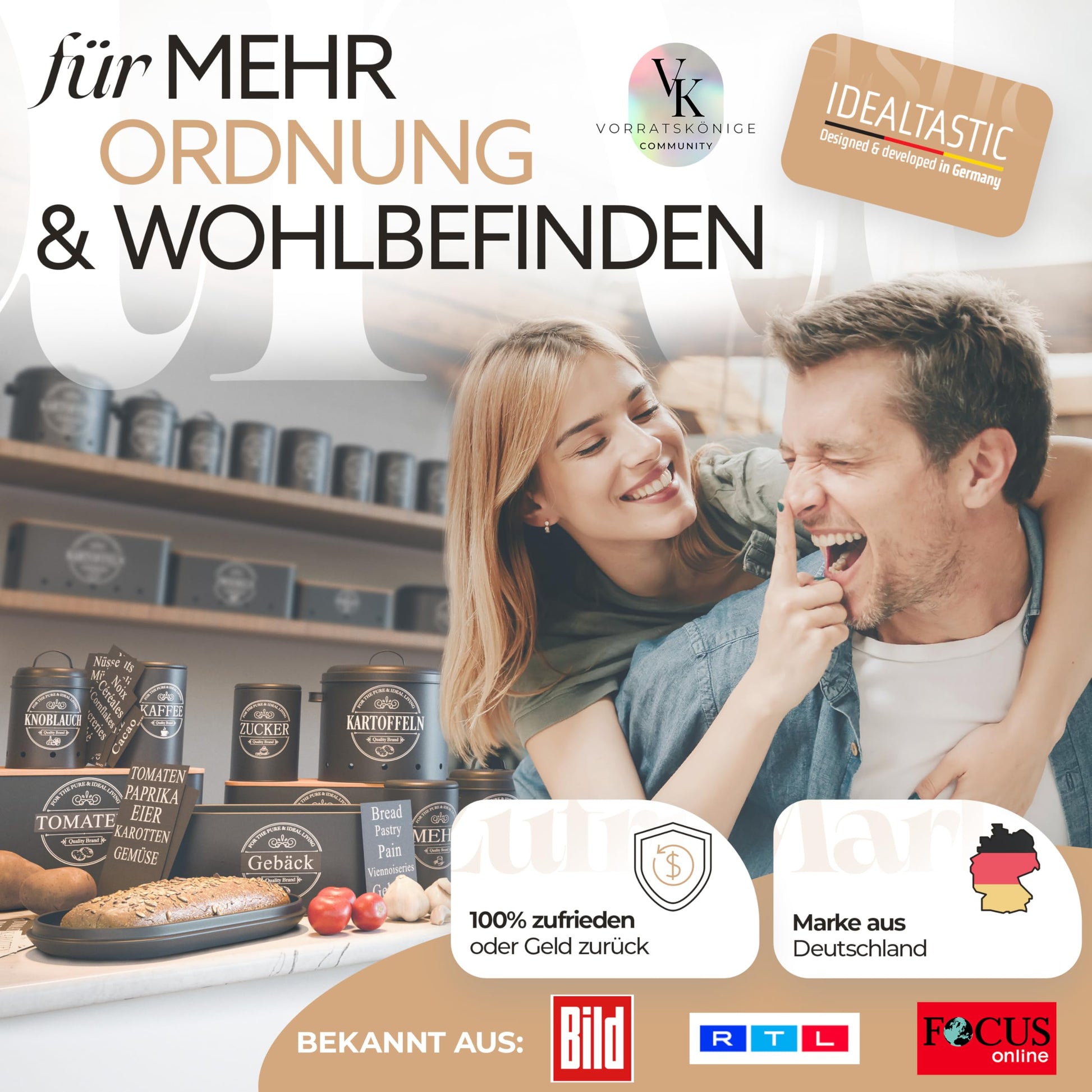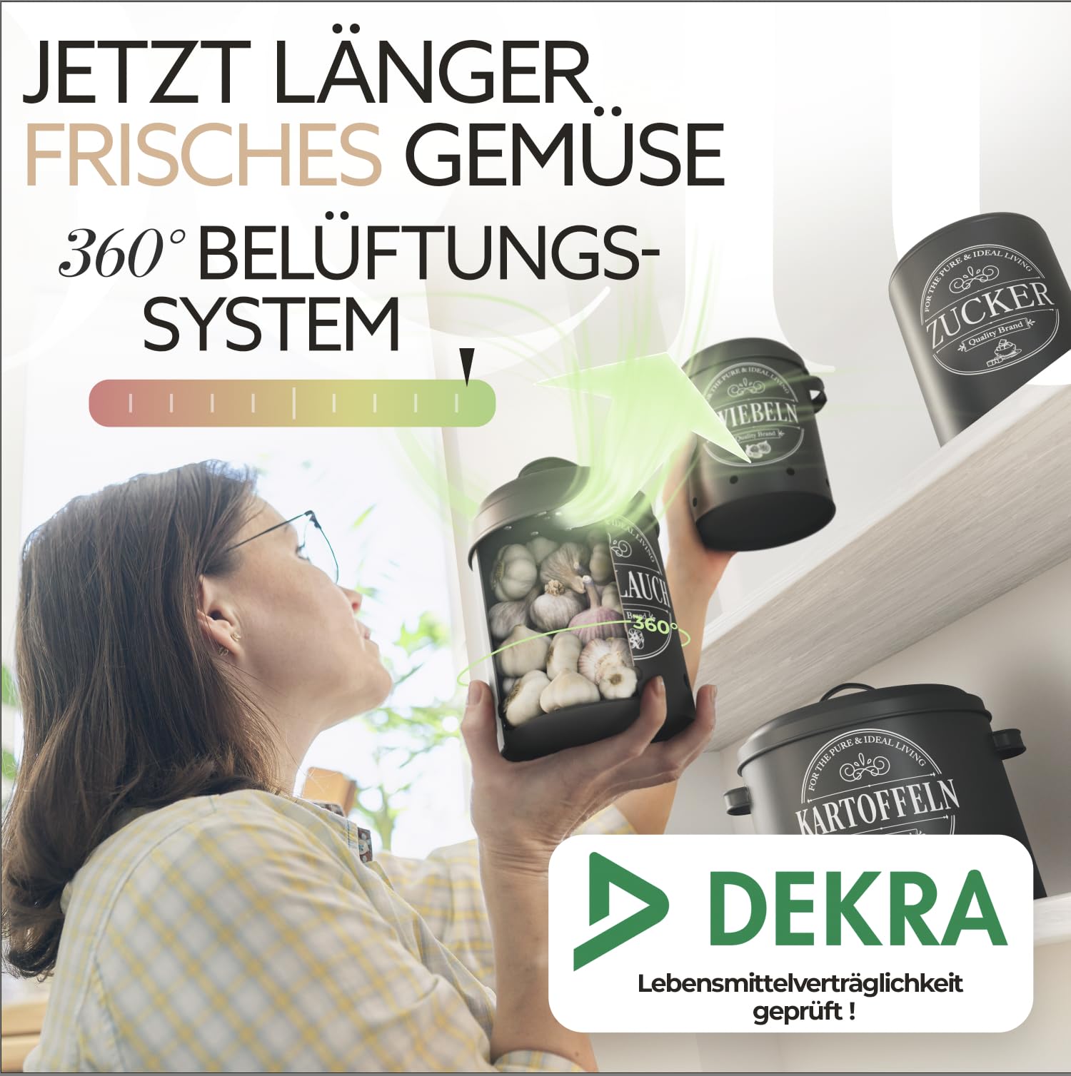 ["✅ MORE FRESHNESS & DURABILITY - Thanks to the 360° ventilation system, vegetables can be stored significantly fresher and airier for several weeks than in conventional potato cans.","✅ PREMIUM SET - Whether as a storage container or pantry container - Thanks to optimal storage conditions & ventilation, potatoes (8 lbs), onions (3.3 lbs) & garlic (2.2 lbs) last longer & stay fresh.","✅ MAXIMUM ROBUST & DURABLE - The galvanized material in premium food quality makes the vegetable box particularly break-proof in everyday life & reliably protects against dents & scratches.","✅ ERGONOMIC & PRACTICAL - The side handles on the potato storage box provide very comfortable ergonomics when carrying & effortless cleaning in no time - Perfect for any kitchen!","👍 IDEALTASTIC PROMISE - With our premium potato containers, you always ensure maximum freshness & a particularly long shelf life for your food - 100% satisfied or money back"]