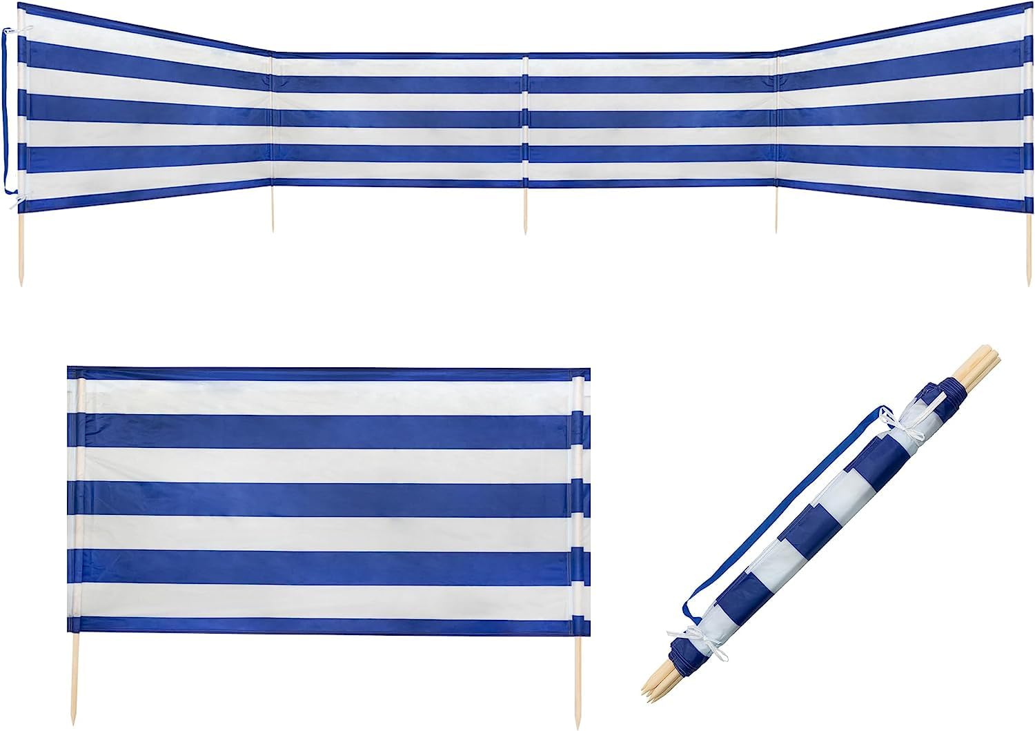 "Practical wind and privacy protection made of dense fabric with one-sided printing in nordic blue and white striped look for beach, garden, and camping | includes white rubber hammer","With 7 wooden sticks for anchoring in the ground for easy and quick setup","Length approx. 26 ft, height approx. 31.5 in (wooden sticks stand approx. 7.9 in above ground for securing)","Made of lightweight and quick-drying material with PA coating","Can be quickly rolled up, fixed with straps, and carried over the shoulder with the attached strap"