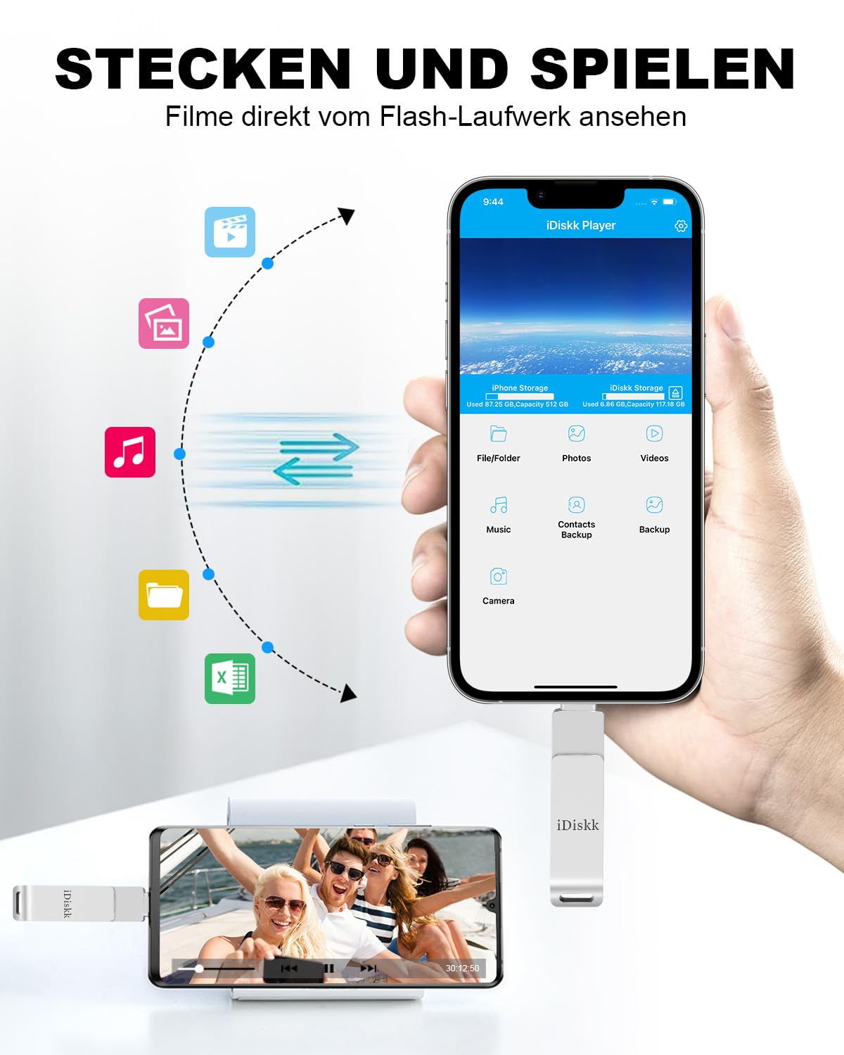 ["MFi-certified and reliable quality - With authentic MFi certification to ensure stability and security, the free and stable app is available in the Apple Store, iDiskk photo stick for iPhone supports Touch ID/Passcode encryption and independent passcodes in the file. Protect your sensitive files", "Secure photos or videos with one key - A key to effortlessly back up all your videos/photos from your iPhone/iPad via the app (available for free in the Apple Store), avoid memory-wasting duplicates and perfectly save your storage space. Only place newly added files, keep the original photo date. You can also use the app camera to take photos/videos","Take pictures/videos + Play video/picture directly through the app - The iPhone memory Stick provides an easy and fast way to transfer photos and videos between iPhone, iPad, and computers. Simply plug the photo stick into your iPhone/iPad device. With the app, you can take and play pictures/videos directly. Save storage space on your iPhone/iPad and free up your iPhone storage","App encryption + File encryption - Approved by MFi with original chipset, Lightning USB stick can be encrypted with Touch ID/Face ID or numeric password through setting app, numeric password is supported for folder encryption (Note: Once the file is encrypted, it is invisible on the computer). Your privacy will not be stolen, even if you lose the flash drive, protect your sensitive files","WIDELY COMPATIBLE - Works with most iOS devices and computers: iPhone 14/iPhone 14 Pro/iPhone 14 Pro max/iPhone 13/13 pro/13 pro max/13mini/iPhone 12/12 Pro/12 Pro Max/12 mini/iPhone 11/11 Pro/11 Pro Max/iPhone XS/XS MAX/XR/X / iPhone 8 Plus / 8 iPhone 7 Plus / 7 / iPhone 6s Plus / 6s / 6/6 Plus/iPhone SE (NOT compatible with 12.9 inch, 11 inch iPad Pro with USB-C port.)"]