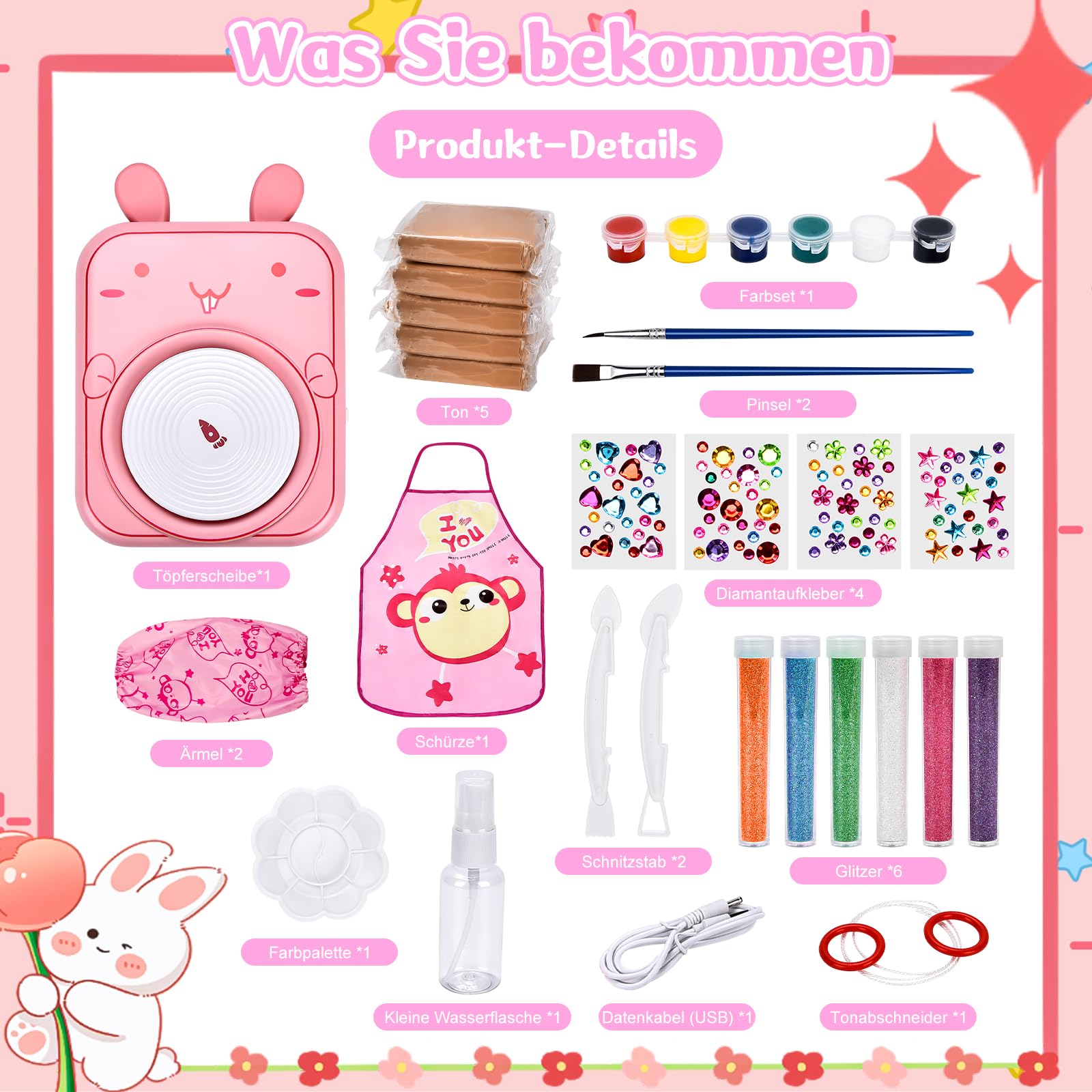 ["đ¨ăPottery Set for KidsăThe Pottery Set Kit is complete, kids can make their own beautiful pottery. The pottery kit includes a pottery wheel, clay, paints, brushes, palettes, drawing tools, carving tools, water sprayers, apron, protective cover, glitter, and colorful gemstone stickers. Perfect for beginners to learn pottery and meet your various needs.","đăCreative DesignăThe electric pottery wheel in the kids' pottery set adopts very popular rabbit and cat shapes, with a unique, cute, and stylish appearance. The whole set is very cute and interesting, loved by children. USB rechargeable design, plug and play, no need to worry about battery life; also equipped with an easy-to-clean palette, convenient for children and beginners to shape and color.","đăSafe MaterialăOur clay is safe and non-toxic, produces pottery that does not need to be fired and can naturally dry within 2-5 days. The electric pottery wheel is made of high-quality ABS material with smooth and burr-free edges that will not hurt your hands. Ideal for children aged 8 and over. It is recommended that children use the device with an adult.","âď¸ăPromote TalentăThis amazing pottery wheel stimulates children's curiosity, promotes fine motor skills development, and provides a soothing experience. Children can express their creativity and bring their artistic skills to life through unlimited imagination, pottery, and painting tools. Children can unleash their creativity freely and have fun.","đăBest GiftăThe kids' pottery set can meet the needs of pottery lessons, entertainment, craft lessons, and many other needs. It can also be given to children as birthday, Christmas, Thanksgiving, Easter, New Year's gifts to stimulate their creativity and imagination."]