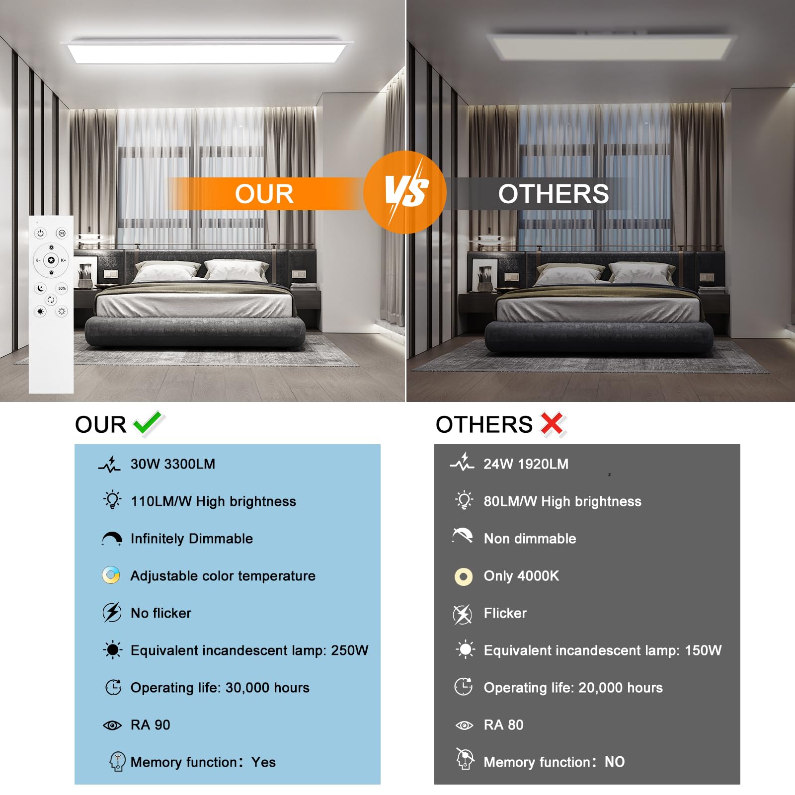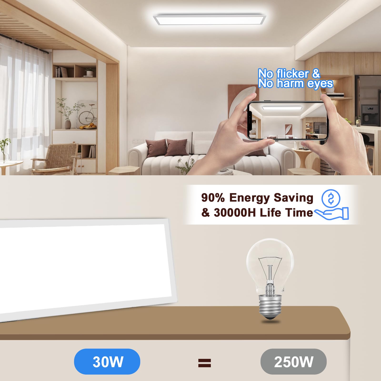 ["High-quality visual performance】 LED panel ceiling lights provide a premium viewing experience compared to traditional versions. With dimensions of 100 × 25 × 3.9 cm and a full PS lampshade, they produce soft, uniform light that optimally illuminates larger areas. By combining aluminum and steel frames, the LED ceiling panels guarantee stability and durability. Unlike traditional models, we do not use pillar mounting and opt for seamless wall mounting – ideal as an office or hallway ceiling light, bedroom lamp, workshop lighting, kitchen light, living room lamp, entrance lighting, children's room lamp, or restaurant lighting.","【Super bright brightness, energy efficiency & durability】 The 30W LED panel ceiling light illuminates 25% of a room. With 3300 lumens, it is equivalent to a 220W incandescent bulb, but saves up to 90% energy costs. LED ceiling light With 7 hours of daily operation, the light consumes only 1 kWh in 4.8 days. The 30,000-hour lifespan also reduces replacement costs.","【Infinite dimming options, color temperature & memory function】 Flat ceiling light With the convenient remote control, the brightness can be smoothly adjusted (10-100%) and choose between three color temperatures (3000K-6500K: warm white, neutral white, cool white) - perfect for any mood. LED ceiling light with remote control The memory function saves your last setting and activates it automatically the next time it is turned on. So you always enjoy your personal light without readjusting.","【Highly efficient, flicker-free & high color rendering index】 Flat LED ceiling light 42 high-quality LEDs in 2 groups deliver 3300 lumens - comparable to 26 light bulbs (15W each). Thanks to flicker-free light and silent operation, the luminaire creates a pleasant ambiance. Dimmable LED panel The high color rendering index (CRI) minimizes light pollution and displays object colors true to life - ideal for enhanced quality of life.","【Wall switch & remote control】 The LED ceiling light with remote control memory function can be controlled via both remote control and wall switch (color temperature change). When using the wall switch, the memory function is activated if the light was on for >1 minute and then off for 30 seconds. A remote control can control up to 3 ultra-flat LED ceiling lights.","【Premium quality & easy installation】 Materials: steel frame, aluminum frame, PS lampshade. noise-free electronics. The easy installation and deformation-resistant frame guarantee stability. All LEGLED LED light ceiling lamps have their own patents and design rights – you can buy our products with confidence!"]