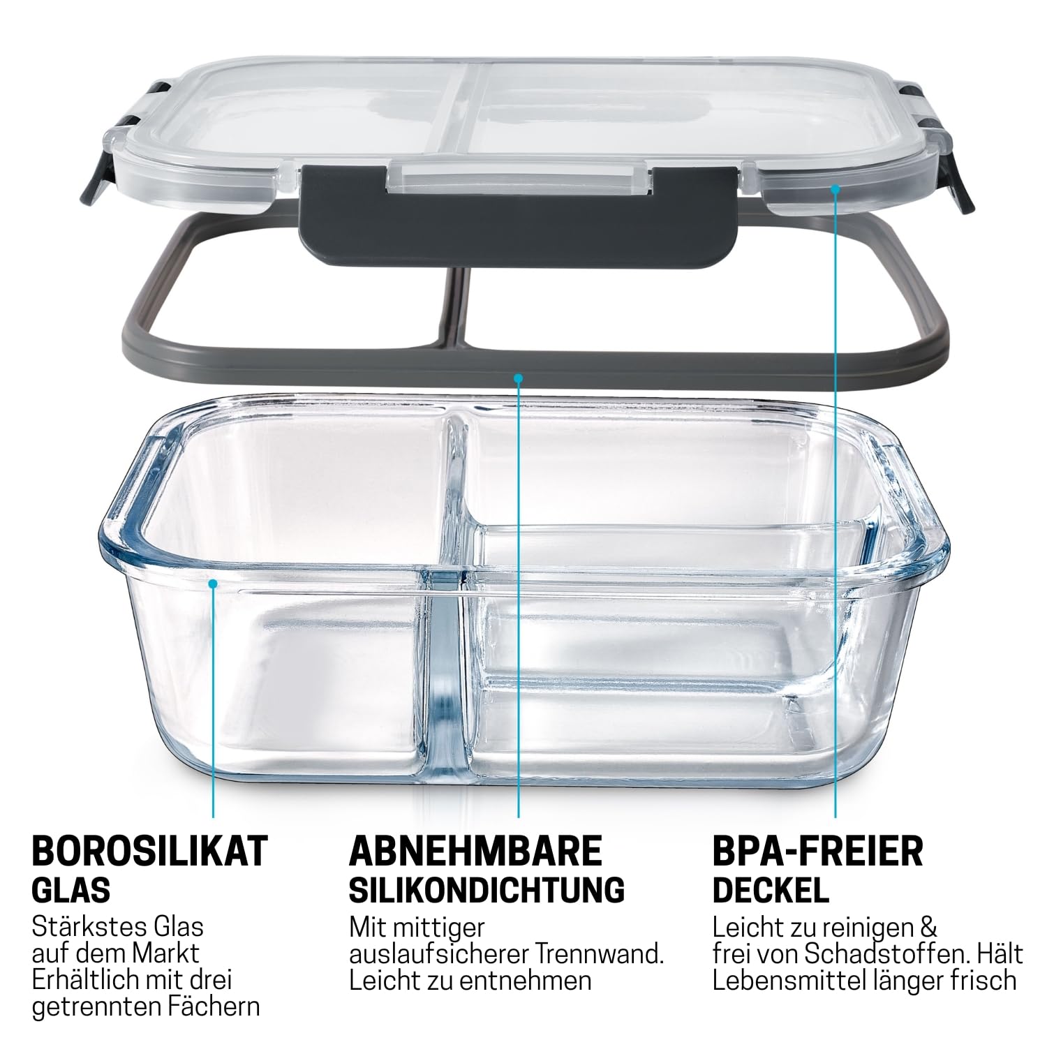 Divided food containers: Perfect for separating food until mealtime; The glass walls and silicone seal ensure complete separation between the two main compartments; The snap closure lid technology seals the food airtight and keeps your meal free from bacteria and germs.