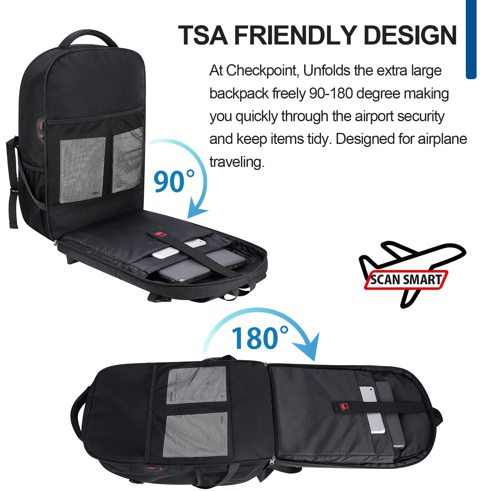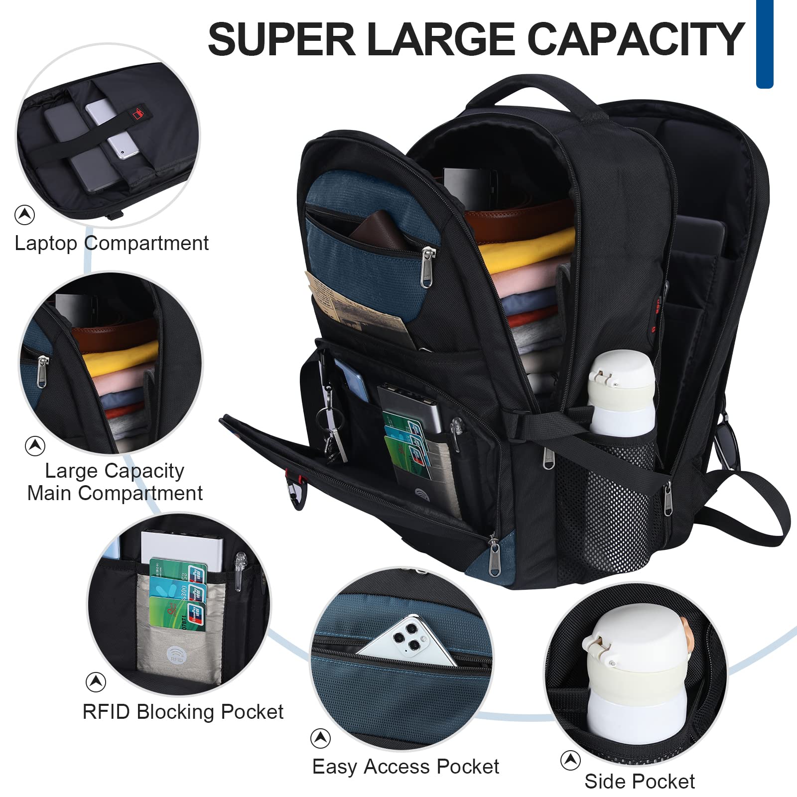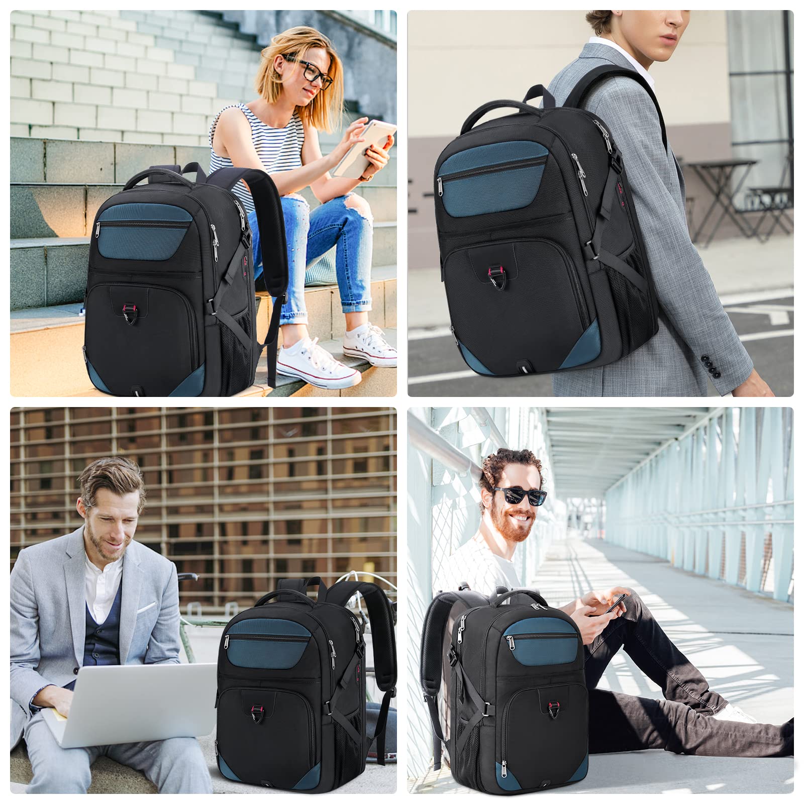 [""]"✈【LARGE CAPACITY BACKPACK】 This extra large men's backpack 17.3 inches measures 18.5 * 14.17 * 7.08 inches. A separate laptop compartment fits 17-inch laptops, a main compartment provides space for daily necessities such as clothes, folders, files, lunch boxes, etc. The front compartment has many small pockets as well as pen pockets and a keychain design to keep your items organized and easier to find.","✈【QUALITY & DURABLE MATERIALS】This laptop backpack is made of water-resistant and durable polyester fabric with high-density nylon lining for better tear and water resistance and durability. Durable metal SBS zippers close and open smoothly, ensuring secure and long-lasting daily use. Side compression straps keep the exclusive backpack in any desired size.","✈【TSA APPROVED & MULTIPURPOSE】At checkpoints, the IGOLUMON men's work backpack can be opened freely by 90-180 degrees, allowing you to pass airport security quickly and keep things in order. Exclusively designed for air travel. A luggage strap allows the attachment of the laptop backpack to the suitcase, ideal for international flights and day trips.","✈【PRACTICAL DESIGN】USB and headphone interface are especially convenient for on-the-go, without having to hold it in your hand; RFID pockets can protect IDs, credit cards, and passports from identity thieves; The exterior pocket has a keychain hook for quick access to keys; And this backpack with reflective strip ensures additional safety on your excursions; It is an ideal gift for men and women.","✈【BREATHABLE & COMFORTABLE】The padded and breathable mesh back panel of this backpack design contributes to air convection, ventilation, and heat dissipation. Comfortable, wide mesh shoulder straps with ample sponge padding help alleviate the burden from your shoulder. One side of the shoulder strap with lanyard design can hang sunglasses and other small pendants. Ideal gift for back to school, Father's Day, Christmas."