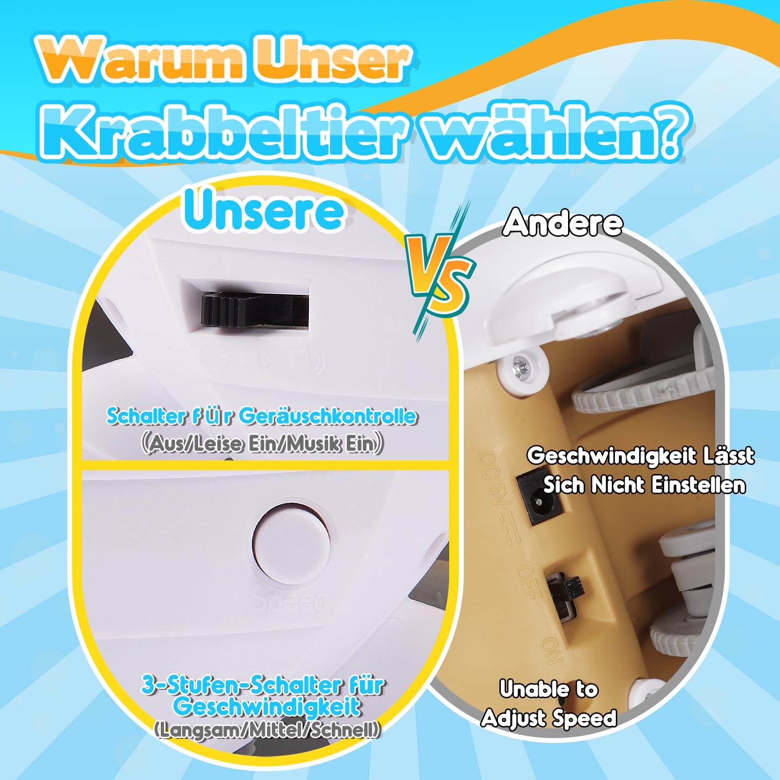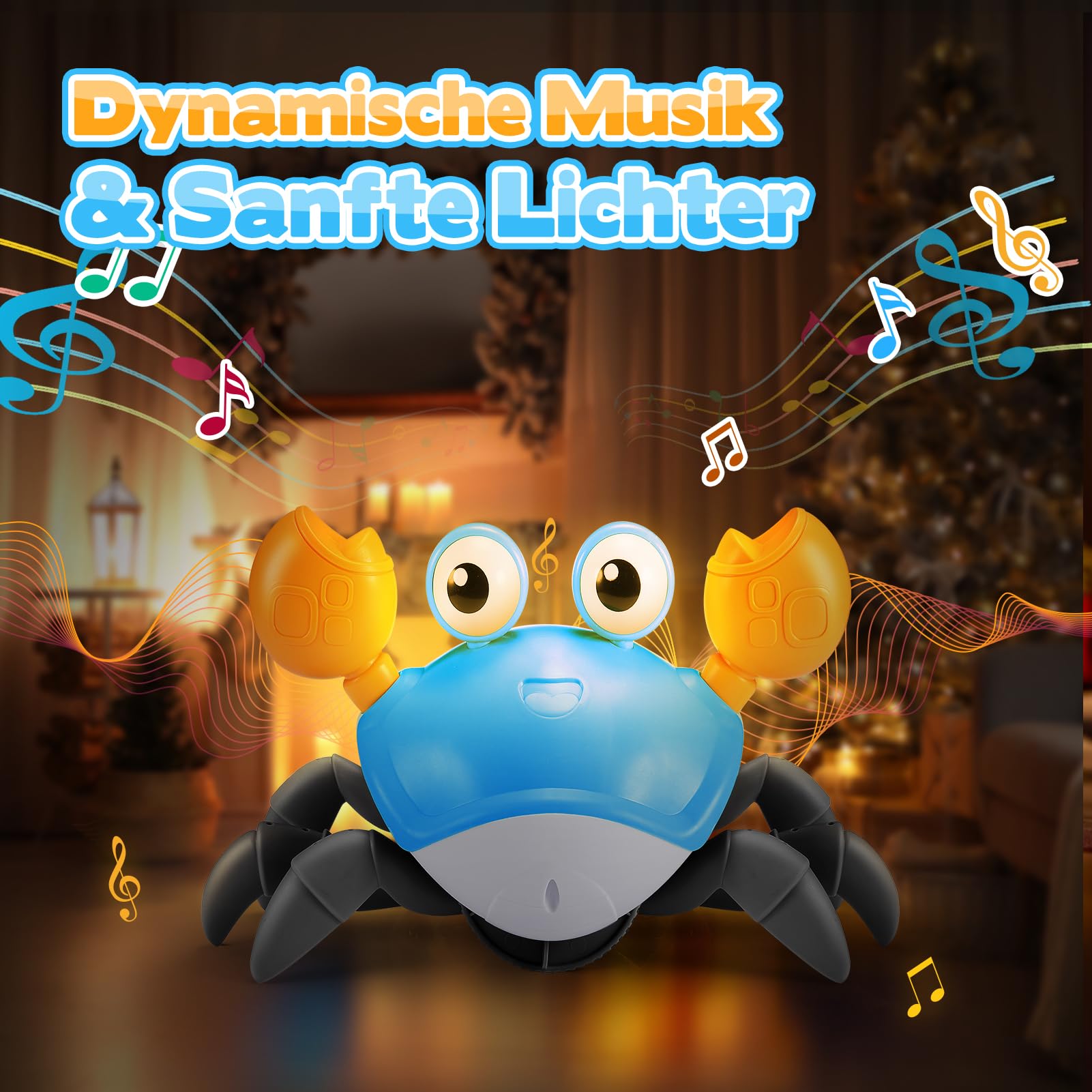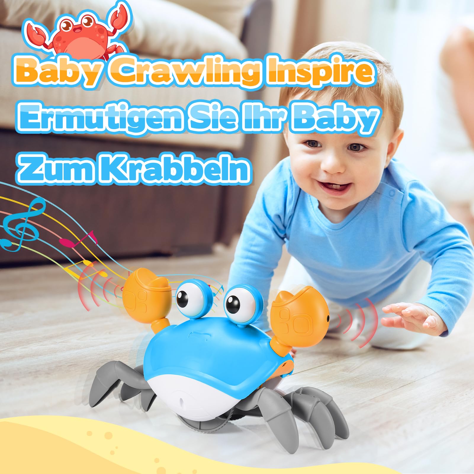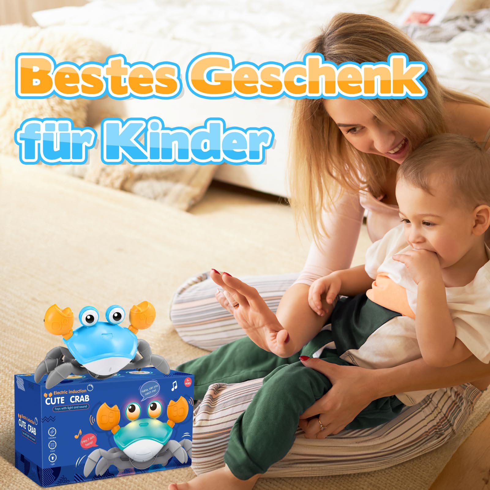 ["Variable Speed & Sound Control Switch】After turning on, the crab starts crawling, the music plays, and the crab's two eyes blink and light up, attracting the baby's attention, stimulating their desire to crawl, and promoting auditory development. Crab updates new functions - comes with 3 levels of speed control switch (slow / medium / fast), sound control switch (off / mute on / music on)","【Intelligent Sensor Interaction】The crawling crab is equipped with infrared auto sensors, when the crab encounters an obstacle (baby's hand or foot), it will automatically move in the opposite direction. Your child can play with the crab anytime, anywhere - training lifting, placing, rolling, crawling, and walking","【No Batteries, USB Charging】The electronic music crab toy contains a lithium battery, comes with a USB charging cable, after charging for more than 2 hours, it can be used for 40-60 minutes, enough to accompany the children for an afternoon of leisure. [Note: Please make sure the toy is turned off while charging.]","【Quality Children's Toy】The running crab sensory toy is made of high-quality materials, polished rounded corners, sturdy and durable, will not hurt the hands and feet of children. Cheerful music brings endless surprises to children. The soft light does not harm children's eyes. [NOTE: Do not use this toy on carpets, in water, or in a wet environment.]","【Informative Gift for Children】Children's favorite musical crab toy is perfect as Easter gifts, Halloween gifts, Christmas gifts, birthday gifts, school class prizes, Children's Day gifts, and smart educational toys for 0 1 2 3 4 year old boys and girls. Believe me, they will be surprised, happy, and unforgettable when they receive it"]