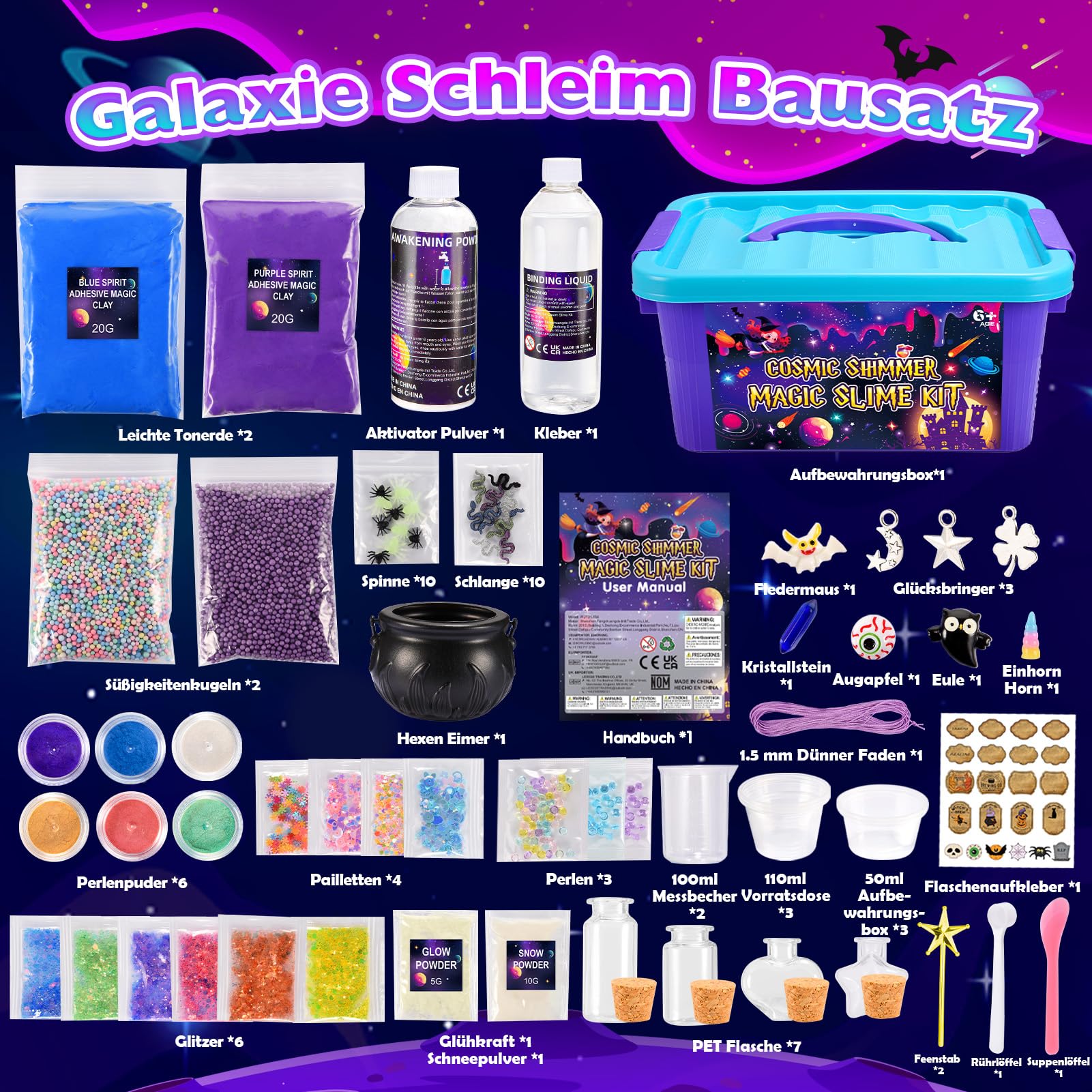 ["【Hundreds of Galactic Slime Possibilities】Create a variety of fun slimes, such as cloud slime, butter slime, glitter slime, metallic colored slime, soft slime, and glow-in-the-dark slime. By adding clay, the slime gets even more colorful. Hundreds of possible slime combinations are waiting to be discovered by you