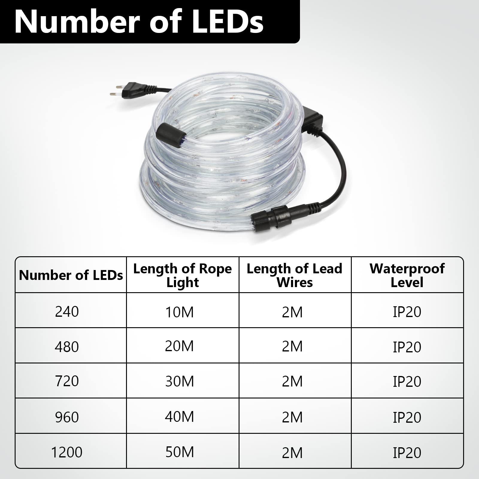 Ikodm LED light rope outdoor 1200 LEDs 50m light rope with timer 8 lighting modes waterproof string lights powered by electricity for indoor party Christmas Halloween wedding, warm white