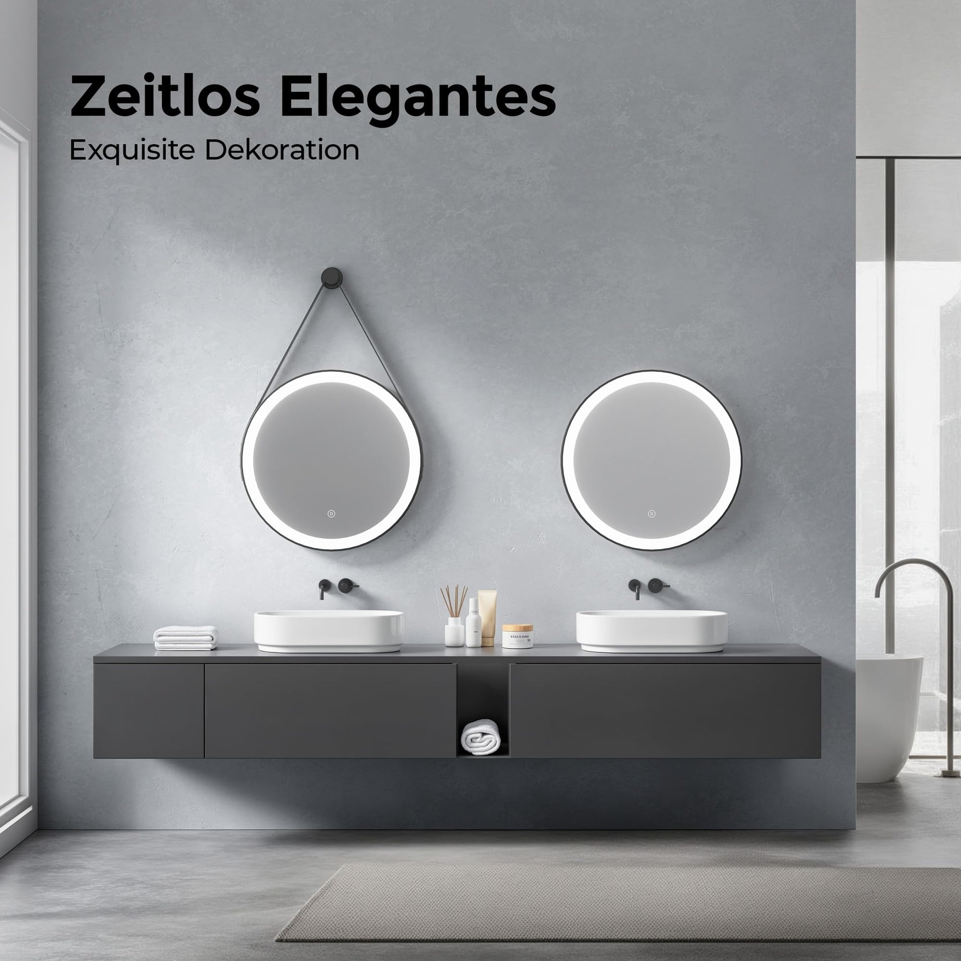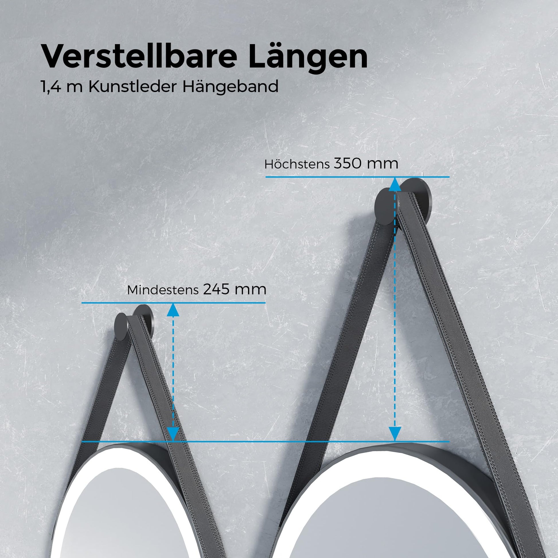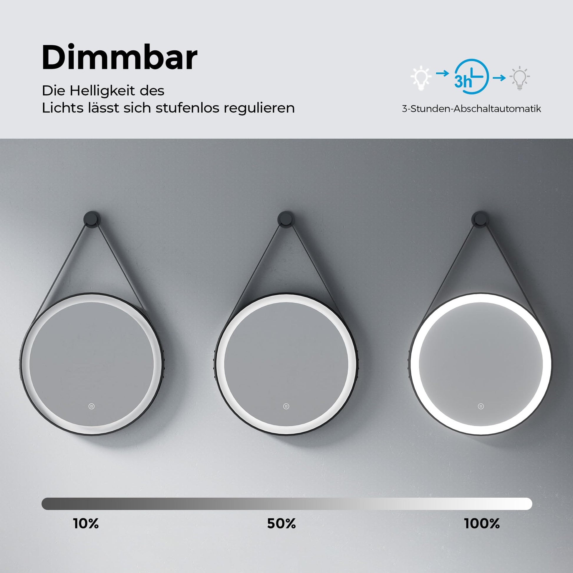 ["【Mirror with Lighting】Providing optimal lighting, LED bathroom mirrors have become a popular choice in 80% of modern bathrooms. Discover the perfect glow for your bathroom with Heilmetz bathroom mirror with light.","【Circle Aesthetic】A round wall mirror offers a softer look compared to rectangular mirrors and adds a unique visual appeal to the bathroom. A 50 cm bathroom mirror with lighting fits perfectly in bathrooms of any size and provides a clear reflection surface.","【Uniform Lighting】Bathroom mirrors with 6500K cold white lighting for clear and bright light effects. The dimmable function allows you to adjust the brightness of the light according to your preferences. With memory function to save your favorite lighting settings.","【Energy Saving】Bathroom mirrors with lighting provide bright and uniform lighting with minimal power consumption. Thanks to the 3-hour auto-off function, they save additional energy, increase safety, are durable and efficient.","【Additional Surprise】The removable and adjustable leather strap (1.4m) adds an exquisite decoration to bathroom mirrors with lighting, which is both stylish and practical, allowing effortless hanging in any room. The black metal frame structure ensures a timeless elegant experience."]