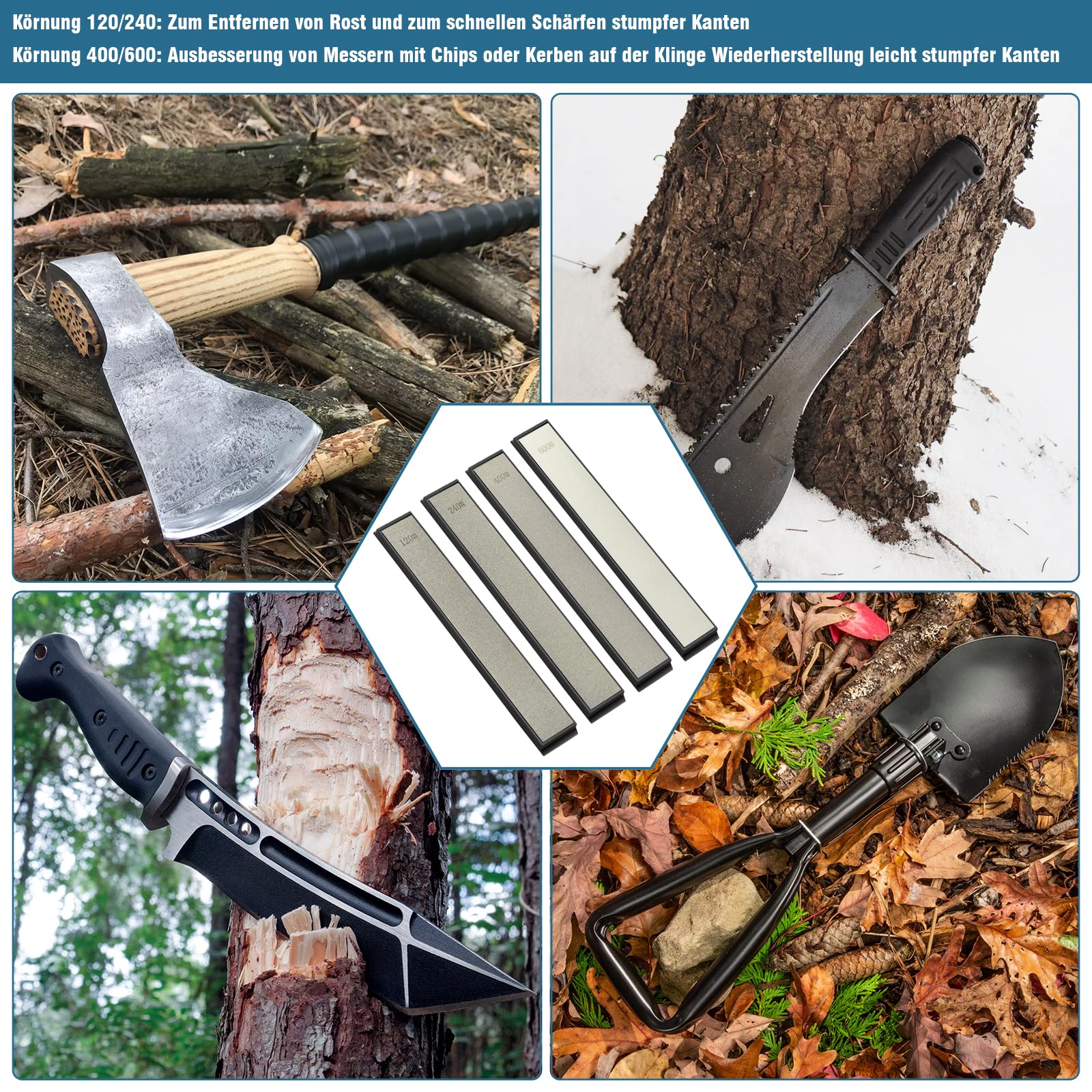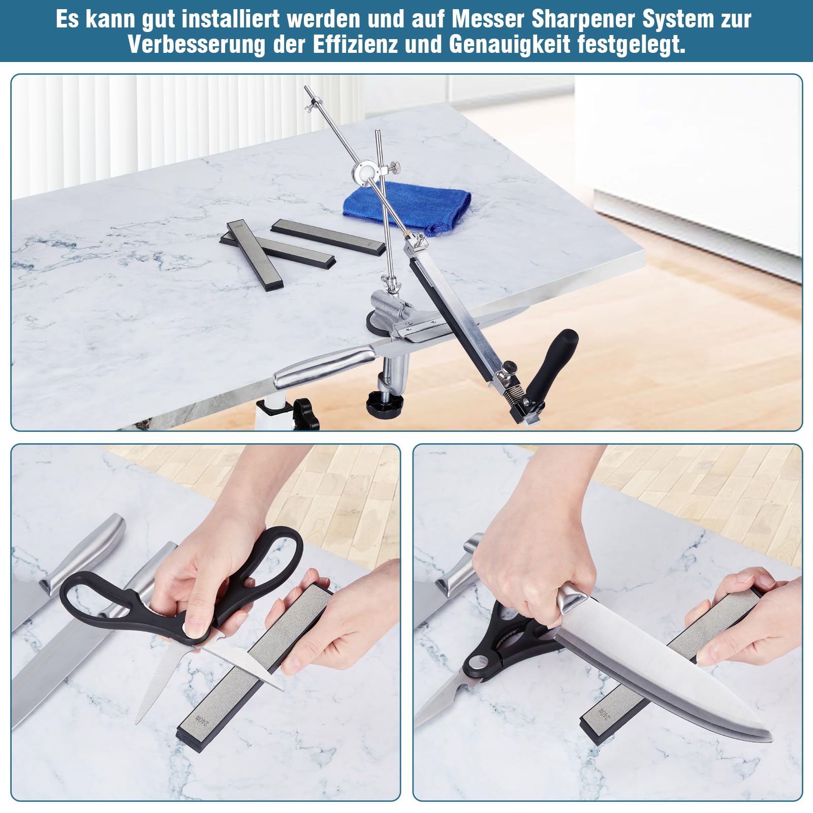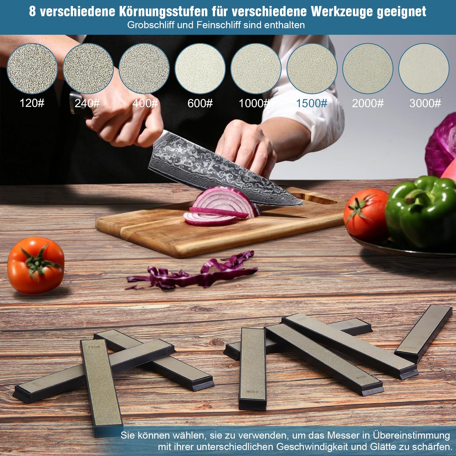 ["✂【8 DIFFERENT SHARPENING STONES】There are a total of four different diamond sharpening stones for knife sharpeners. They are each #120#240#400#600#1000#1500#2000#3000, so you can choose to use them to sharpen the knife according to their different grits.","✂【DIAMOND MATERIAL】The diamond sharpening stone is made of diamond, which proves to be harder, stronger, and more durable than those made of stone material. The powder does not easily fall off when sharpening a knife.","✂【USER-FRIENDLY DESIGN】One of the most outstanding features of this diamond sharpening stone is that you do not need to use water when sharpening the knife. Compared to a whetstone, this sharpening stone has been proven to work more efficiently.","✂【MORE ACCURACY AND EFFICIENCY】This type of sharpening stone can not only be used alone, but especially in combination with the knife sharpener. This way, it can make the sharpening effect of a knife more precise and efficient.","✂【VERSATILE USE】There is no doubt that these diamond sharpening stones have a wide range of applications, and can be widely used in all kinds of cutting tools, such as tools grinding, scissors, chisels, planer blades, kitchen knives, and more."]