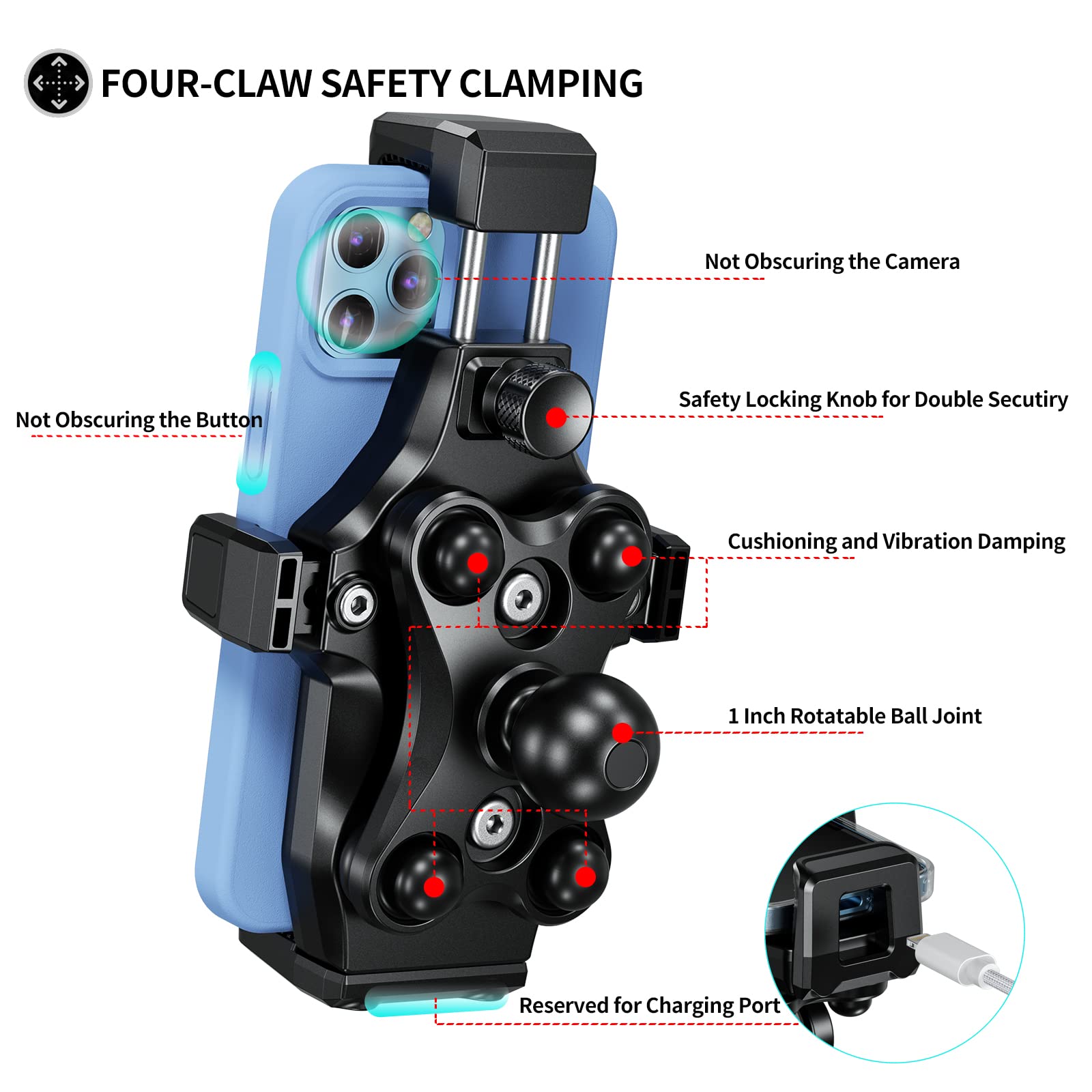 "Say goodbye to phone vibrations while high-speed driving with our Anti-Vibration Handlebar Phone Mount, featuring 4 cushioning shock absorber pads that provide a smooth and stable ride. Keep your phone camera safe and secure while cycling with our unique design that does not obstruct the camera and prevents damage from friction. The rear safety locking button of this motorcycle phone holder ensures absolute prevention of the phone from falling off, providing double security for your phone and giving you peace of mind while riding. Made from high-quality materials, including an aluminum alloy phone holder and a sturdy PA66+GF main body, our mount offers a sturdy structure and a premium appearance. International products have separate terms, are sold from abroad and may differ from local products, including fit, age ratings, and language of product, labeling or instructions. Item weight: 360.0 grams. Water resistance level: water resistant."