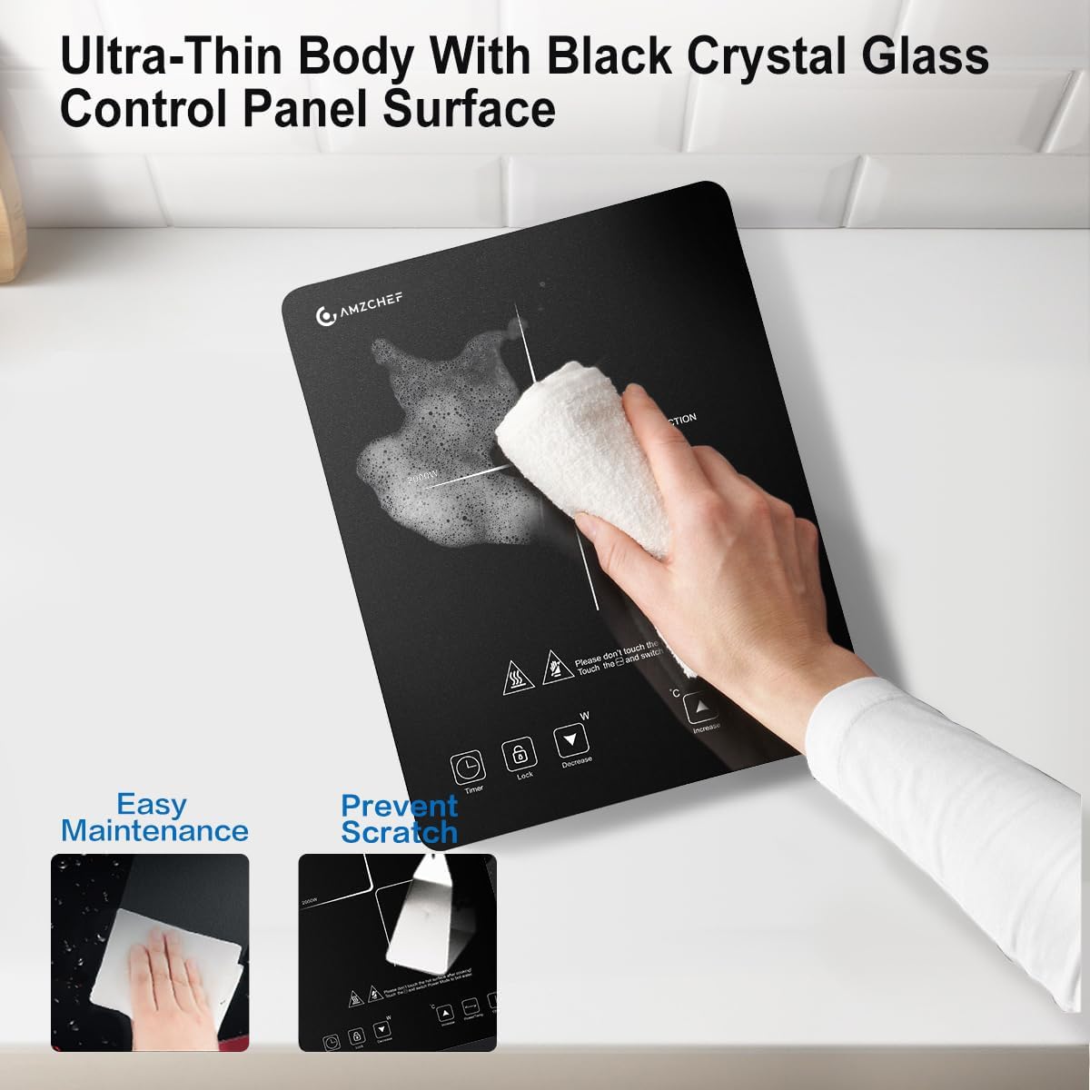 ["【2000W Induction Cooktop with Ultra-thin Design】With a height of 44.5mm and stylish appearance, the AMZCHEF single induction hot plate is a helpful partner for cooking as well as a great decoration for the kitchen. It's lightweight and can easily be tucked into a locker and taken anywhere. 3-hour timer and safety lock are included.","【20 Temperature Levels and 20 Power Levels】The induction cooktop 1 burner can be operated from 100 to 2000 watts and from 50~ 240 ℃. For frying, grilling salmon, and searing steak, the temperature mode is a must. The power mode is great for making soups, boiling water, cooking beans and spaghetti, as well as for a hot pot. The AMZCHEF induction hot plate will not disappoint you.","【Overheat Protection and Easy Cleaning】If the surface temperature of the hot plate exceeds 280 degrees, an error code will be displayed. Please let it cool down and then use it again. The matte black crystal glass surface ensures excellent wear resistance and easy cleaning. This single induction cooktop is a beautiful addition to your kitchen.","【Compatible with Magnetic Cookware and Child Safety Lock】The induction hot plate is compatible with induction-ready cookware, including cast iron, iron, enameled iron, and stainless steel with a magnetic bottom. The induction cooktop camping will automatically turn off if no cookware is present in 1 minute. Child safety lock for ultimate safety.","【Maintenance and Service】With a black crystal glass surface, it is very easy to clean. Please let the portable induction hot plate camping cool down before cleaning. If you have any issues, please contact us. Do not use the induction cooktop on a metal countertop or stacked on another electrical appliance."]
