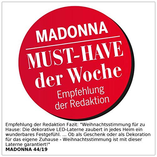 "Ideal as a gift and for decoration • Warm white light for a cozy atmosphere • Handle for carrying or hanging","Ideal as a gift or decoration for the holidays • Mini fan creates a snow whirl effect • Antique brass look and ornate base • Power supply: 3 AA batteries (please order separately)","Four-sided decorative lantern filled with water and glittering flakes • Warm white LED lighting • Continuous operation via on/off switch • Dimensions: 10.5 x 29 x 10.5 cm, Weight: 1.6 kg","Christmas decorated: Miniature Santa Claus with red hat, coat, sack and Christmas tree • Handle for carrying or hanging • Material: Plastic (PP)","LED lantern including German manual. LED lantern with snowstorm - Also relevant or suitable for: Christmas ball, Snowing, Snowfall, in snow, Christmas, snows, figures, Winter, Ball, big"
