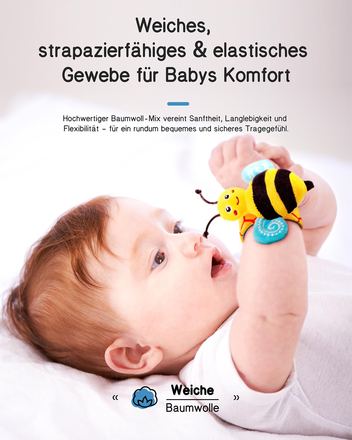 ["PROMOTES SENSORY EXPLORATION - The bright, colorful rattle socks promote baby's sensory exploration through sight, touch, and sound. Boys and girls are encouraged to reach for and grab the colorful wrist rattles and foot finders.", "COMFORTABLE FIT - This set includes two soft wrist rattles and two foot finders. The colorful wrist rattles and foot finders fit comfortably on the baby's wrists and ankles. Extended bands allow for continued use as the baby grows.", "JOYFUL BABY GIFT - Packaged in an exquisite gift box, this rattle sock set is a joyful gift for baby showers and a must-have for new mothers' baby registries.", "LOUDER FASCINATING RATTLE - The rattle socks and wrist rattles with contrasting patterns, bright colors, and enhanced, louder, fascinating rattle sound stimulate the baby's vision, interaction, and exploration.", "SAFE AND SOFT COTTON MATERIALS - Baby-friendly, soft materials are very safe for the baby to touch and even chew on."]