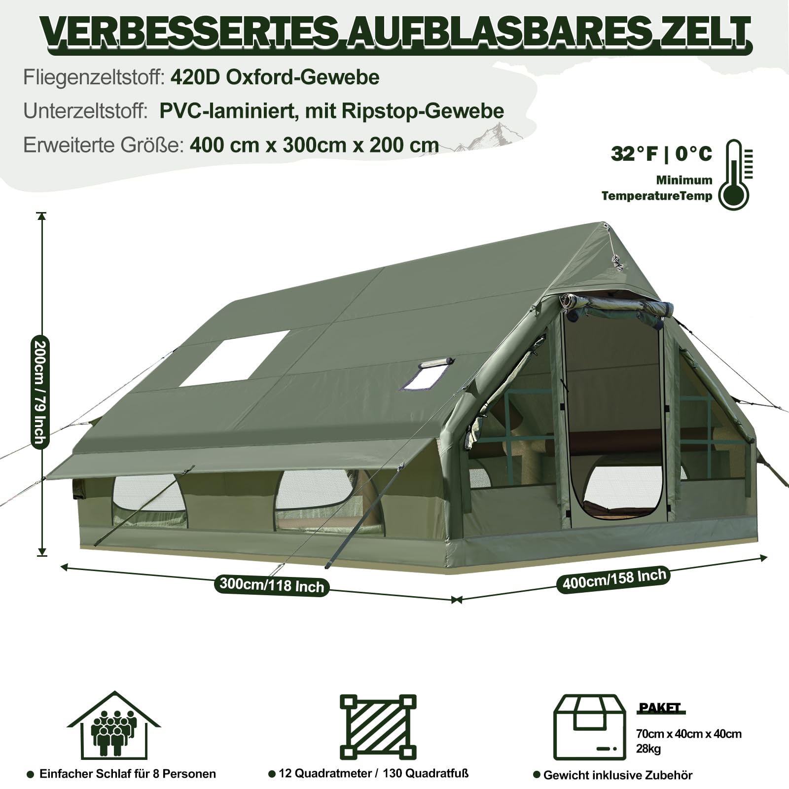 ["OXFORD CLOTH INFLATABLE TENT - The tent is made of 420D high-density Oxford fabric and abrasion-resistant SBS zippers that can withstand the temperature difference between day and night, with balanced waterproof and breathable performance. The waterproof surface is up to 3000mm, which is more effective in preventing rain and water from seeping in. It also has excellent UV resistance, suitable for four seasons.","12 PERSON CAMPING AIR TENT - The size of the inflatable tent is 157.5" x 118.1" x 78.7" after unfolding, it can easily accommodate 4-12 people. After deflation, you can put it in a 30.3" x 17.7" x 15.7" portable storage bag, easy to carry. It is the ideal tent for camping, picnicking, BBQ, traveling, and other outdoor activities.","BREATHABILITY & PRIVACY - The inflatable camping tent is equipped with three-dimensional screens, two mesh screen doors, eight mesh screens, two D-shaped arches with zippers, circulating ventilation, improved breathability and airflow. Double seam sealing and strong zippers increase the privacy of the camping tent, keeping you cool and comfortable. The top of the tent can accommodate a light string, enhancing the outdoor atmosphere.","5 MINUTES INSTALLATION - Our inflatable tent adopts TPU inflatable self-supporting structure, no need to manually install support poles, just inflate for five minutes to complete the installation. Thicker TPU support rods are more wear-resistant, abrasion-resistant, and cold-resistant, very suitable for camping, hiking, or festival use.","AFTER-SALES & TIPS - If you have any questions about the tent, please contact us. We provide 24/7 all-weather customer service and will provide you with a satisfactory solution within 24 hours. Please note that it is not recommended to use this Oxford tent in heavy rain for an extended period."]