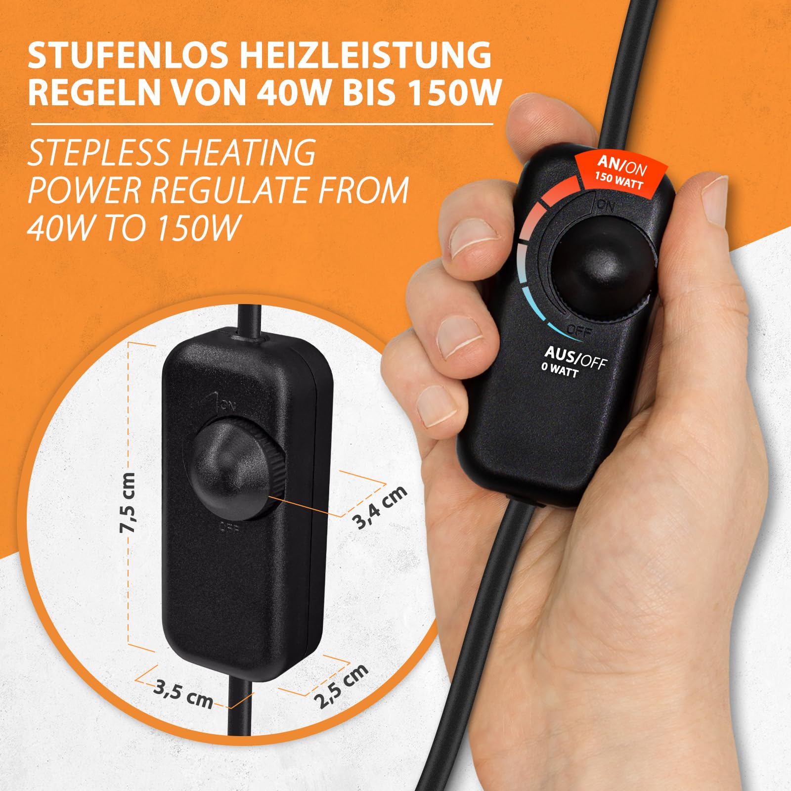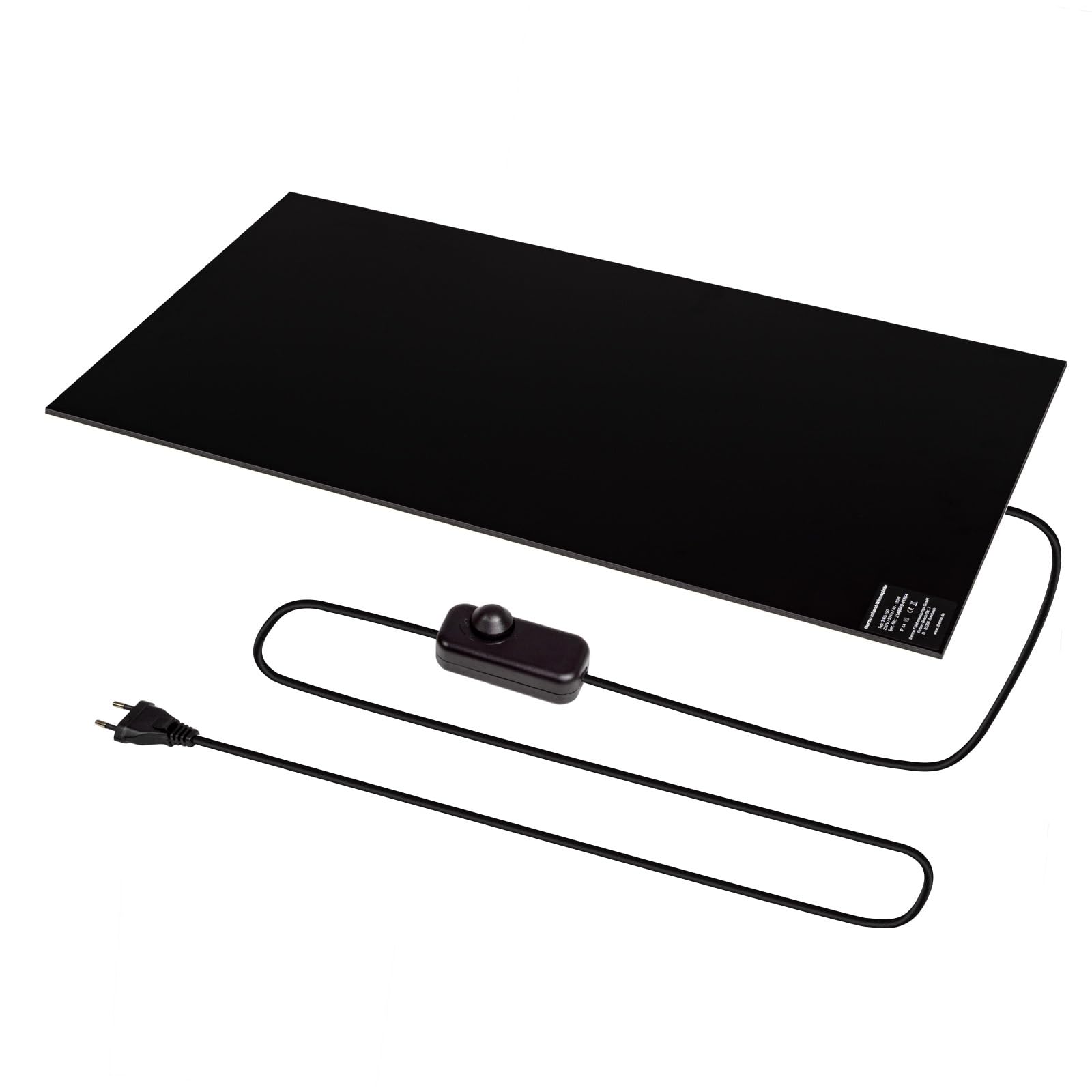 "Infrared heat plate with dimmer for continuous adjustment of desired temperature and integrated on/off switch. Adhesive back for mounting under desk, cash register, or sales area - Provides comfortable infrared radiation to warm feet and legs evenly. Easy installation: Peel off protective film and stick on flat surface. High-quality adhesive film securely holds the heat plate in place. The infrared heating element generates cozy radiant heat without causing dust swirls, making it ideal for allergy and asthma sufferers. Operating voltage: 230 volts; Max power consumption: 150 watts; Surface temperature: 75°C +/-10%; heat-resistant composite fiberboard, built-in temperature fuse, approx. 2.9m connection cable"