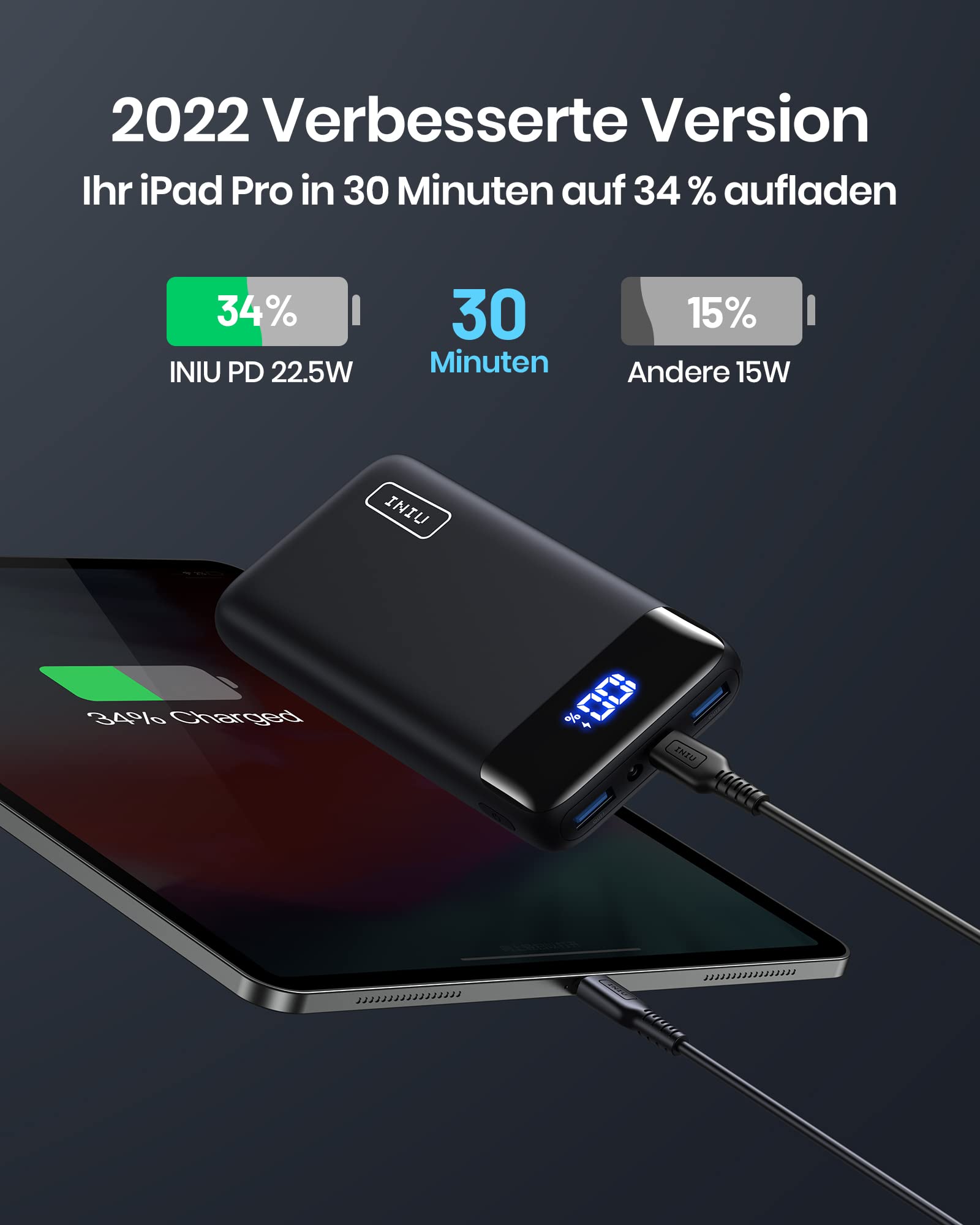 ["INIU - The safe professional for fast charging: Experience the safest charging with over 38 million users worldwide. At INIU, we only use the highest quality materials. Therefore, we are confident to offer an industry-leading 3-year warranty.","Charge your phone up to 61% in 30 minutes: With enhanced 22.5W power and the latest PD3.0 & QC4.0 fast charging technology, your phone can be charged to 61% in just 30 minutes. Charge your iPad Pro up to 34% in 30 minutes: Most power banks on the market cannot charge your iPad or charge it at a snail's pace. However, INIU with 22.5W high-speed output can charge all existing iPads, including the latest ones, at FULL speed.","2024 version USB-C input & output: Unlike most chargers that only have a USB-C input, INIU MegaPower 20W features a USB-C input & output, perfectly compatible with your new iPhones, iPads, and all upcoming USB-C devices.","Charge THREE devices simultaneously: With one USB-C port and two built-in USB ports, you can charge up to THREE devices simultaneously. Thanks to the three-port design, you can share this portable power bank with family and friends.","Charge small devices as well: Unlike most power banks that cannot charge low-power devices, INIU can work with not only all phones, tablets, but also smaller devices like AirPods, Bluetooth headphones, fitness trackers, smartwatches, etc."]