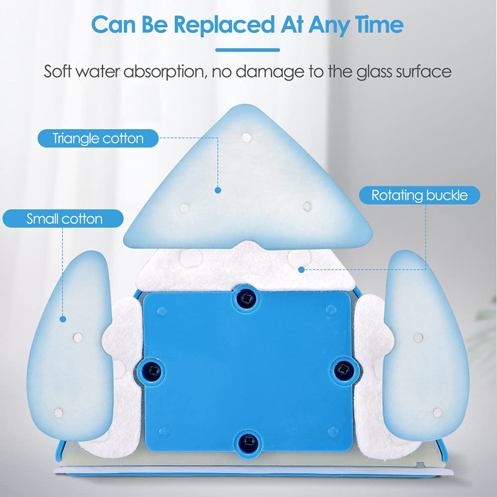 ["Double-sided magnetic cleaning: Double-sided magnetic glass cleaner with strong internal magnetism locks both sides of the cleaning and provides you with comprehensive cleaning anywhere. When you move one side, the other side follows.","Adjustable in five gears: The spacer can be adjusted according to the thickness of the glass and is adjustable in five gears, making it more convenient and easier to clean. However, it should be set slowly at the beginning of use to avoid glass breakage under excessive pressure.","More labor-saving triangular design: Designed with a triangular shape (with less friction), flexible rotation, making your hands acid-free and labor-saving. This window cleaner can wipe down to the narrow area of the window and clean corners without dead ends for more comprehensive cleaning.","High-quality materials: This magnetic glass cleaning wiper is made of high-quality ABS material, natural latex (stripper for car wipers), and neodymium iron boron magnet, powerful magnetic, non-toxic and harmless, soft and wear-resistant, corrosion-resistant. Built-in water storage sponge, no need for repeated water addition. Magnet and cleaning cotton are durable and can clean glass more effectively.","Wide application: This magnetic glass cleaner is suitable for 4-28 mm thick double-layer glass windows and is very suitable for cleaning family windows, windows, sliding doors, shower walls, or any 4-28 mm double-layer glass surface."]