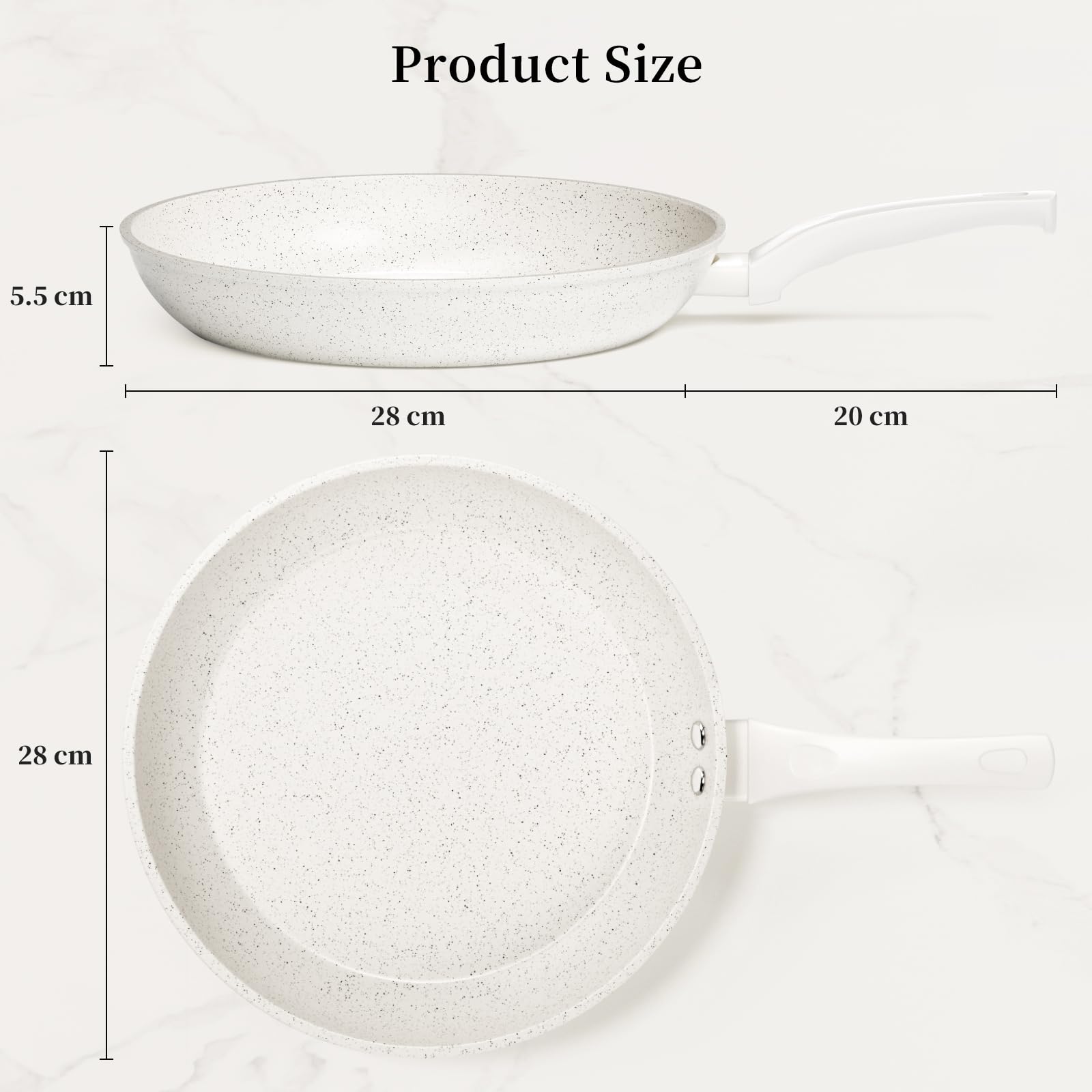 Innerwell 28cm non-stick frying pan with ceramic coating, induction compatible. Professional quality, ideal for omelettes and healthy cooking. Oven and dishwasher safe, white color, PFOA free.