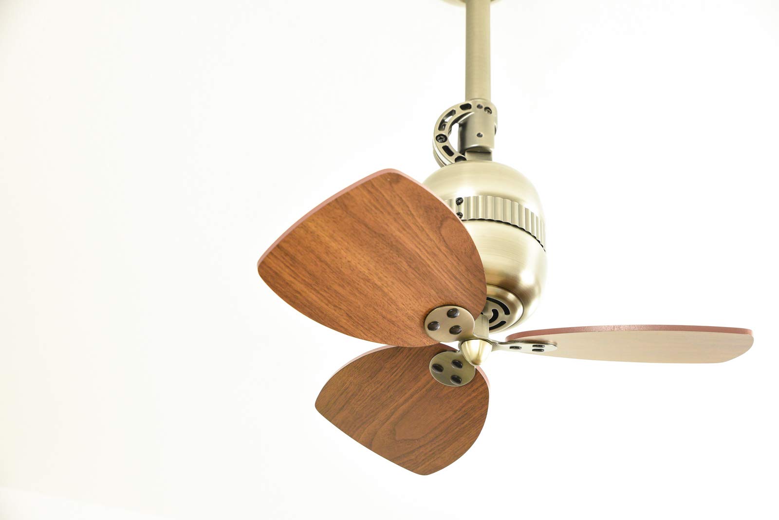 "Modern ceiling fan from the American quality manufacturer AireRyder, perfect for small spaces","includes wall switch to control the fan in four speeds - remote control as optional accessory available","Ceiling fan housing in antique brass, high-quality, durable and quiet alternating current motor","small diameter of 45.7 cm for small spaces / blades in walnut (walnut wood look)","adjustable in three different angles / installation on slopes possible"