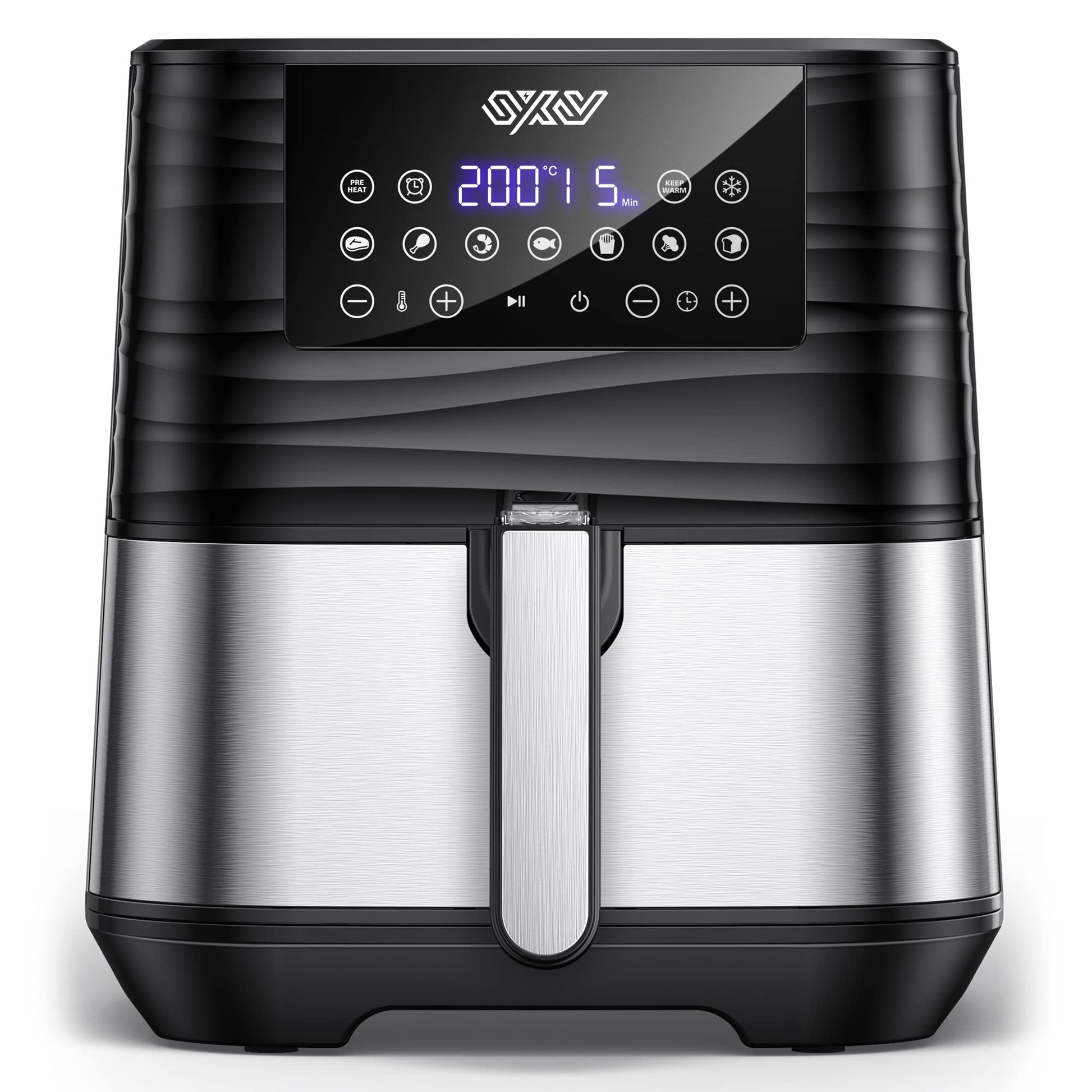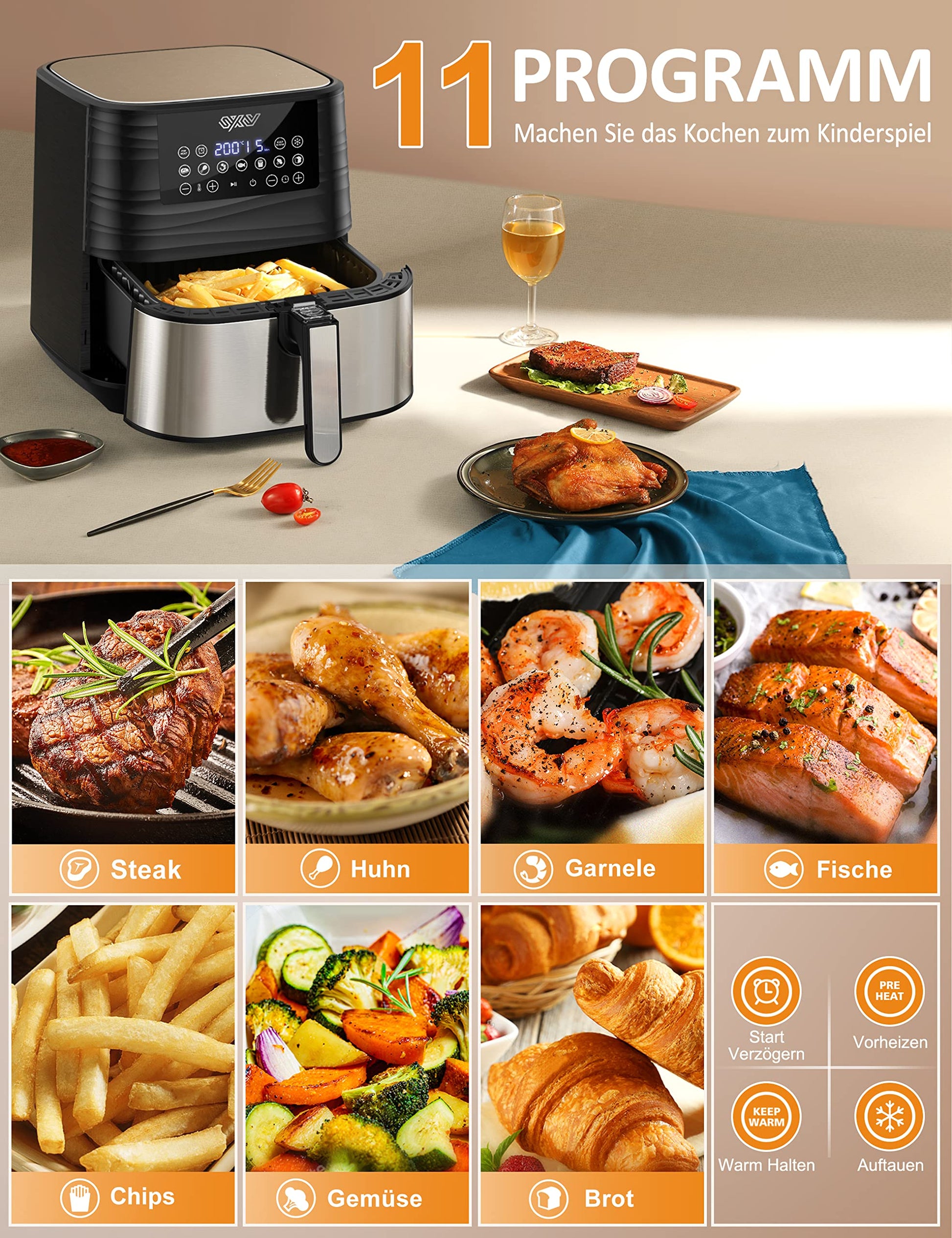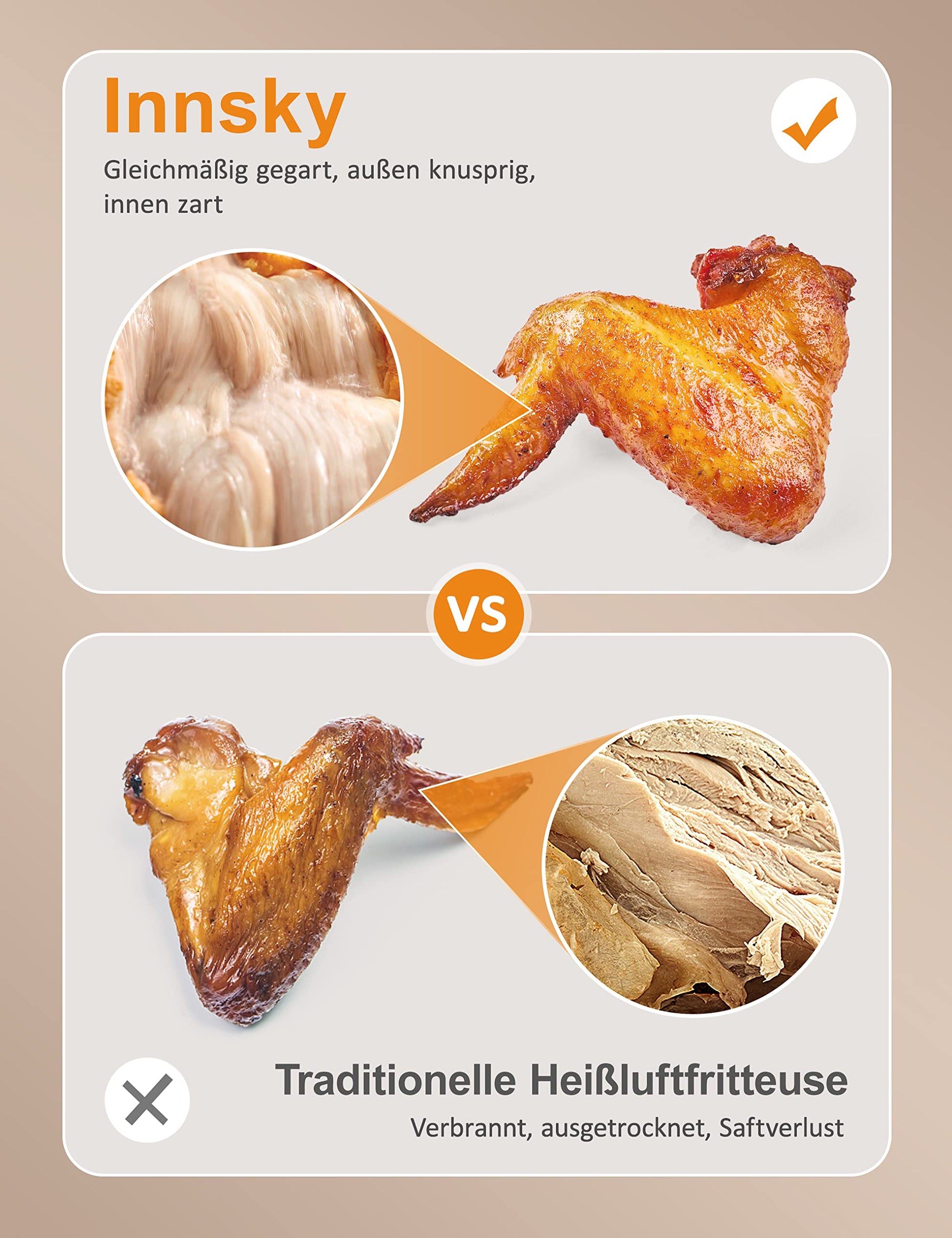 ["NEW 4 FUNCTIONS: The Innsky Air Fryer has been upgraded again! 4 functions have been added for preheating, thawing, keeping warm, and timing. The adjustable preheating visibly improves food texture and helps cook the food quickly and thoroughly. It only takes 2 to 5 minutes, making dishes brighter and tastier!","HEALTHY EATING: The working principle of the Air Fryer is that food is cooked around 360° through the hot air fryer. It uses the Maillard reaction principle, ensuring that fries become crispy and chicken juicy, while reducing oil volume by 85%. You don't have to worry about losing flavor, the finished food tastes just as delicious as when fried.","FUN COOKING: The LED display has 7 cooking presets, you just have to select one to easily prepare your favorite dishes. There are also temperature settings (80-200°C), timer settings (up to 60 minutes), and reservation function (up to 12 hours). With its high 1700W power, it can heat up immediately, saving not only oil but also time.","SAFETY AND EASY: Non-stick frying baskets make cleaning easier and are dishwasher safe. Open the transparent plastic cover on the handle and press the button to remove the basket. This makes it very easy to safely remove the food and clean the basket.","UNLIMITED COOKING POSSIBILITIES: The square basket holds 5.5 liters of food and can prepare delicious low-fat foods for 5-6 servings. Of course, don't limit your imagination. There are endless possibilities for dishes. With a free recipe book (DE/FR/IT/ES), cooking becomes child's play!"]