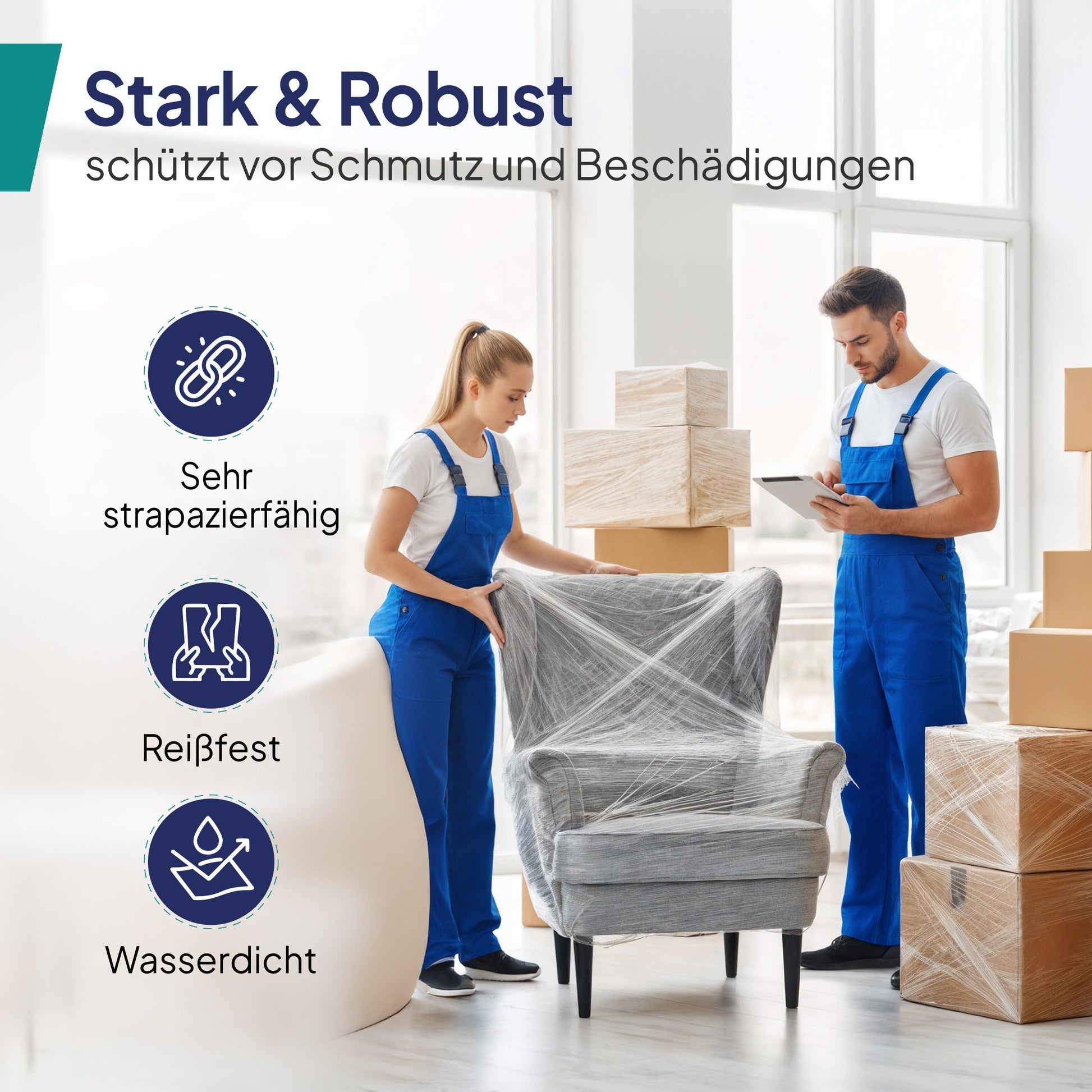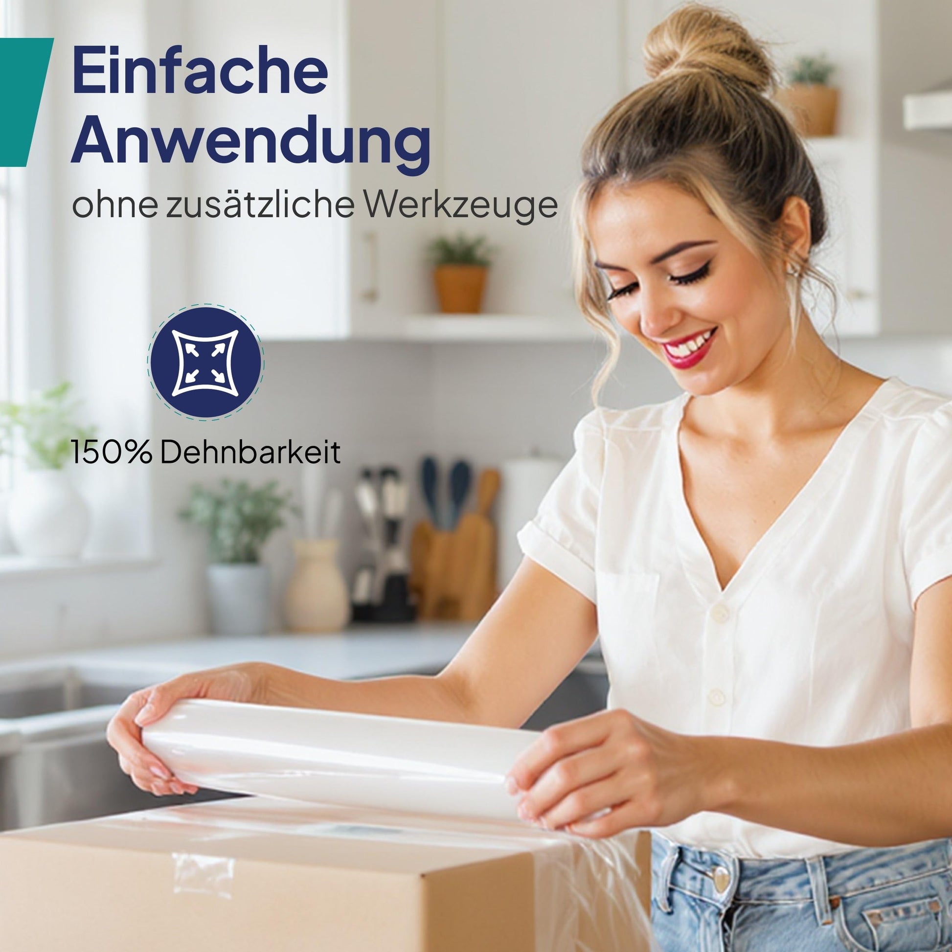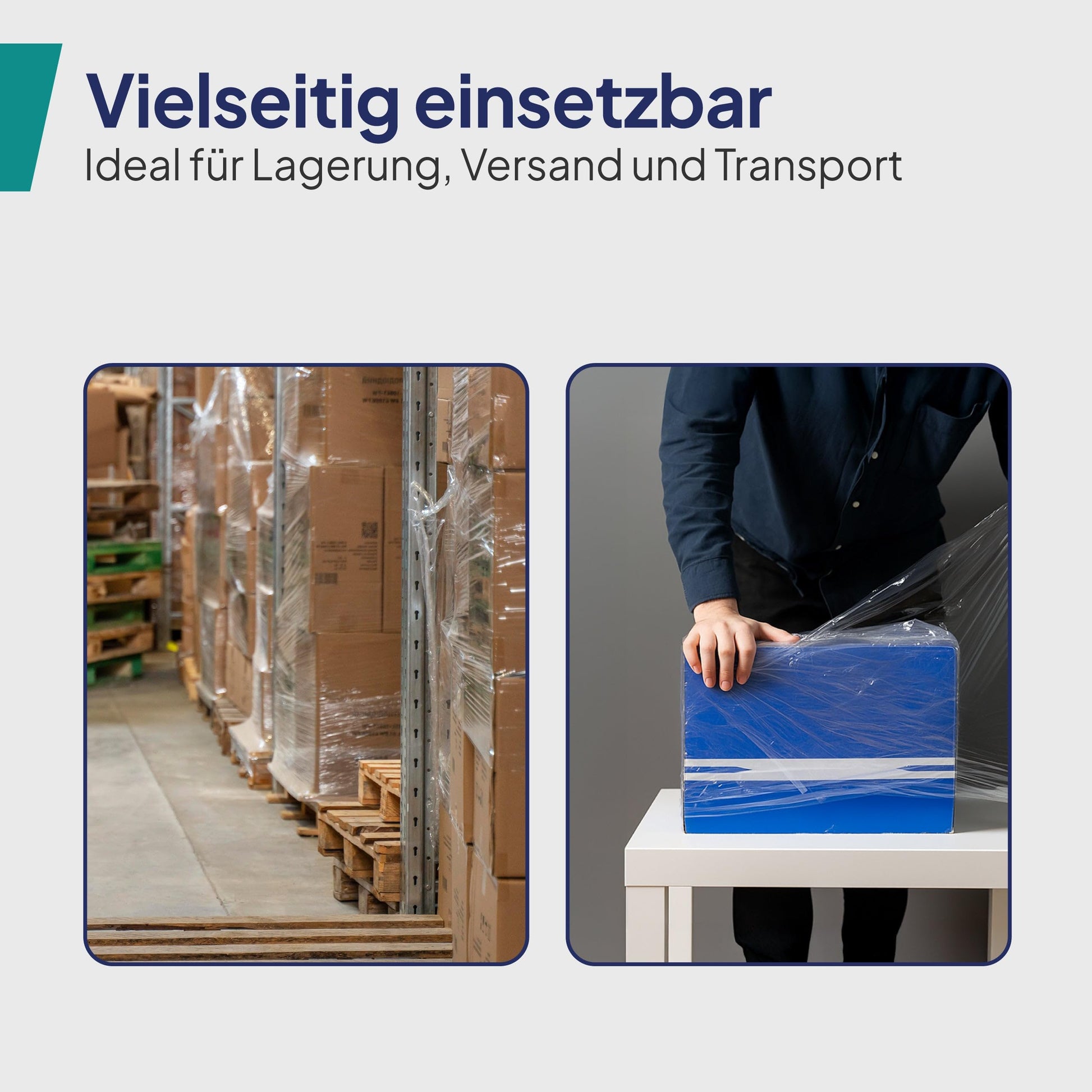 ["PACKAGING, SECURING & TRANSPORTING - The flexible packaging film provides multipurpose protection for all types of commercial, industrial, and private packaging applications.","FLEXIBLE INDUSTRIAL MATERIAL - Premium stretch film with 21 microns for reliable puncture-resistant performance and easy application without a film dispenser. Includes: 2000 grams in weight, 50 cm in dimensions, 6 rolls.","PROTECTS AGAINST DUST, DIRT & DAMAGE - The shiny outer surface of the shrink wrap actively repels dirt, oil, and dust particles, helping to preserve the contents for long-term storage and land transport.","HAND-HELD & EFFORTLESS TO APPLY - The convenient self-adhesive film texture and excellent adhesion of the stretch film make it easy to use.","CLEAR SURFACE FOR EASY IDENTIFICATION - Transparent pallet wrap perfect for applying labels and distinguishing product boxes in warehouses, receiving docks, and other shipping, freight, and storage environments."]