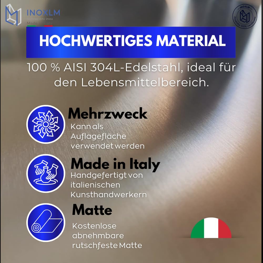 ["๐ฏ[100% HIGH-QUALITY STAINLESS STEEL]: The stainless steel cutting board from XLM is a professional product of the highest quality. Completely made of Stainless Steel AISI 304, this cutting board with edge is ideal for any food application. Made from non-stick material to ensure dough does not stick to the surface, making your work hassle-free. It's no wonder why professional chefs use steel boards for their gastronomic preparations.","๐ฎ๐น[100% MADE IN ITALY]: Designed and conceptualized in Italy, this large cutting board was crafted by professional craftsmen who work with stainless steel expertise and passion. They transform this elegant and refined metal into a work of art. Modern and minimalist design that fits in any kitchen. The satin finish adds extra prestige to the product, ensuring the shine is maintained over time without dulling during use.","โ