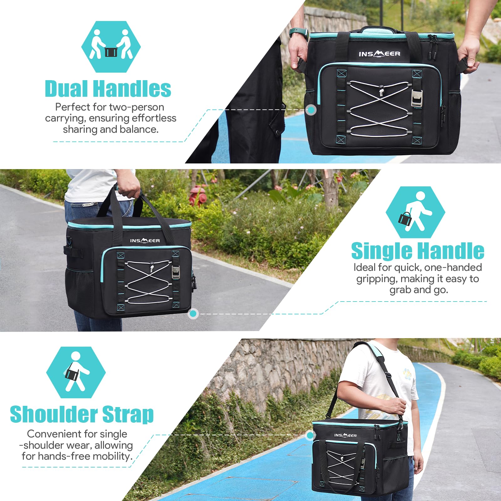 ["Large Capacity with High Storage Space】INSMEER 55L large cooler bag measures 44 x 36 x 35 cm (L x W x H), which can hold 90 cans (330 ml) or 25 bottles (500 ml). It is suitable for many occasions such as beach, picnic, BBQ, shopping, camping, outing, and food transport, keeping everything necessary outdoors.","【High Insulation Performance】This large picnic bag features a 7mm thick insulation layer of EPE foam and PEVA fabric, keeping your food warm or cold for hours. The food-grade interior lining is leak-proof and dirt-resistant, making the foldable cooler bag fully functional, reusable, and easy to clean.","【New Added Features】This foldable, soft picnic bag stands out with a compact and attractive design with many details. Two mesh pockets provide additional storage space for water bottles. An additional bottle opener on the front of the bag enhances user-friendliness. The wear-resistant material on the bottom makes the cooler bag more durable.","【Portability and Durability】The large cooler bag offers three carrying options. An adjustable shoulder strap with thick padding reduces the strain when carrying the bag over the shoulder or body. Two reinforced handles on the sides allow for another carrying option. In addition, sturdy zippers ensure that the cooler can be easily opened and closed effortlessly, making it convenient to take it anywhere.","【Quality Guarantee】Each cooler bag is backed by us. We stand behind our products and are confident that our large cooler bag will meet the needs of our customers. Our customer service is available around the clock, and you can contact us anytime via Amazon. In case of quality issues, we offer free exchange or refund."]