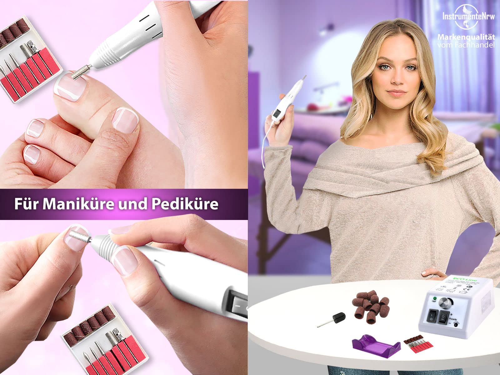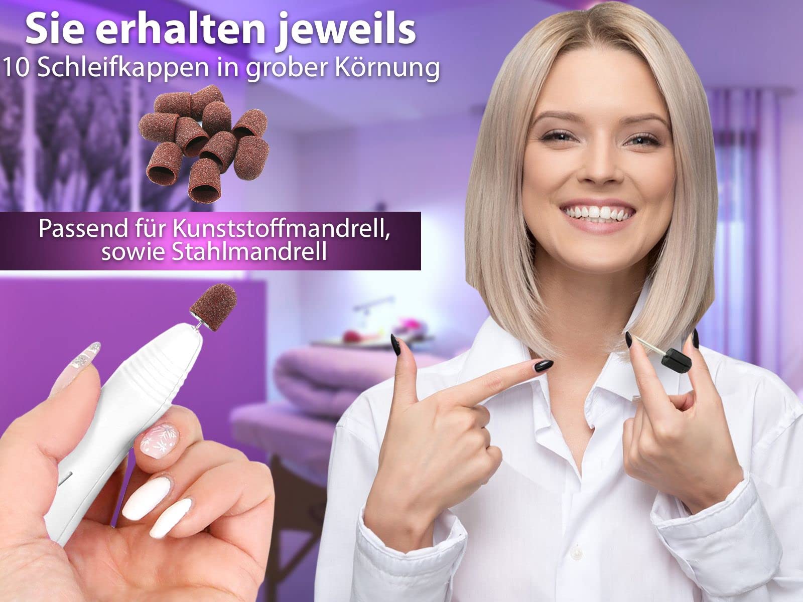 ["ELECTRIC MANICURE/PEDICURE SET - Professional hand and foot care for home and travel. Special set for callus removal (grinding caps). The device is characterized by easy handling. (State-of-the-art technology) Very quiet - Powerful micro motor","CALLUS SET ACCESSORIES - The set includes a 13mm grinding cap holder + 10 13mm diameter grinding caps, ideal for callus removal","PLUG FUNCTION - The bit change is TOOL-FREE. Quickly and effortlessly change your desired drill bits. Easy insertion and removal of individual bits. The handpiece is 13 cm long and weighs approximately 100g","EQUIPMENT - Complete set includes 1 x handpiece, 1 x control unit, 1 x handpiece stand, 5 x diamond grinders, 2 x grinding sleeve holders, 6 x grinding sleeves, 10 x grinding caps for callus removal","NEW GENERATION - This drill is part of the new generation of professional electric foot care sets, with a speed range of 0 to 20,000 RPM. Drill bits with a diameter of 2.35 mm (EU standard) can be used. Balanced lightweight handpiece ensures clean work","Premium quality from specialized trade - We are a family-owned company based in North Rhine-Westphalia (Germany). Craftsmanship tradition, state-of-the-art technology, high-quality materials ensure the consistent quality of our product range. The wishes and demands of our customers are at the center of our business philosophy"]