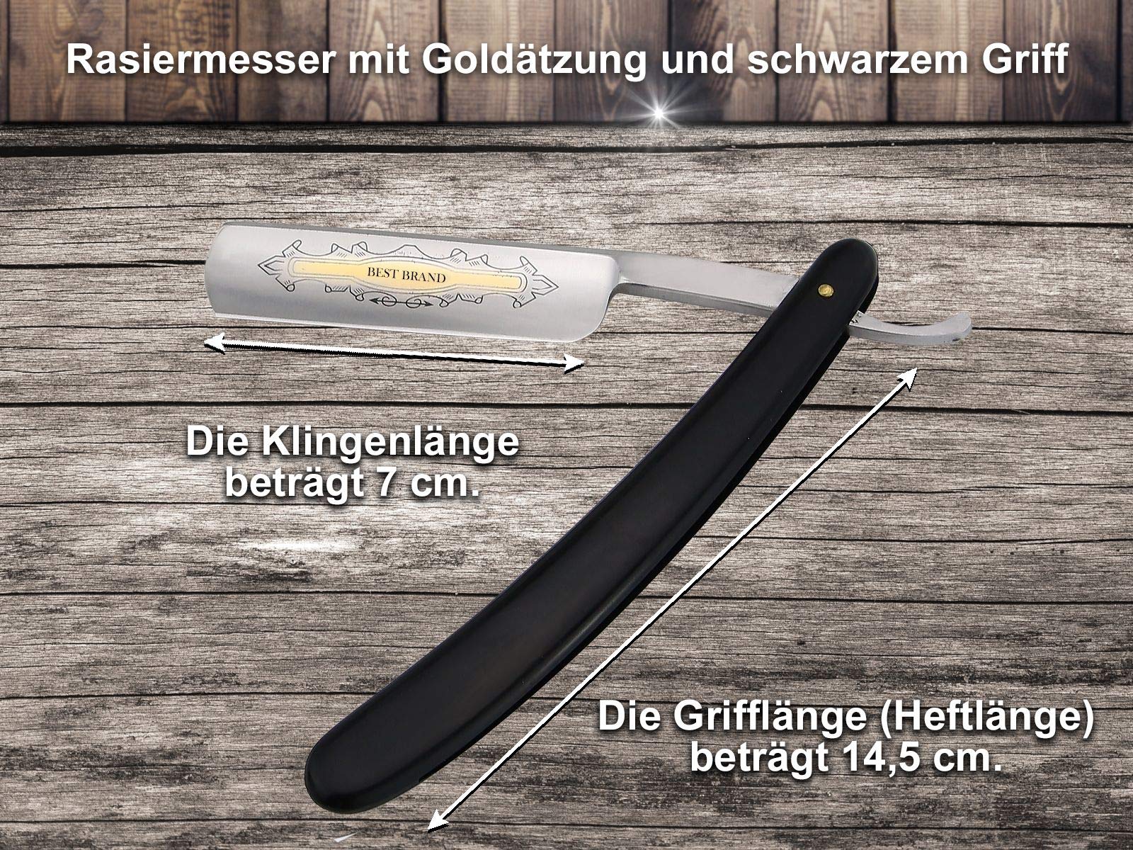 Straight razor with gold etching and brown real wood handle. Elegant wood handle variant. The blade spine is intricately processed with flutes, a real highlight. The handle scales are ergonomically shaped. Very high quality. Easy to clean. The blade is hollow ground. Ideally suited for beginners. Blade length: 2.75 inches, blade height: approx. 0.83 inches (5/8 inch). Genuine handcrafted. Made (blade) from straight razor steel.