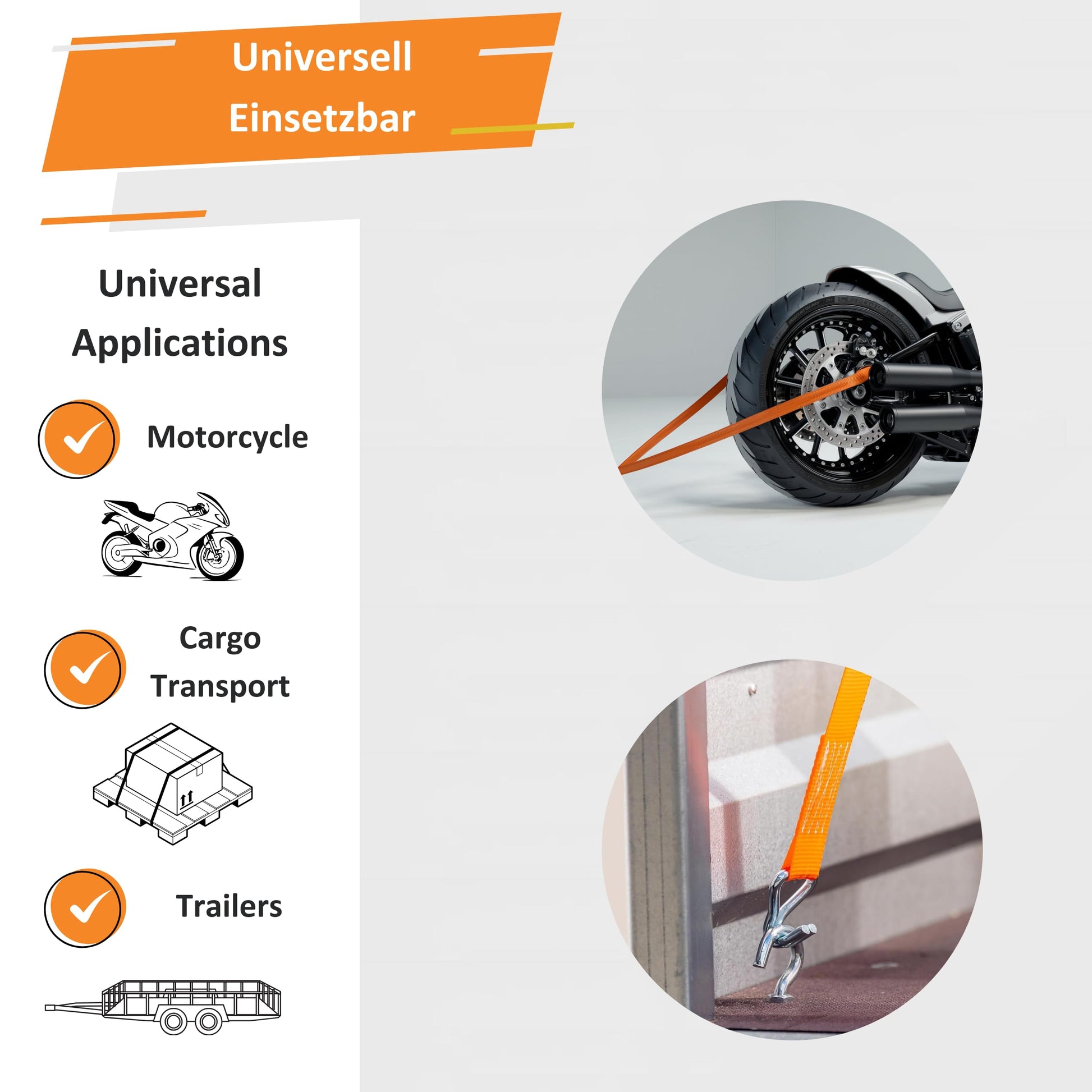 ["RATCHET SET (4 PIECES) - 4 ratchet tie-down straps, capacity 4400 lbs. Width of the strap is 1.38 inches. Length 19.7 ft (18 ft strap with hooks). Labels with legal information are attached to the strap and the ratchet.","QUALITY CHECKED - To ensure the highest safety standard for our customers, our tie-down straps are manufactured according to the DIN EN 12195-2 standard. Additionally, the ratchet straps are very durable woven! They are also approved and certified by TÜV GS.","TRUST & SAFETY - Peace of mind for you that your motorcycle, kayak, canoe, ATV, furniture, boxes, garden tools, or any cargo are securely and reliably fastened during transport. Our tie-down straps provide optimal safety in any situation.","EASY TO USE - Thanks to the robust ratchet, the tie-down straps can be quickly and effortlessly tensioned and released. Once tightened, the straps can only be opened by releasing the ratchet.","VERSATILE SET - Includes 4 ratchet tie-down straps, making it the ideal solution for various transport applications. It offers optimal safety and effective protection for your cargo."]