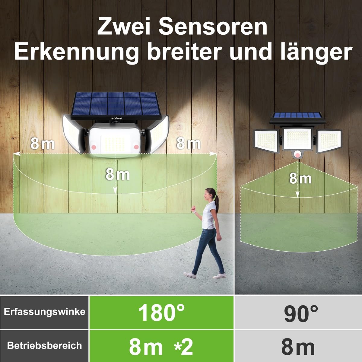 ["Giant-Wide Angle Illumination: intelmap super bright solar lamp with motion sensor, 108 LED beads with high brightness (brightness up to 1200 lumens). When the LED wings are unfolded, the light spread angle can reach up to 270 degrees. This intelamp solar lamp design illuminates an area of approximately 70 square meters, allowing for easy orientation and excellent visibility of details.","2 PIR Sensor-4 Lighting Modes: intelamp solar spotlight with motion sensor features a dual-sensor design that detects movements over a much larger area than single-sensor models, providing 180-degree area recognition. Covering an entire wall width with their 180-degree arrangement, even triggering when approached from the side. The detection range extends up to 10-16 meters. intelamp Solar lights have 4 lighting modes for your selection, meeting your different requirements.","Remote Control: intelamp Solar lamps come with a large and simple remote control, allowing for easy adjustment of powerful function settings. Unlike other solar sensor lights that are only bright for 30 seconds, intelamp LED solar spotlight can adjust the detection time for highlighting to 20 seconds, 30 seconds, and 40 seconds, ensuring the bright solar lights do not switch on in weak light.","High Efficiency, Energy Saving and Environmental Protection: The very large solar collector collects light effectively, providing power for the battery. intelamp outdoor weatherproof solar lamps use a safe 6000mAh lithium iron phosphate battery with super large capacity, enough for more than a whole night based on the duration of sunlight exposure. A silicon solar panel with a high conversion rate of 22%, enduring more than 2000 charge cycles and a long lifespan.","Easy Installation with 2.7m Cable: The intelamp Solar LED spotlight with outdoor motion sensor comes with screws and cable ties. You can attach it to the wall or to a stable pole like a lantern post using the cable ties. The solar panel comes with a 3m long cable and can be installed in a location with sufficient sunlight for optimal charging (ideal installation height is about 1.7 to 2 meters).","【Worry-Free After-Sales Service】intelamp Solar lights provide a complete set of installation accessories and a worry-free after-sales service. Please test the product's functionality upon receipt before installation and use. If any issues arise during use, feel free to contact our after-sales support."]