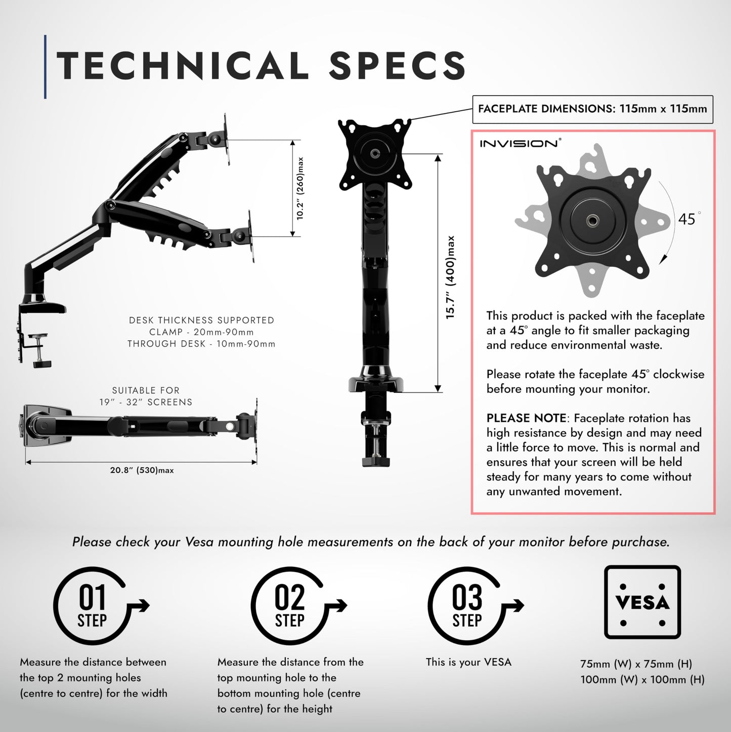 Invision Monitor Mount for 19-32 inch screens, VESA 75 & 100mm Single Arm Desk Clamp Stand, Adjustable Height with Tilt, Swivel, Rotate, Increased Weight Capacity of 2-9kg (MX200)