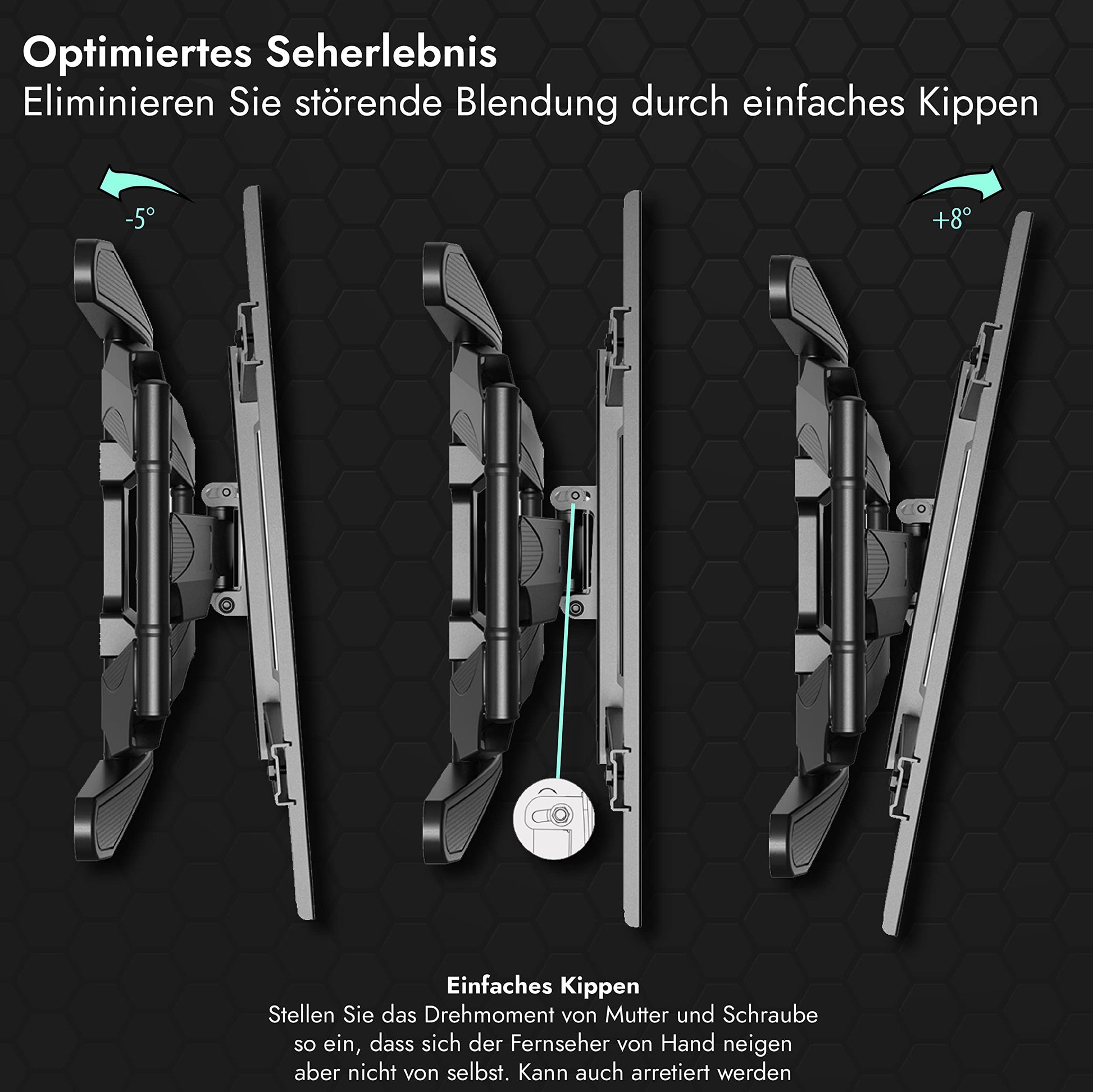"OPTIMIZED VIEW - Easily adjust viewing position. Eliminate annoying glare with simple tilt operation and adjust your viewing angle up to 160° horizontally from left to right (depending on your TV's width) and -5° to +8° vertically. For more details, please refer to the description images",