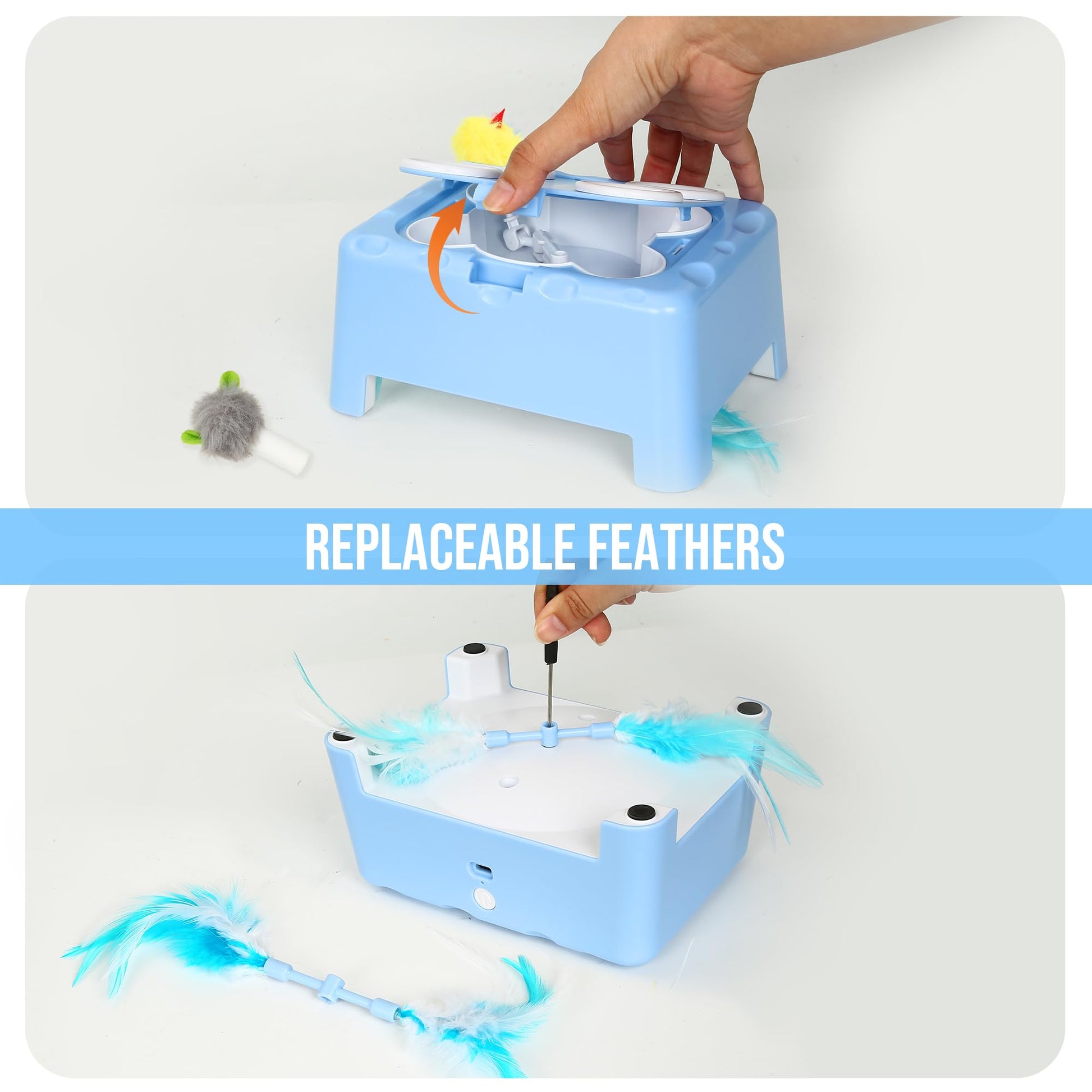 ["2-in-1, 3-Mode Mouse-Cat Toy: Impress your cat with this motorized toy where a mouse unpredictably jumps out of 4 holes - perfect for an exciting 'whack-a-mole' game! Below the housing, a colorful feather moves in random patterns, intensively stimulating your cat's natural hunting instincts and testing her hunting skills.","Durable & safe ABS material: Made of high-quality ABS material, this toy ensures a safe playtime for your cat. Its sturdy square design resembles a charming cheese house and withstands rough play.","Smart simulation system with autopause: Equipped with an intelligent autopause function, the toy stops after 15 minutes of play to avoid overstimulation, and restarts after a 5-minute break before automatically turning off to maintain interest and reduce tension.","Rechargeable battery with long-lasting runtime: Includes a built-in rechargeable battery that allows for a long playtime. The included charging cable can fully charge the battery in 2 hours - ideal for indoor and outdoor use.","Versatile with interchangeable accessories: Comes with various interchangeable accessories, including a mouse, a chick, two feather rods, and a screwdriver for easy replacement. Lightweight and portable, this toy can be placed in various indoor or outdoor locations."]