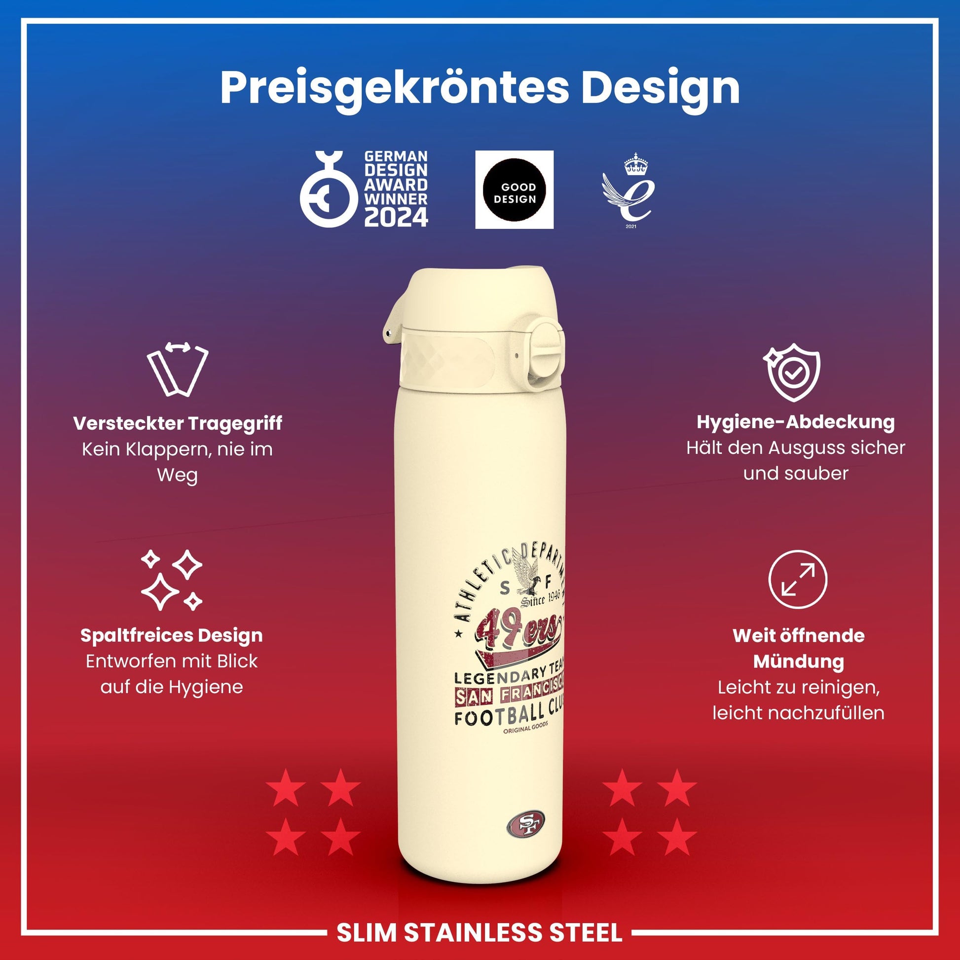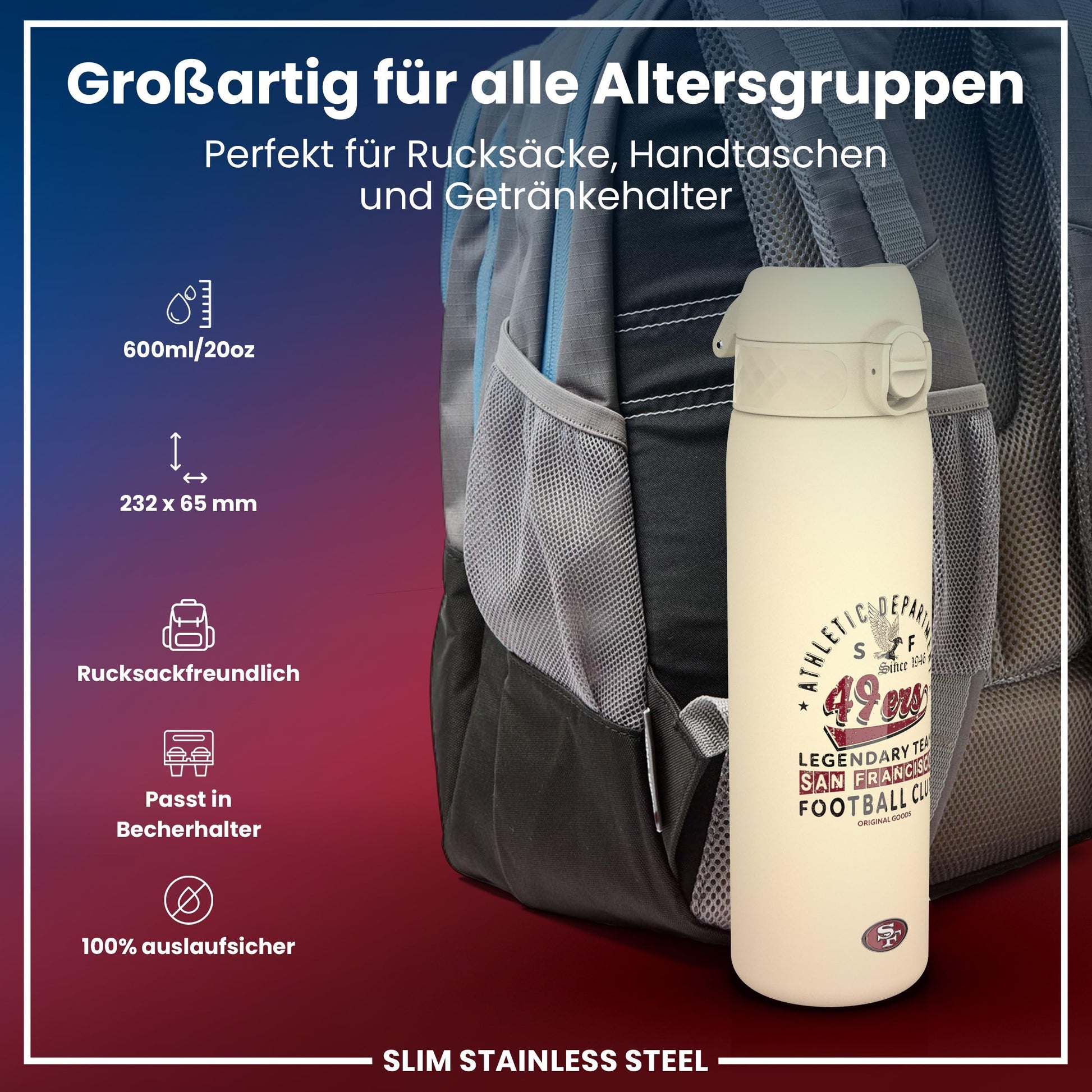 ion8 NFL E 49ers Lightweight Stainless Steel Water Bottle, 600ml/20oz, non-insulated, leakproof, easy to open, secure seal, dishwasher safe, flip lid, fits in cup holders.