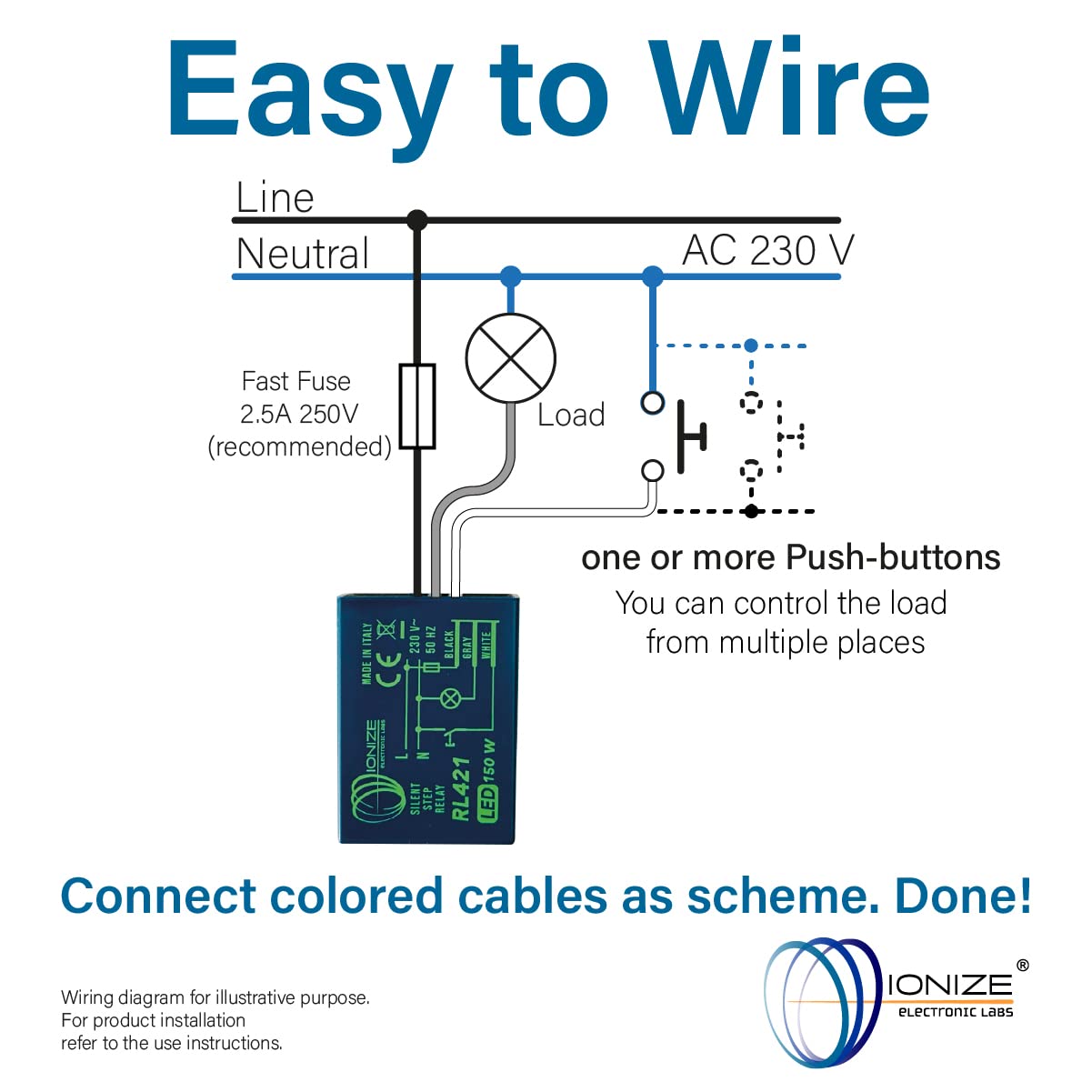 ["3-Wire connection: Phase, Load, Pushbutton to Neutral (do not connect the pushbutton to the phase). If in doubt about the connection of the object to the electrical system, contact the seller.","Also reacts to short button presses","Resin for maximum silence","Self-consumption: none","Installation in flush-mounted boxes"]