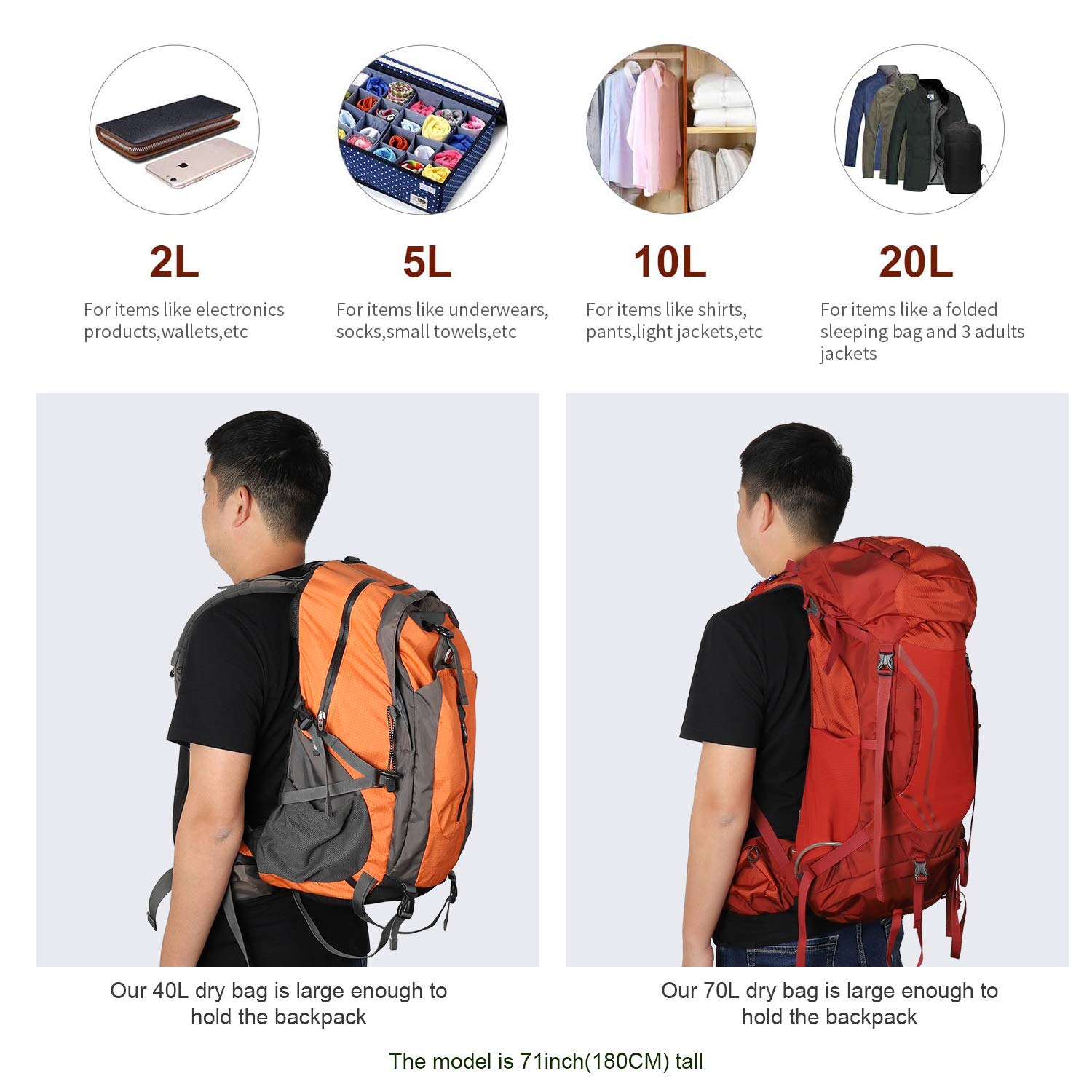 ["Widely used"]: You can use these dry bags anywhere to keep your valuables dry/clean/organized. At home, traveling, backpacking, kayaking, swimming, fishing, camping, canoeing, sailing, boating, rafting, hiking, snowboarding, etc.