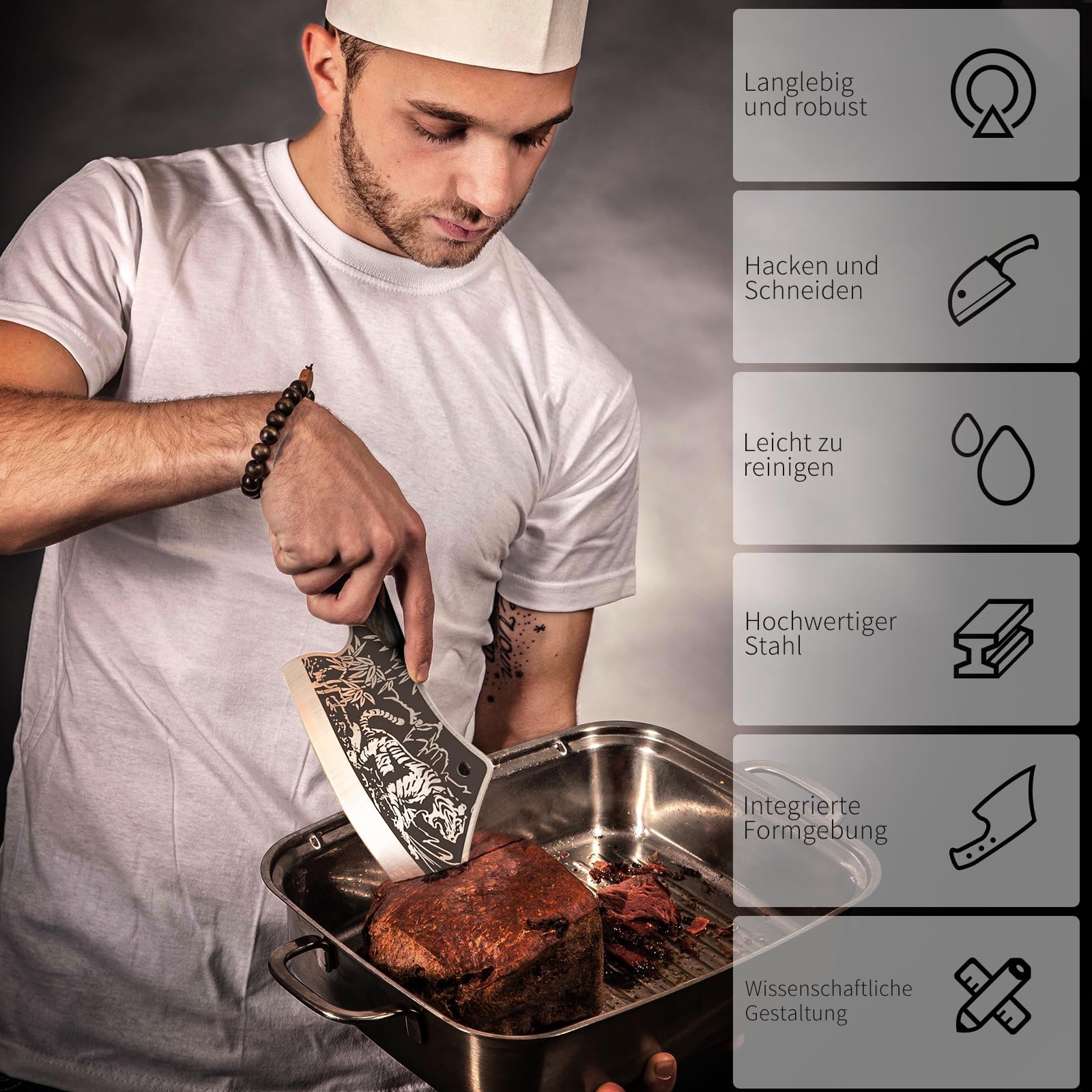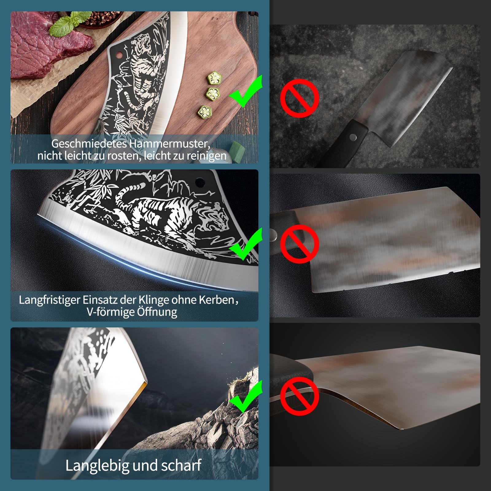 ["Sharp Blade - Japanese chef's knife in Samurai style, steel blade imported from Japan, provides ample cutting power with minimal effort, the blade edge is truly sharp. Its moderate weight is perfect for cutting through soft bones of ribs, chicken, fish, etc., but sharp enough to make precise cuts in smaller, more delicate pieces of food and vegetables. A must-have for all fans of high-quality knives or a beautiful addition to a knife collection.","Ready for Adventure - With a portable sheath, you can easily carry this solid kitchen knife for your outdoor activities. An outdoor partner for camping, hunting, fishing, hiking, and adventure. The cleaver has cool tiger patterns carved into the steel, making it super cool and attractive on your BBQ in the garden.","Multipurpose Kitchen Knife - This durable kitchen knife is perfect for chopping chicken, pork, lamb chops, and steaks. Easy cutting of fish, fruits, and vegetables, suitable for home and restaurant kitchens. A fabulous looking and functional chef's knife that you should have.","Useful and Unique Design - The unique blade design makes it durable, resilient, and rust-resistant. The ergonomic full tang handle provides a non-slip, secure, and comfortable grip. The handle and blade are formed in one piece with 3 strong steel nails to prevent the handle from tearing. (Please wash the chef's knife after each use and dry before storage.)","Ideal Gift - The portable chef's knife is your ideal kitchen helper for butchery, fishing, camping, and outdoor grilling activities. It is definitely an ideal gift for your lovers, family members, and friends who love cooking and knives. We offer a 12-month warranty and a 30-day return policy without giving reasons. No-risk purchase!"]