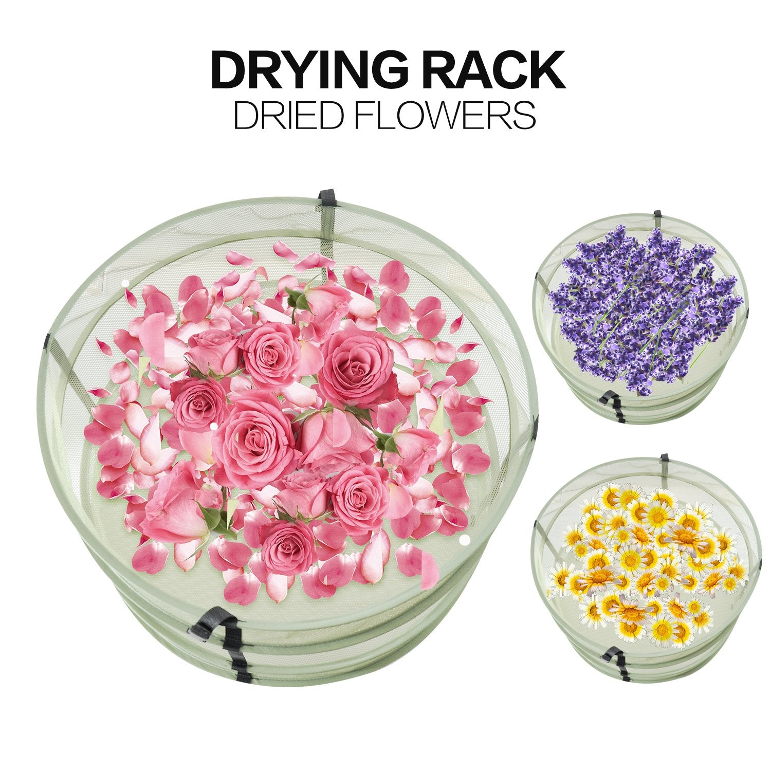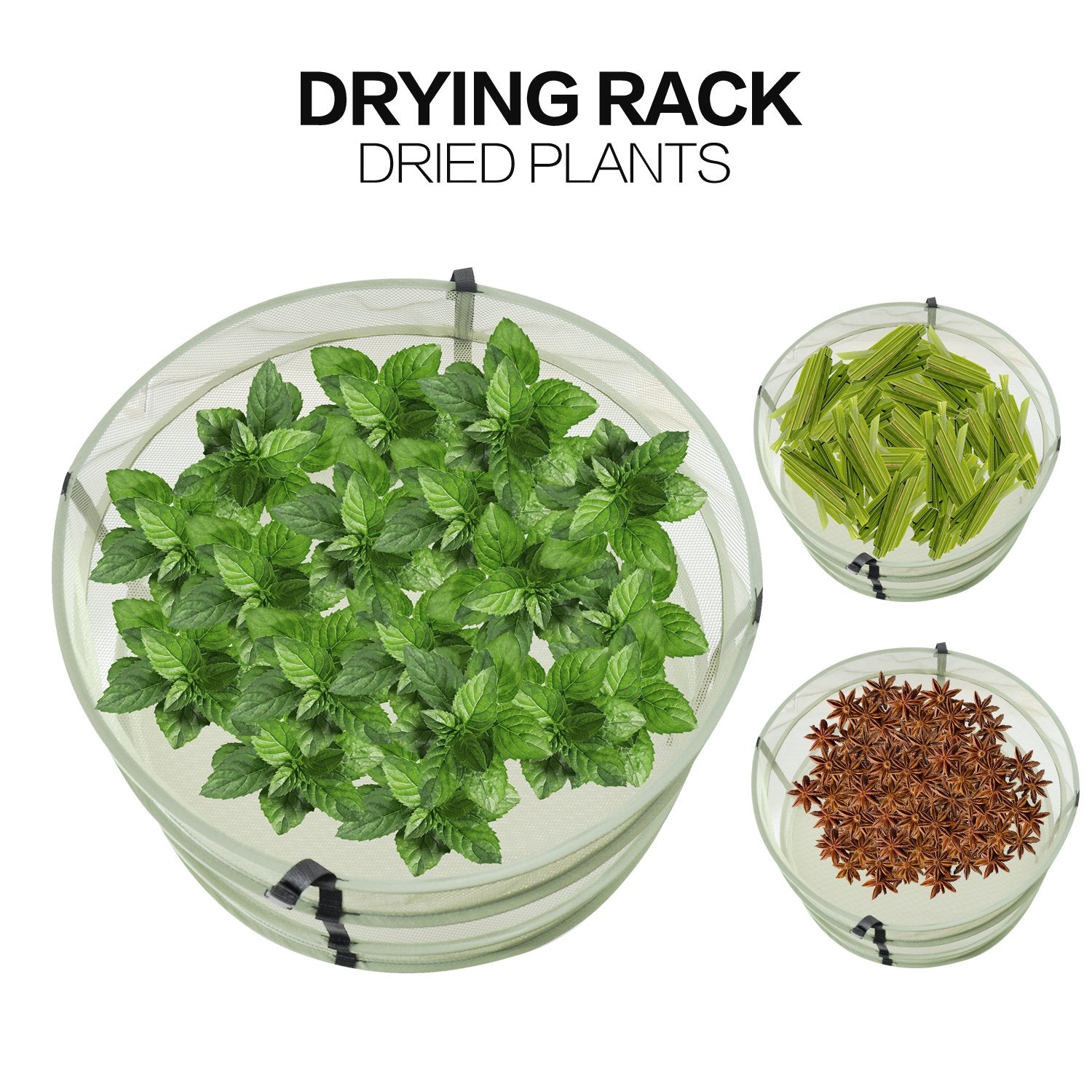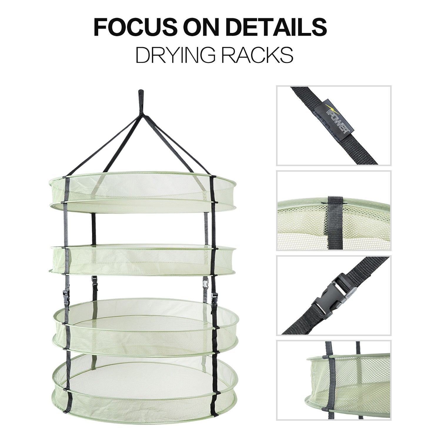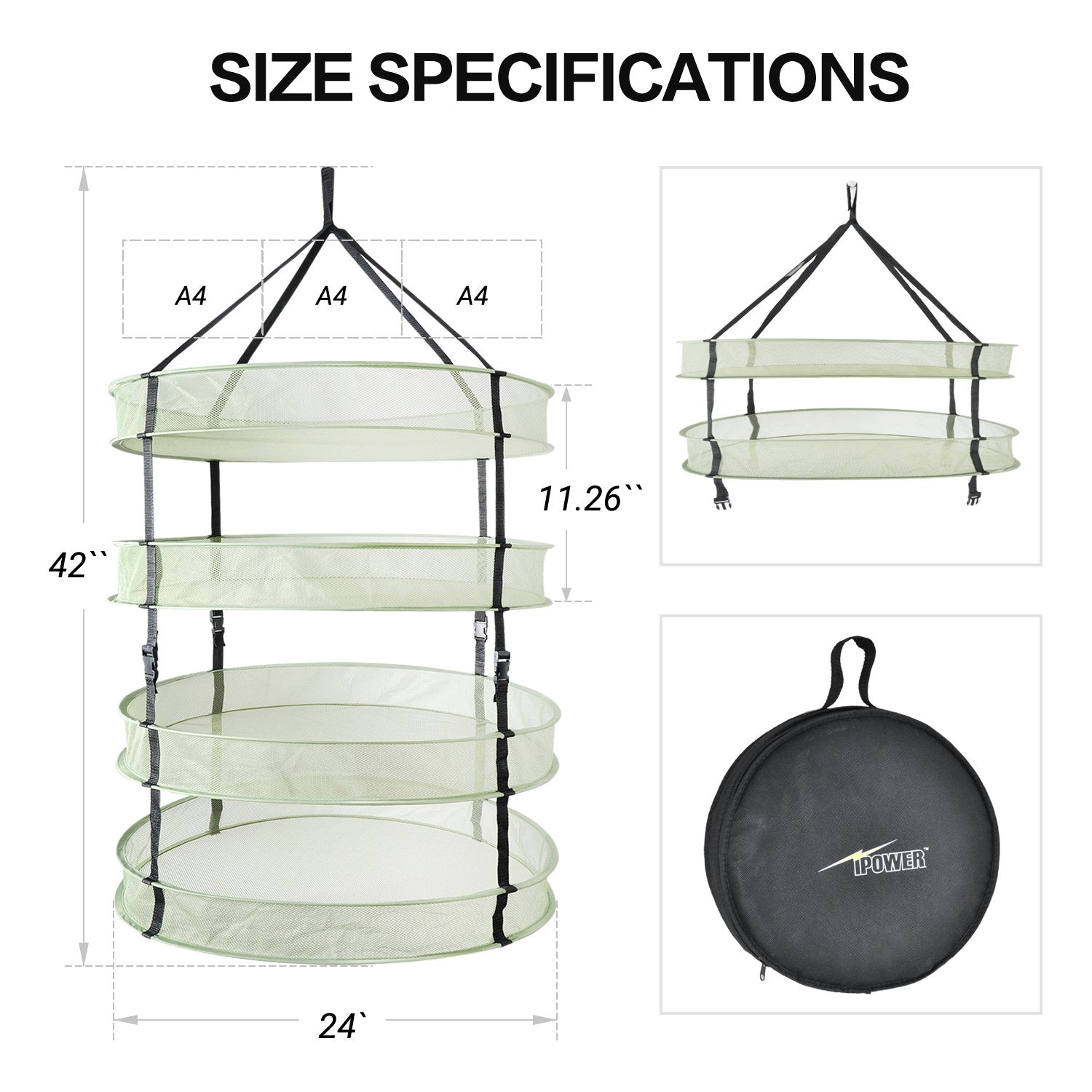 ["Size: 24 inches diameter, 4 layers. iPower plant drying rack can be removed in 2 independent sections, each section has 2 layers.","Material: Eco-friendly. Breathable nylon net, integrated steel wire ring for stability. No need to worry about rotting. Easy to clean.","Foldable design: each 2 layers removable. 4 individual drying chambers that can be modified into 2 or 4 layers. Easy foldable design allows for quick and efficient storage, vertical design ensures very efficient use of space.","【Suitable】Perfect for various plants such as herbs, flowers, some vegetables, and so on. Can be hung anywhere, outdoors, on the ceiling, in the greenhouse, in the garage.","Packaging: Foldable design can be folded into a small package for easy carrying, very space-saving when not in use. Tip: Be careful when opening the package, these nets will jump out."]