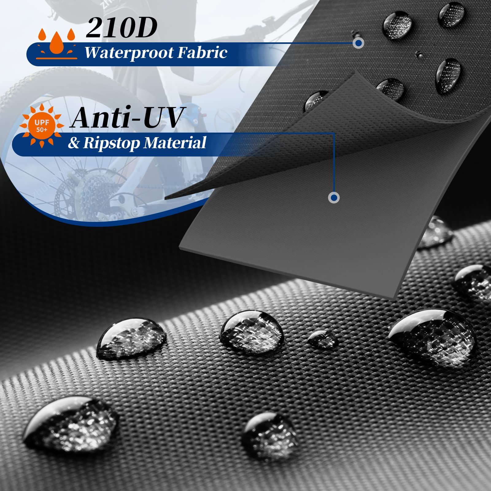 "High-quality 210D Oxford Fabric: Our bike covers are made of high-quality 210D Oxford Fabric, 210D material with double-sided seams, thick and wear-resistant, each thread consists of 210 high-density threads, excellent performance, the best choice for making bike covers.