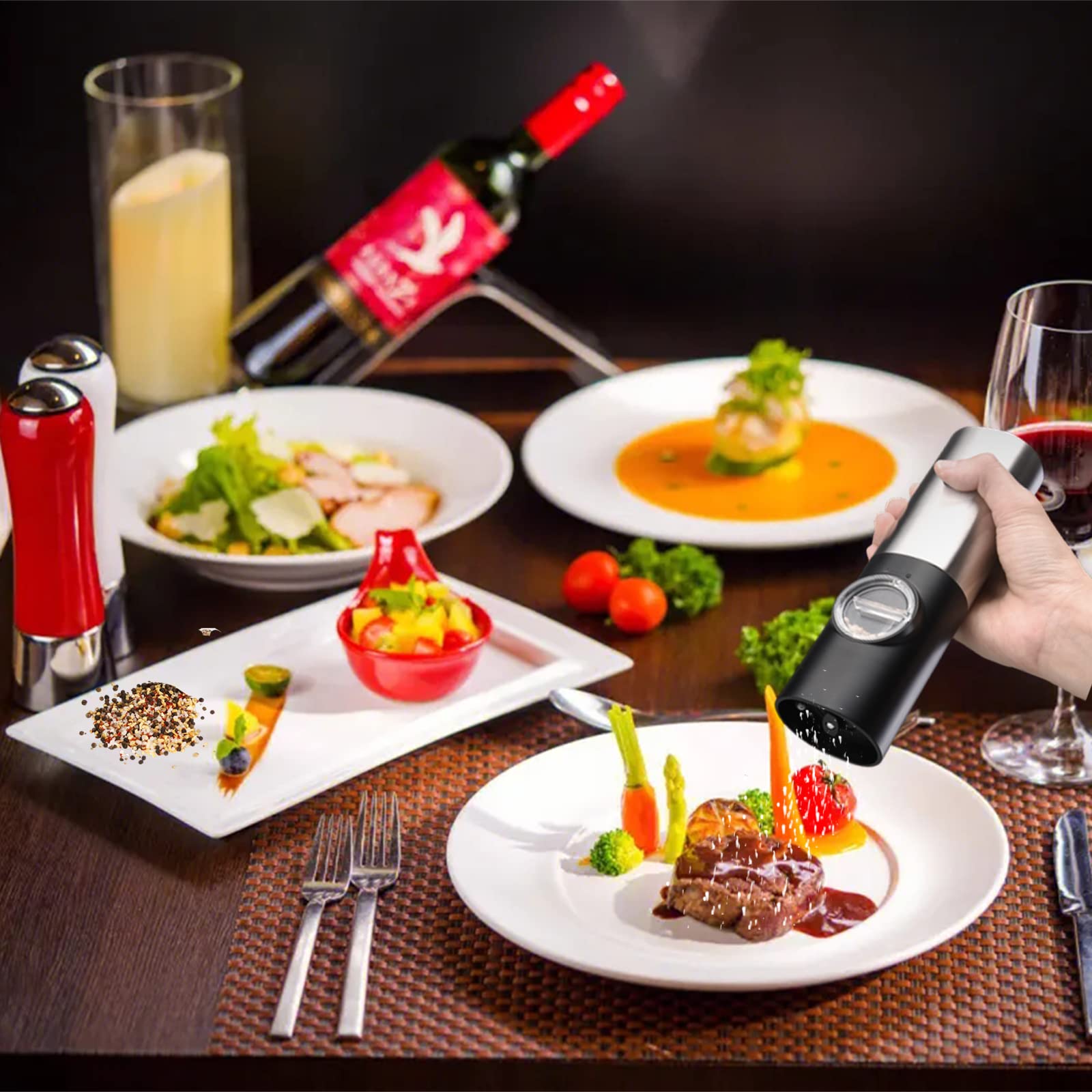 ["Battery operated. The electric grinder is powered by 4 AAA batteries (batteries not included) providing strong performance for the salt and pepper mill.","Adjustable grinding coarseness. Turn the knob manually to adjust the grinding thickness to meet the different tastes of the family. Ceramic grinding core, high hardness, wear resistance, long service life.","Easy to use. The product is designed for easy one-handed operation, providing freshly ground spices at the touch of a button.","Electric salt and pepper mills set. One is used for grinding pepper, one for grinding salt, and a set solves the problem of grinding spices.","Transparent cover + large capacity. Rotary knob silo cover design, easy addition of spices. 70 ml capacity, transparent cover, the installed capacity of pepper and salt is clearly visible.","Storage base. Storage base for easy placement and storage.","Reliable after-sales service. We attach great importance to providing high-quality products and services. If there is a problem with our pepper mill during use, please feel free to contact us. We will do our best to solve these problems and provide a 30-day refund."]